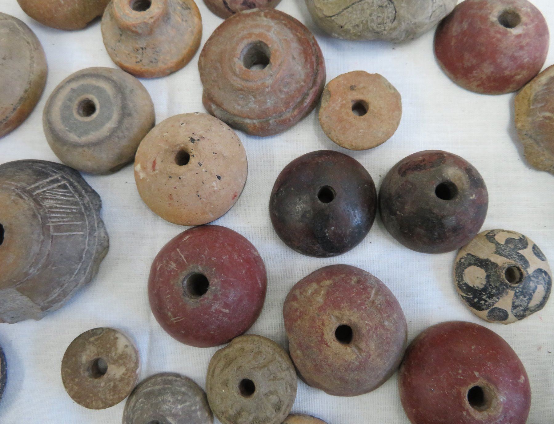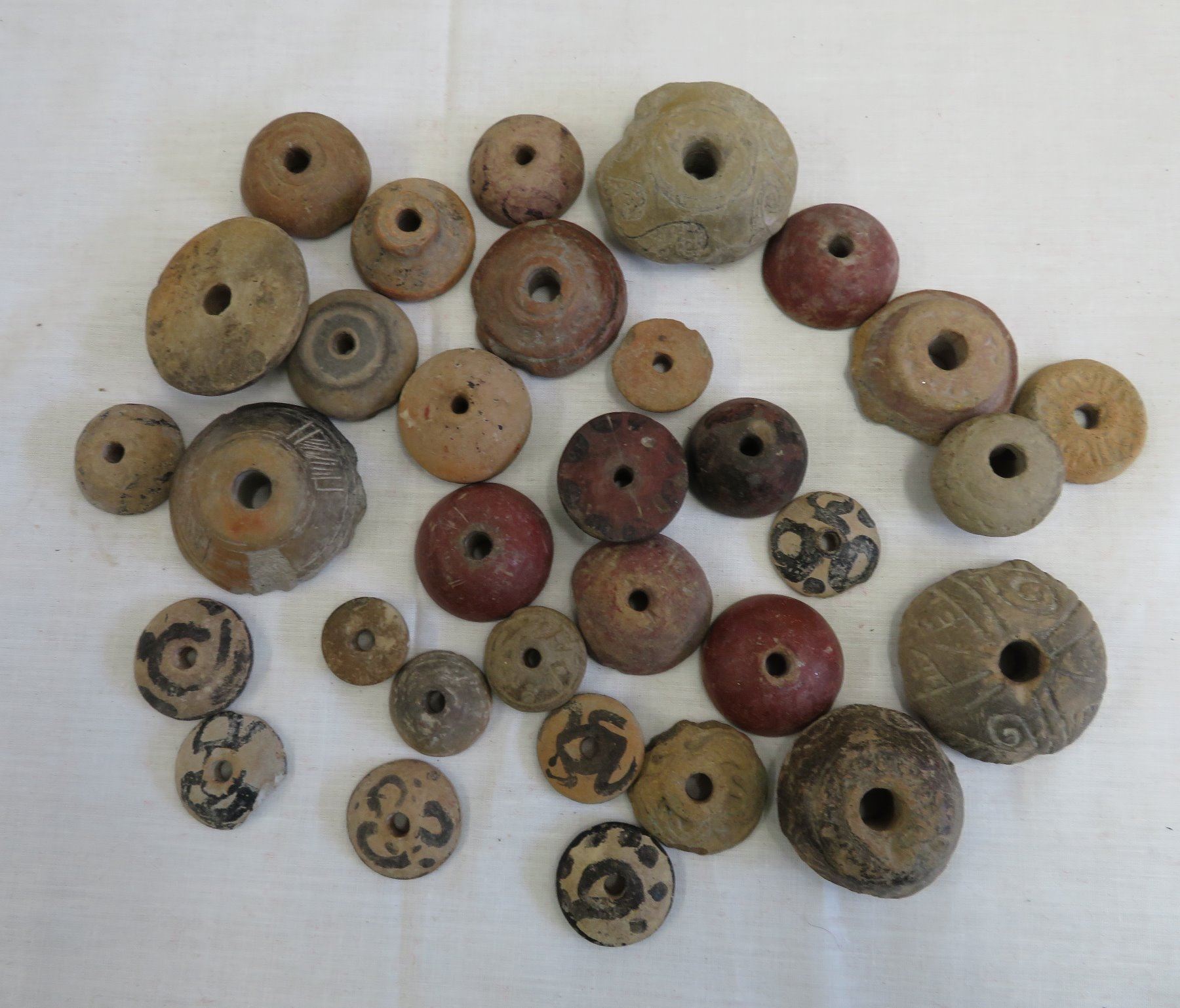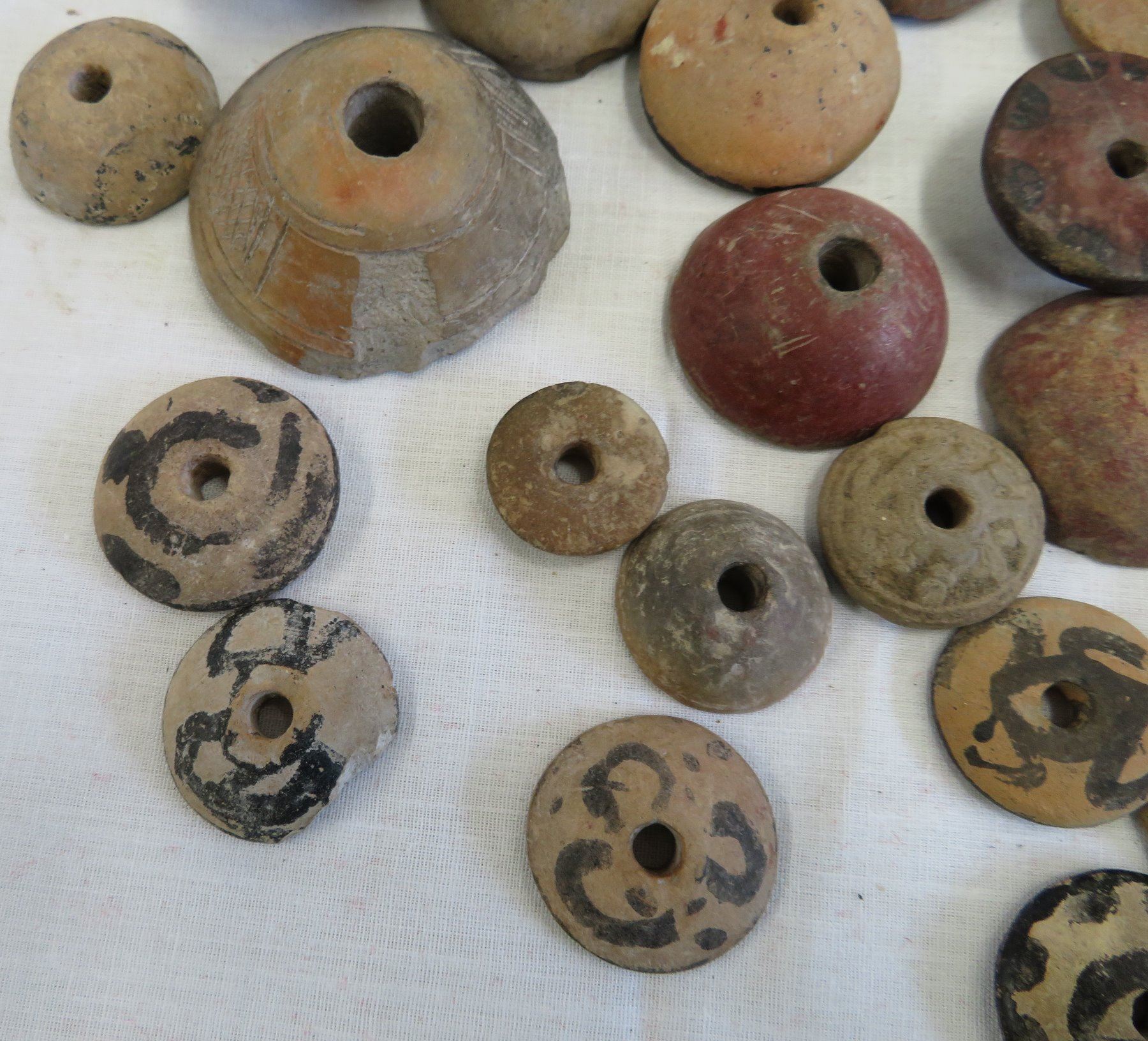 Pre-Columbian Spindle Whorl Collection, pre-Columbian items. Made of clay and paint, the items measure 1" to 2". Veracruz, Mexico. Condition: As found, see images. Shipping: $25.50 w/insurance and signature.
