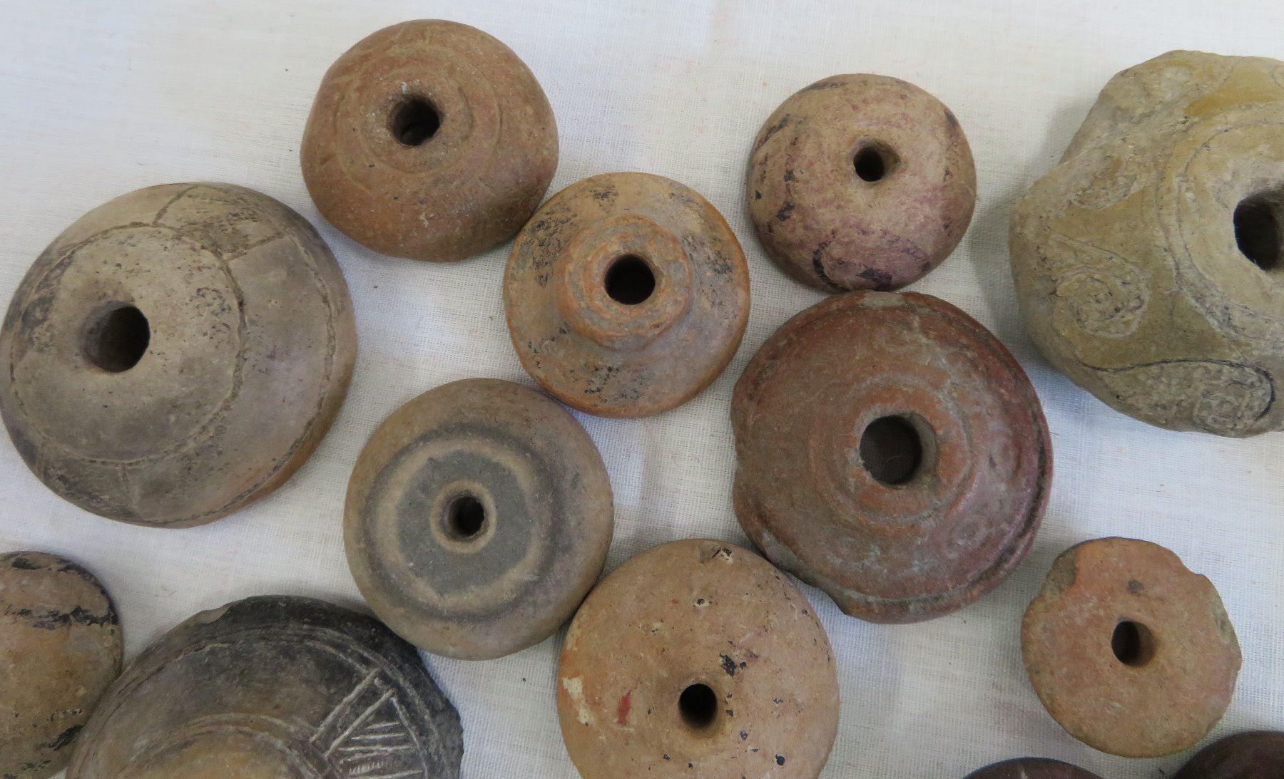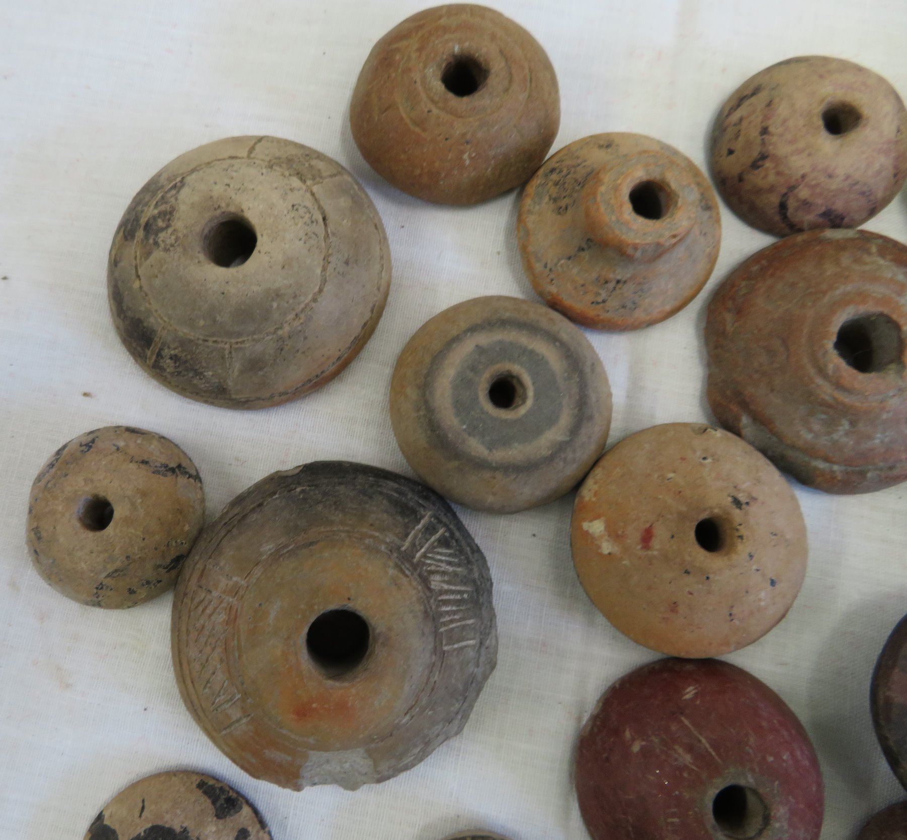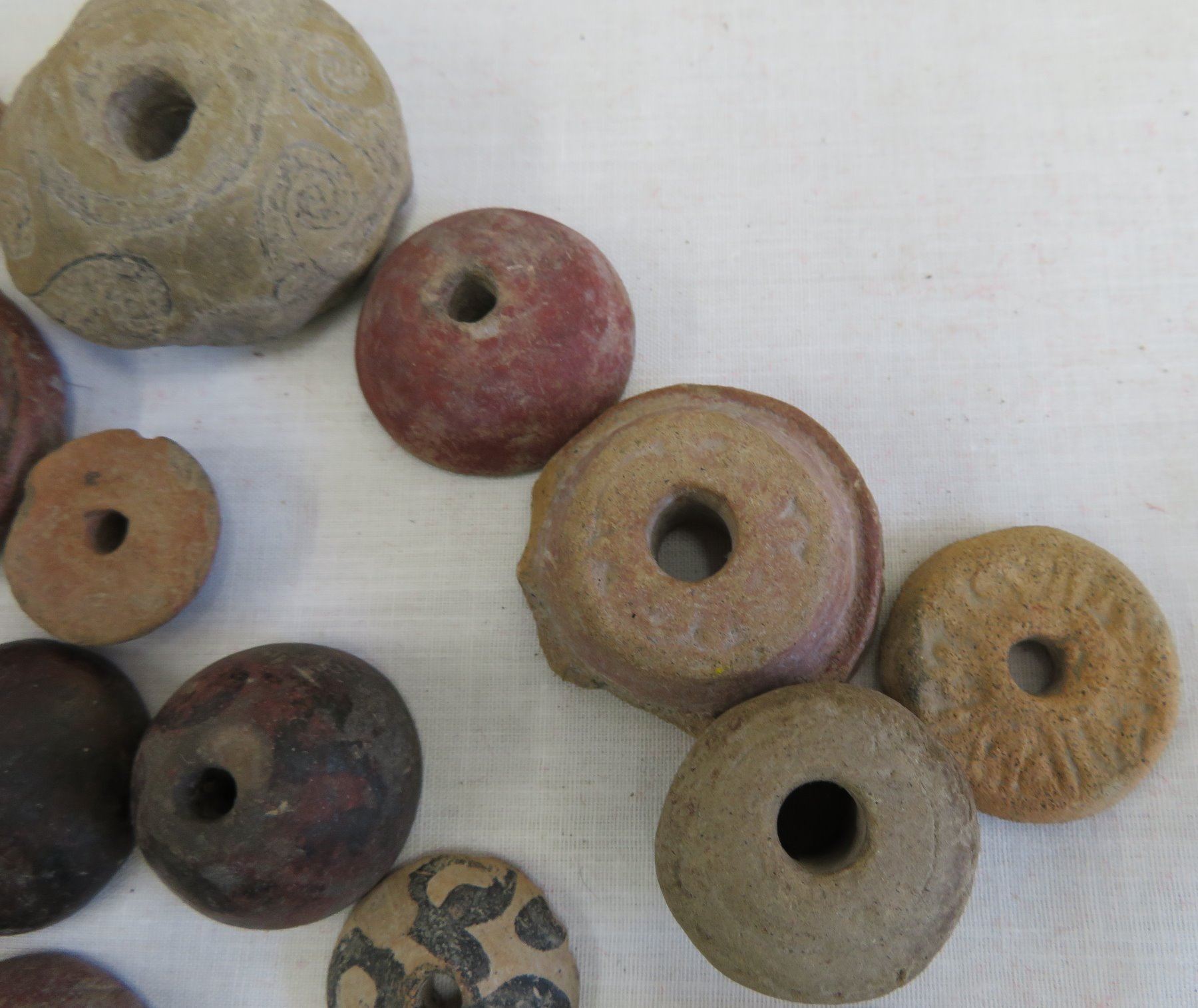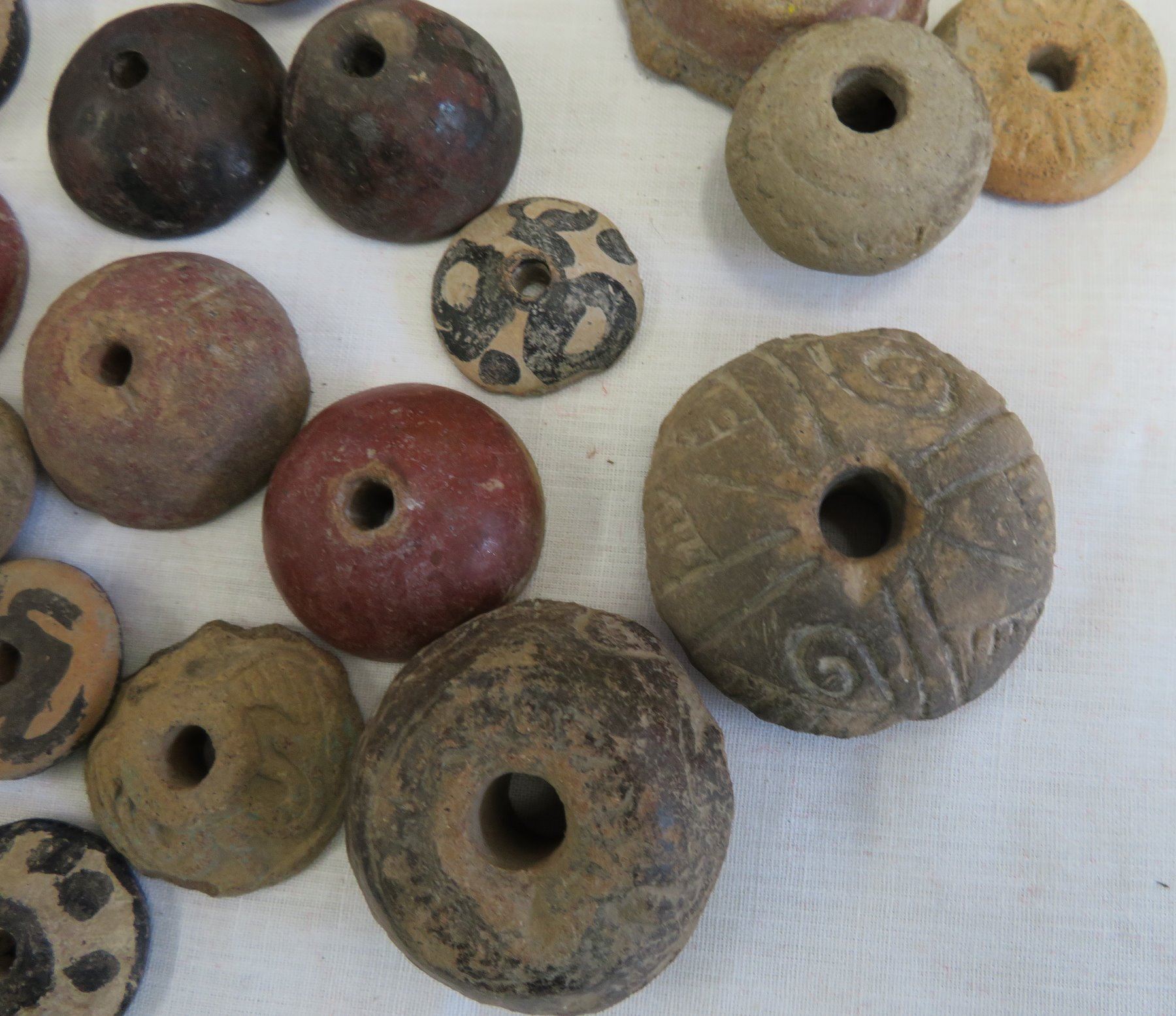 Pre-Columbian Spindle Whorl Collection, pre-Columbian items. Made of clay and paint, the items measure 1" to 2". Veracruz, Mexico. Condition: As found, see images. Shipping: $25.50 w/insurance and signature.