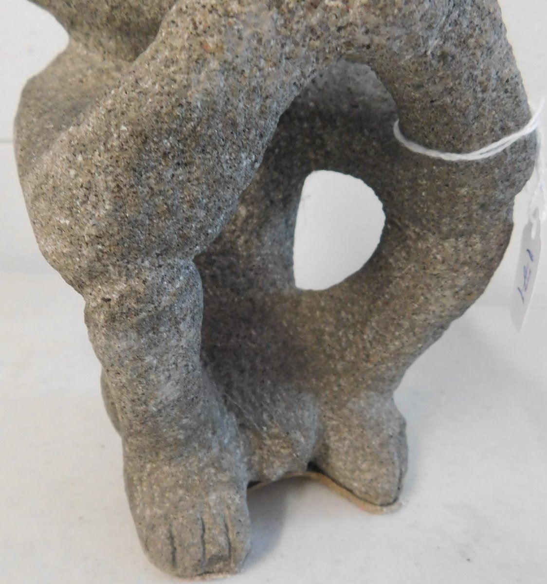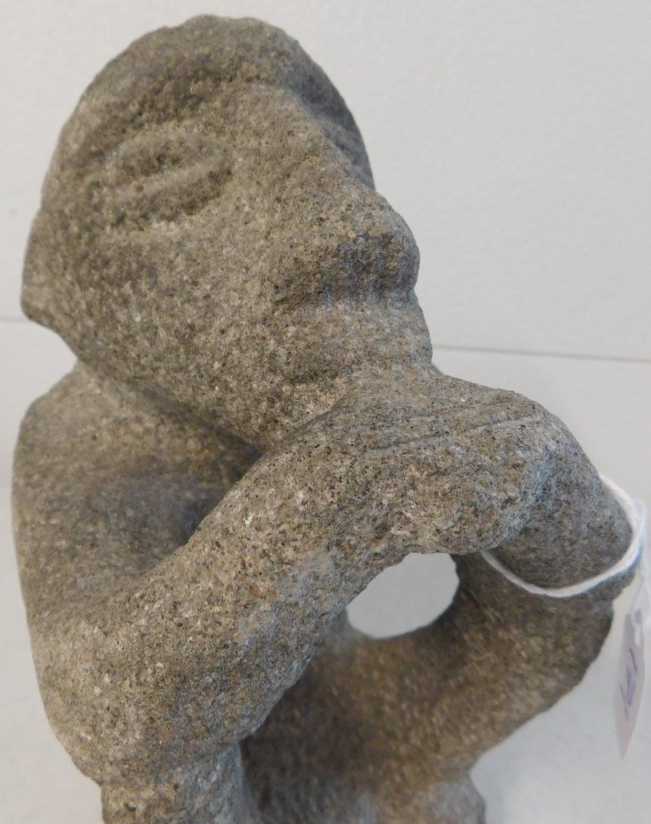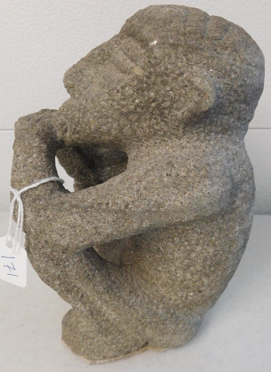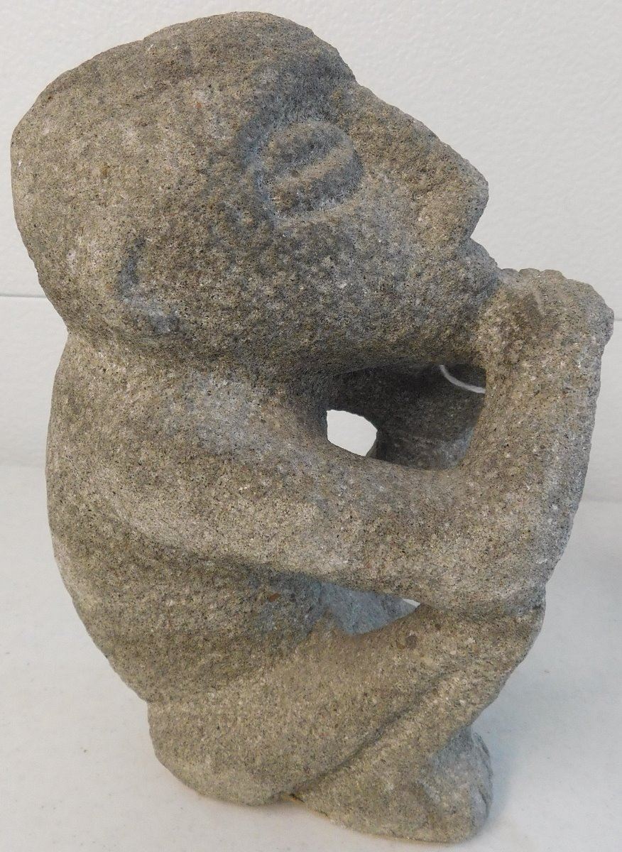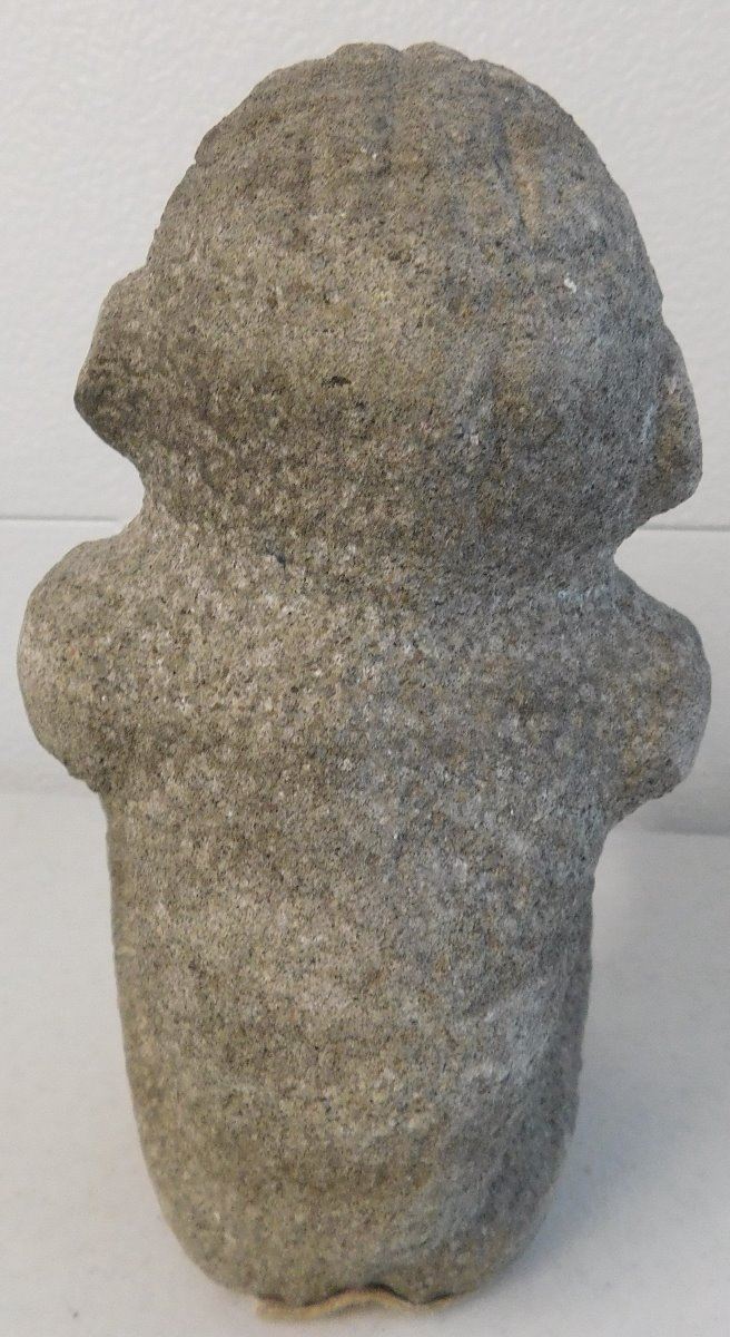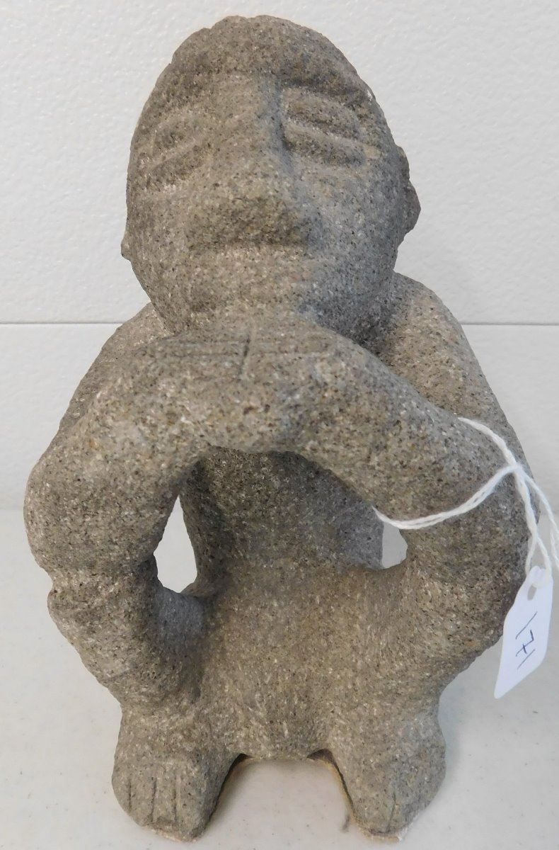 Pre-Columbian Stone Figure, circa 1500 years old. Made of basalt, the item measures 4.5" x 5" x 8". From Costa Rica. Believed to be smoking or sitting in a ritual position. Condition: Cloth glued on bottom, see images. Shipping: $27.50 w/insurance and signature, double-boxed.