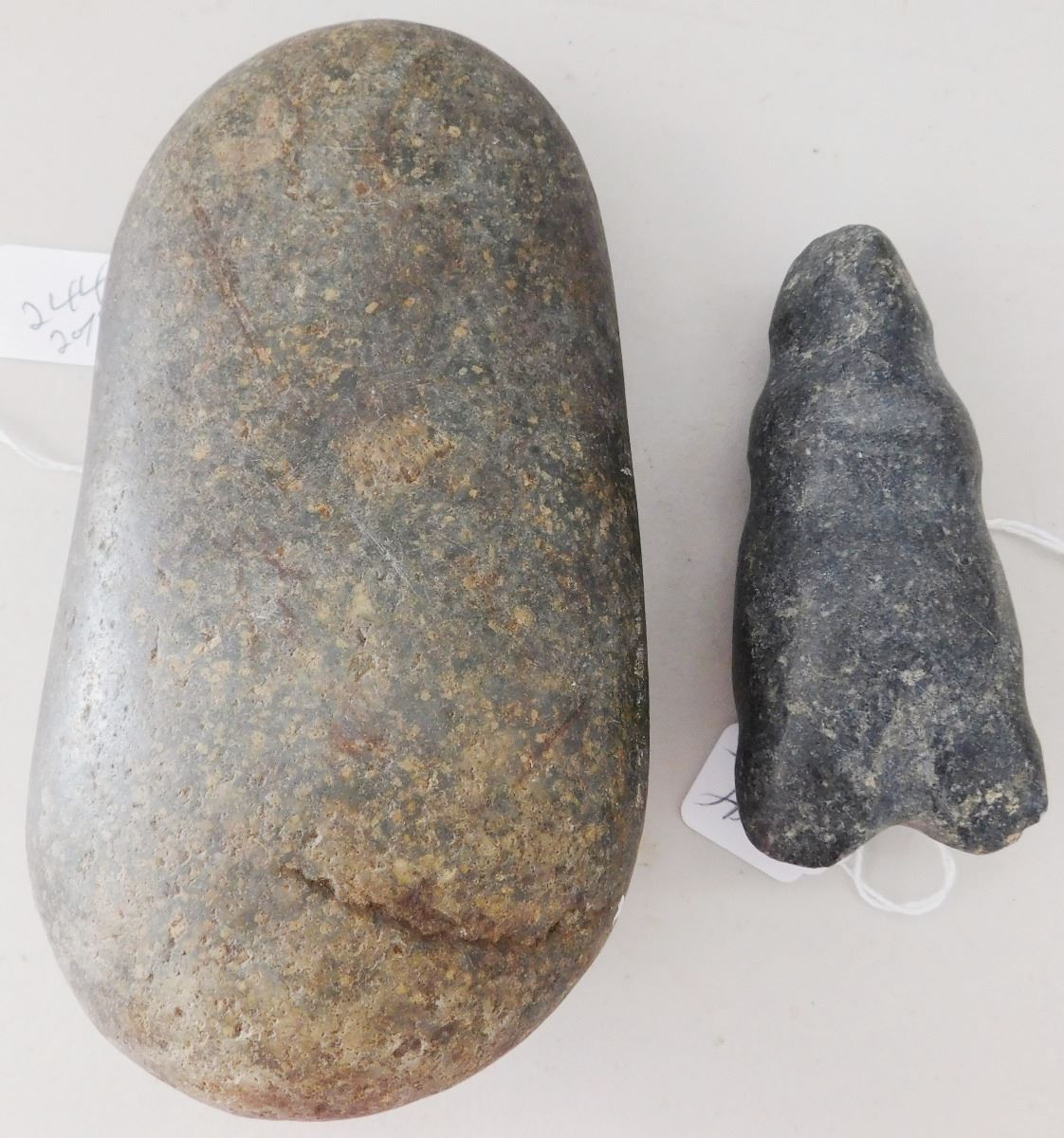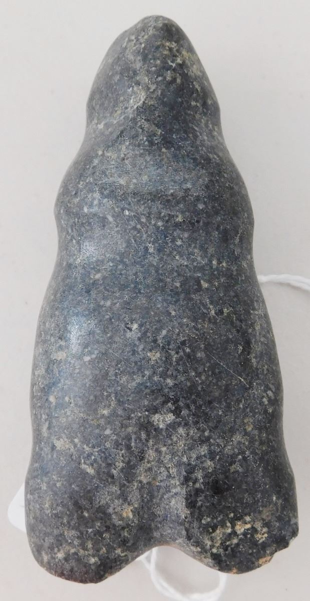 Pre-Columbian Stone Human Figure, circa 3000 years old. Made of basalt, the figure is 4" and the pestle is 6". From Guerrero, Mexico. Also included is the 7" pestle found along with the figure. Condition: Good, see images. Shipping: $28.00 w/insurance.