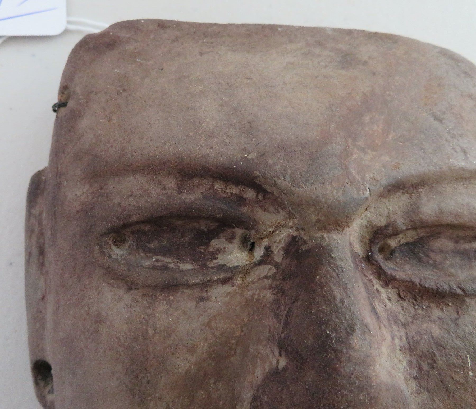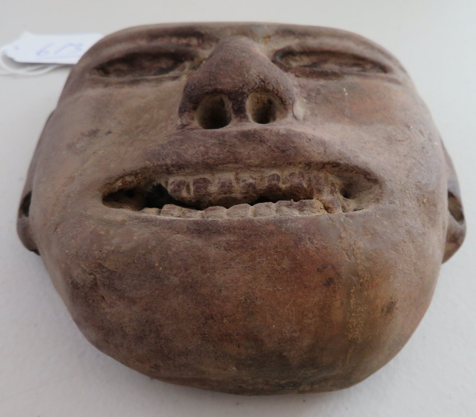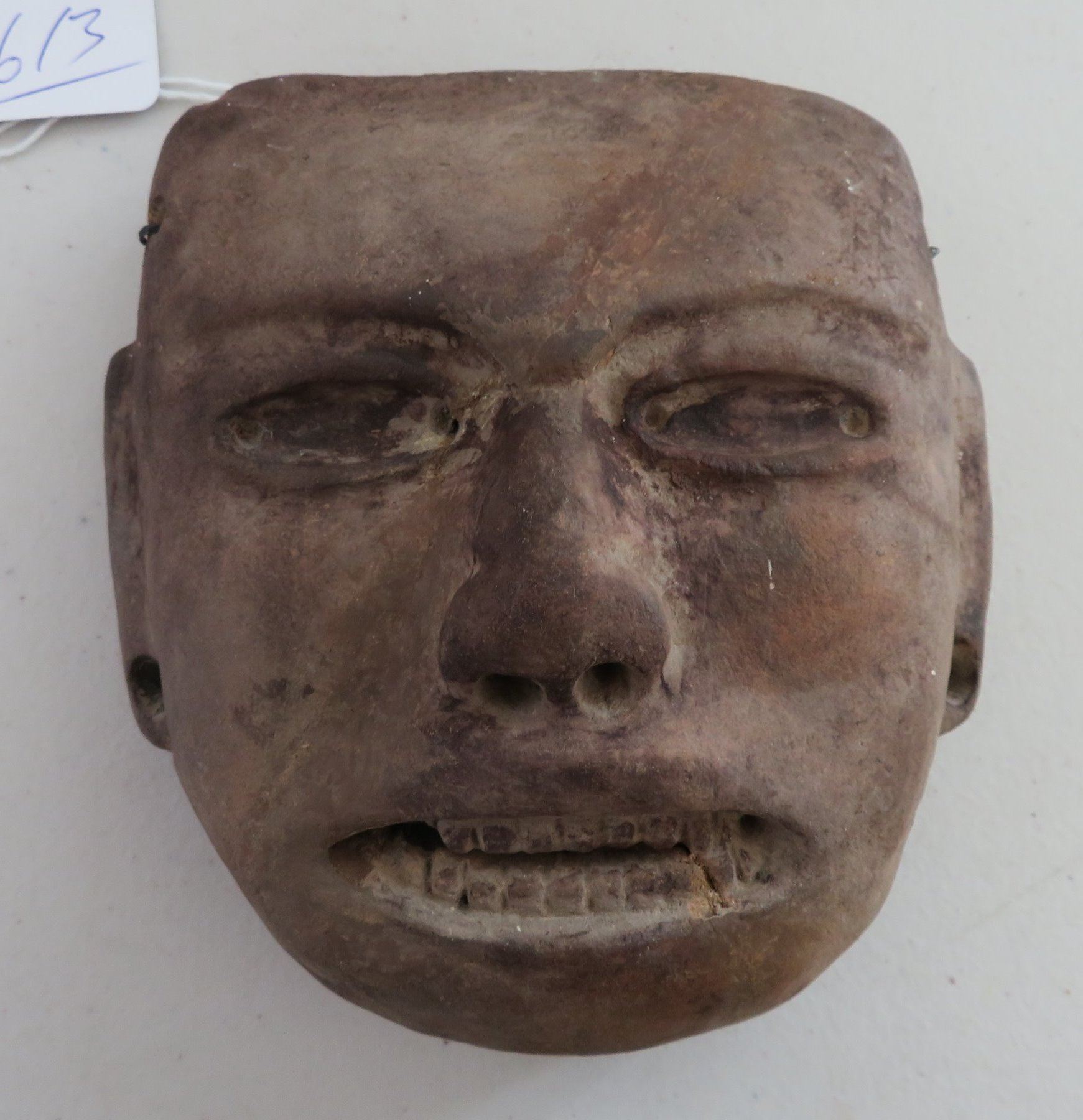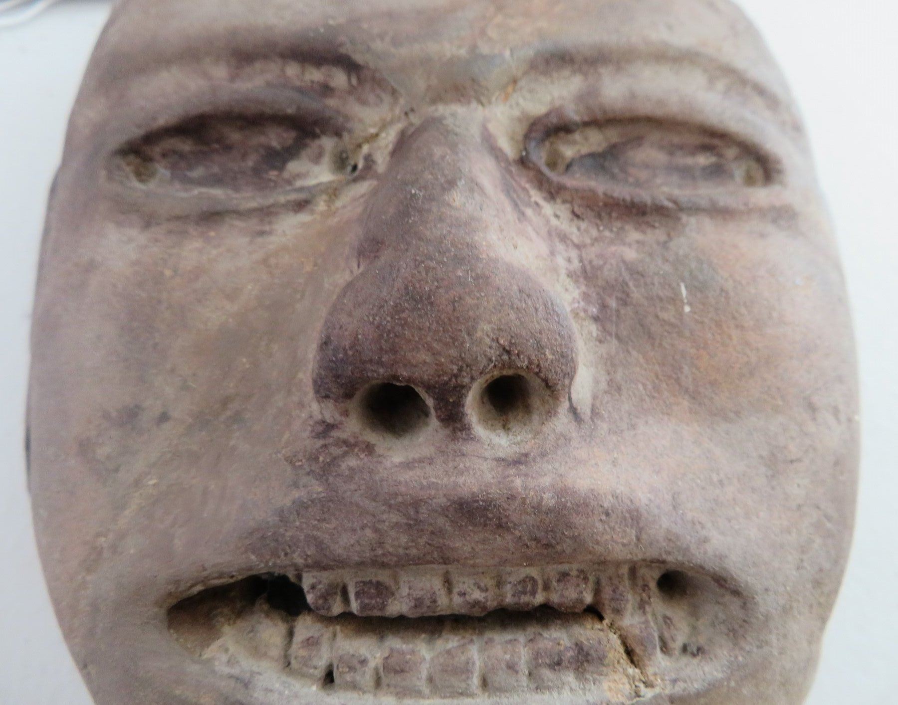 Pre-Columbian Stone Mask, pre-Columbian item. Made of sandstone, the item measures 6" x 5" x 3". Guerrero, Mexico. Condition: Broken and glued, see images. Shipping: $28.50 w/insurance and signature, due to value.