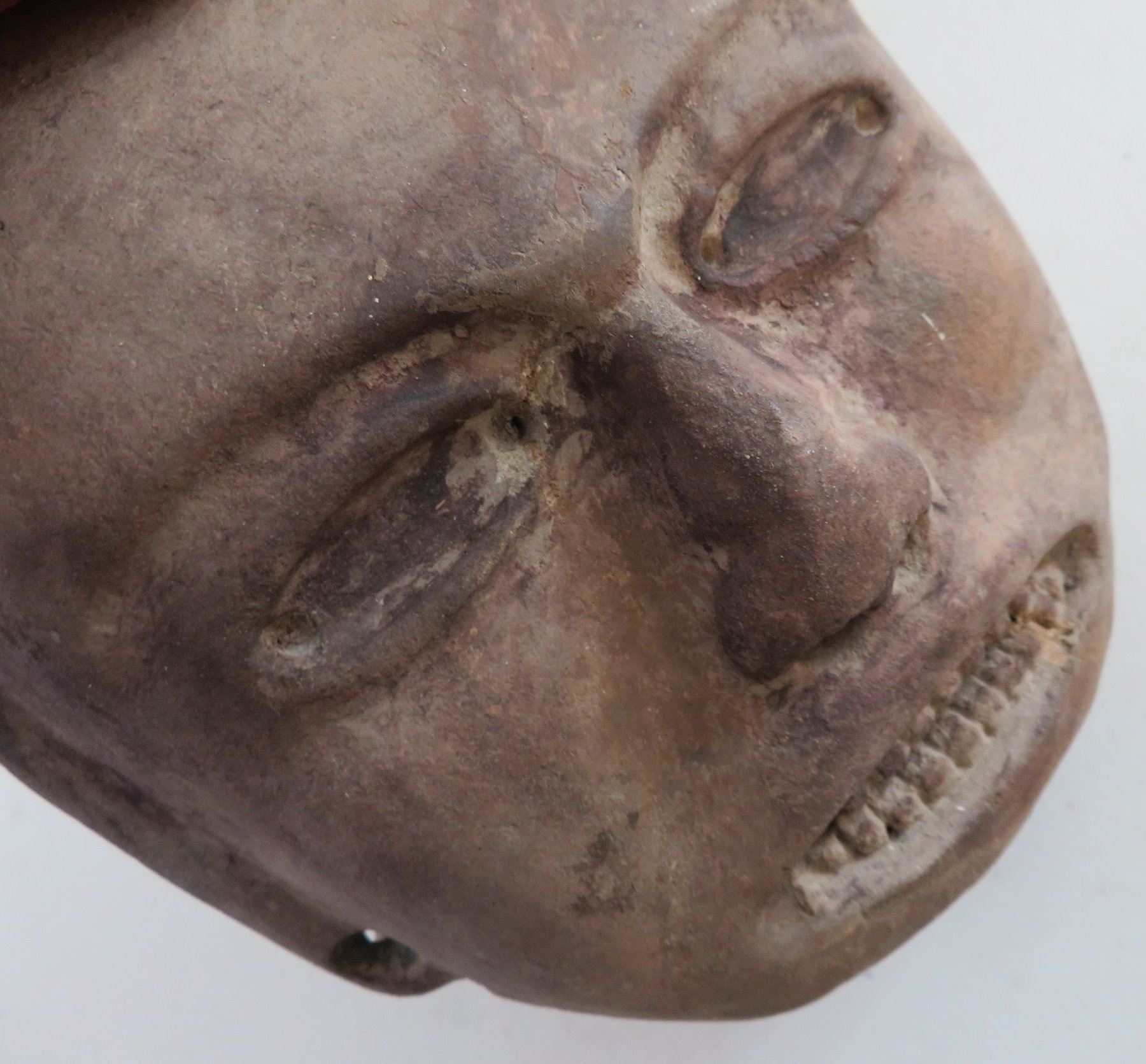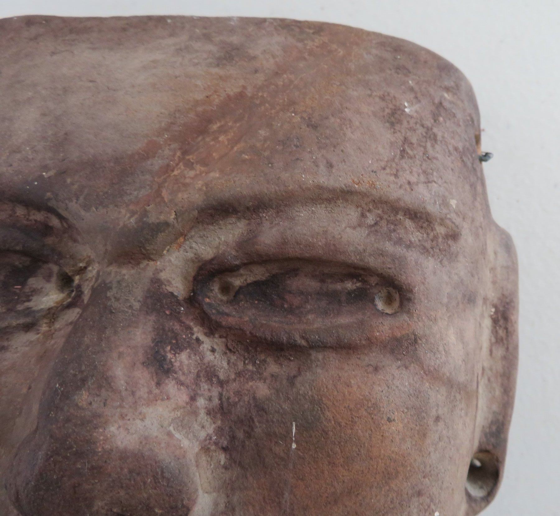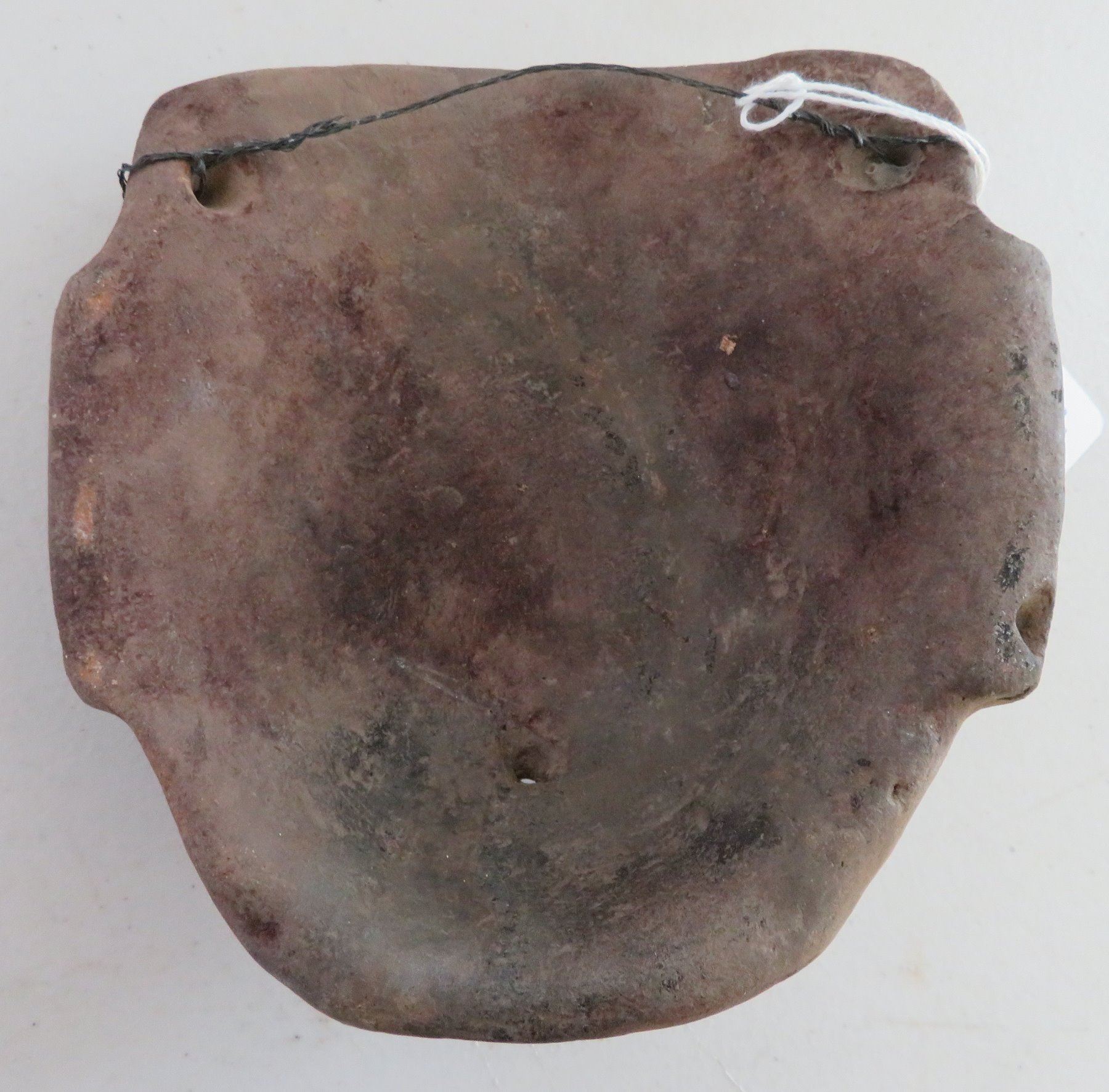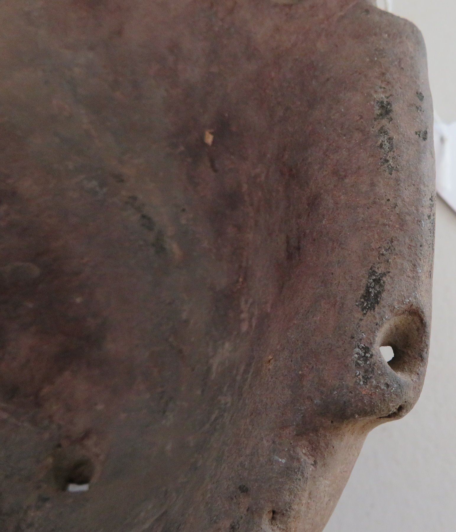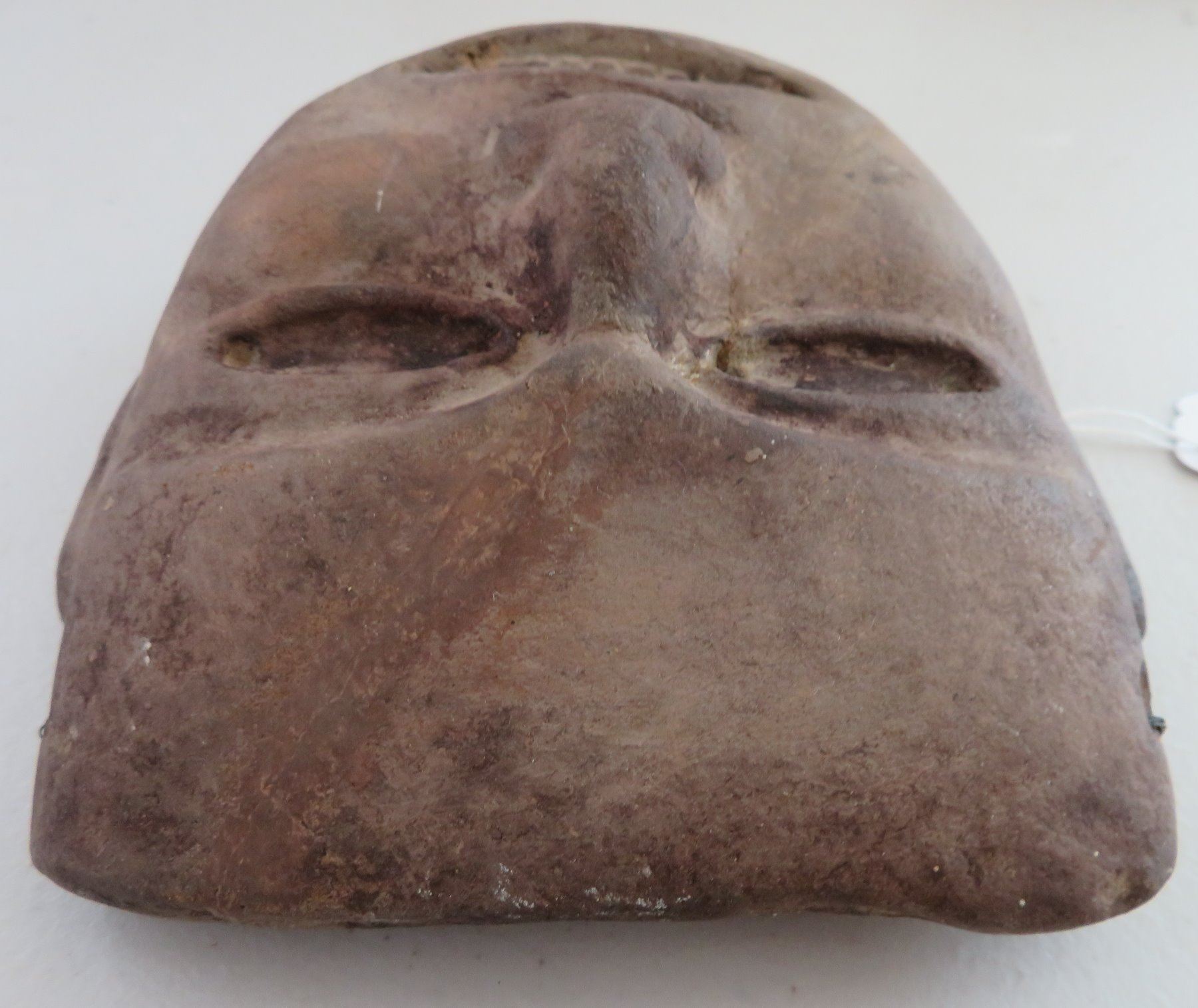 Pre-Columbian Stone Mask, pre-Columbian item. Made of sandstone, the item measures 6" x 5" x 3". Guerrero, Mexico. Condition: Broken and glued, see images. Shipping: $28.50 w/insurance and signature, due to value.