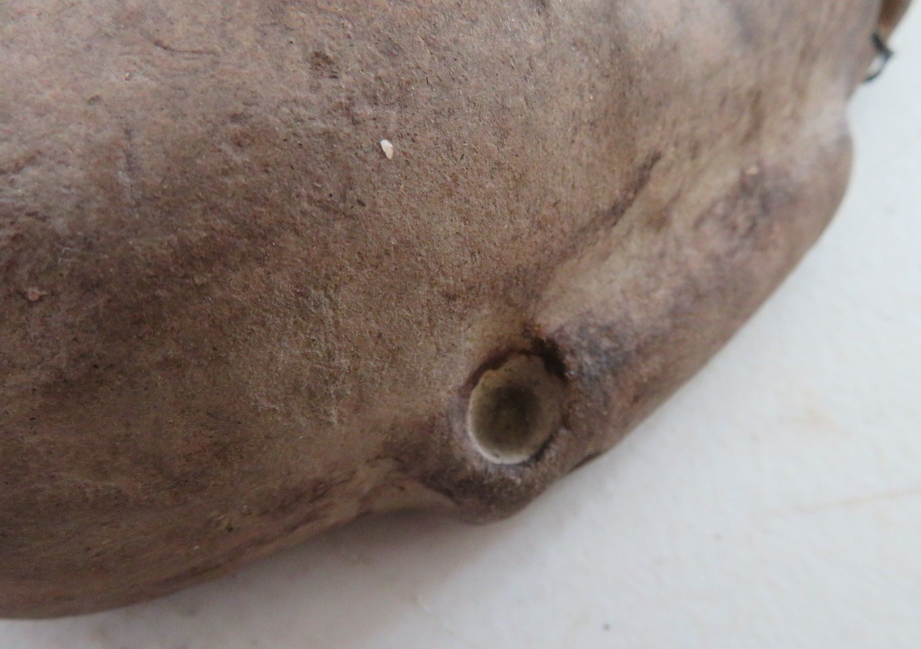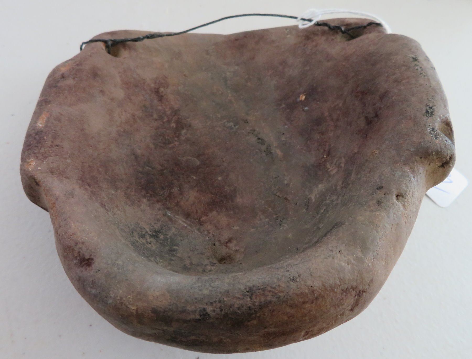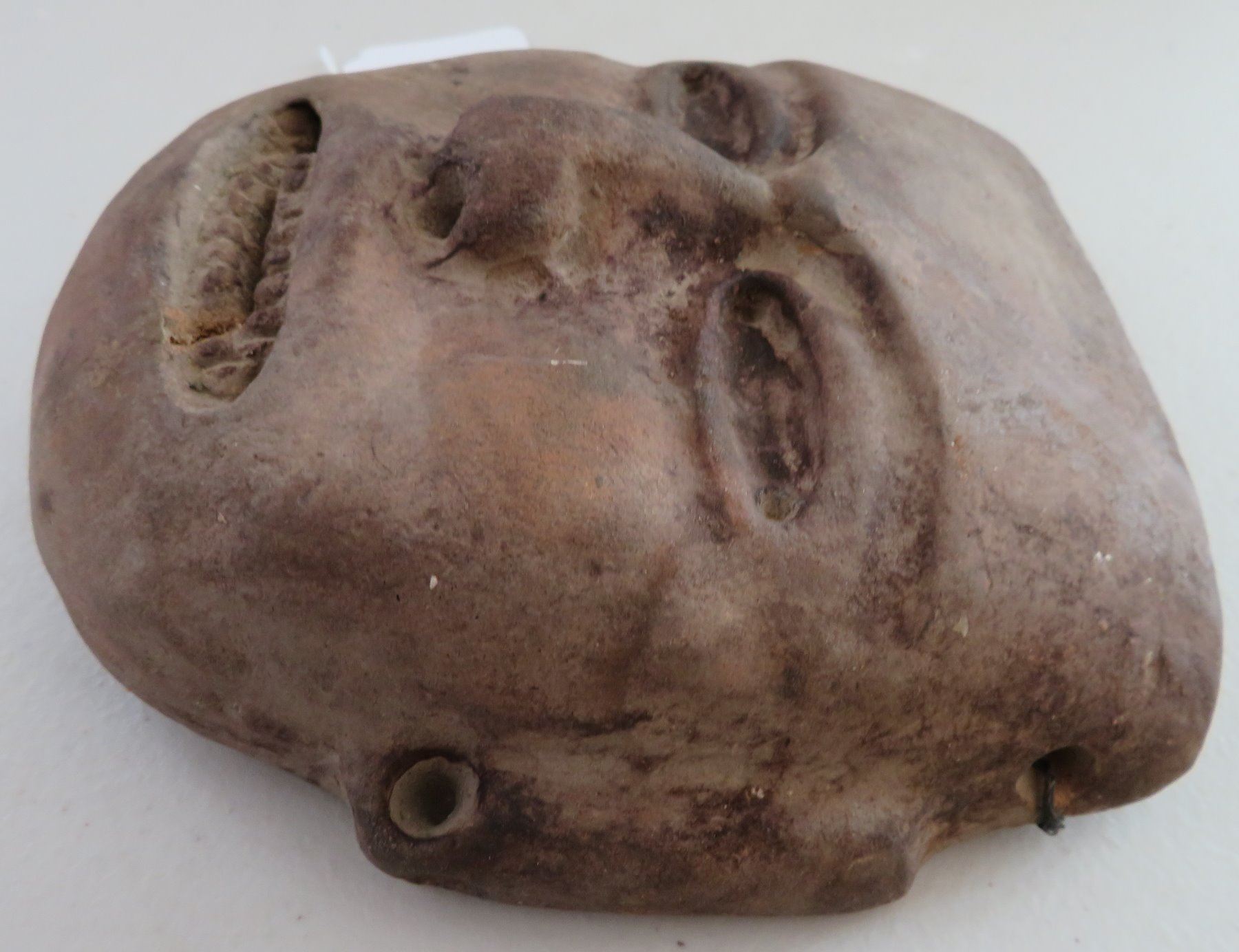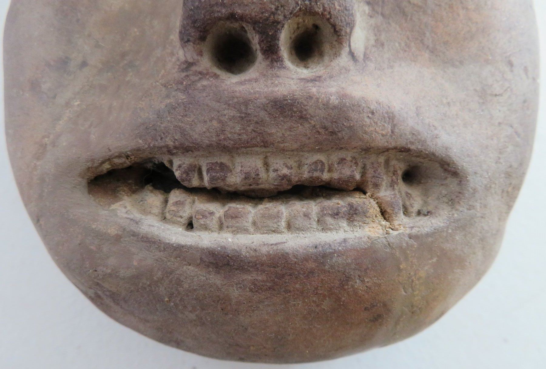 Pre-Columbian Stone Mask, pre-Columbian item. Made of sandstone, the item measures 6" x 5" x 3". Guerrero, Mexico. Condition: Broken and glued, see images. Shipping: $28.50 w/insurance and signature, due to value.
