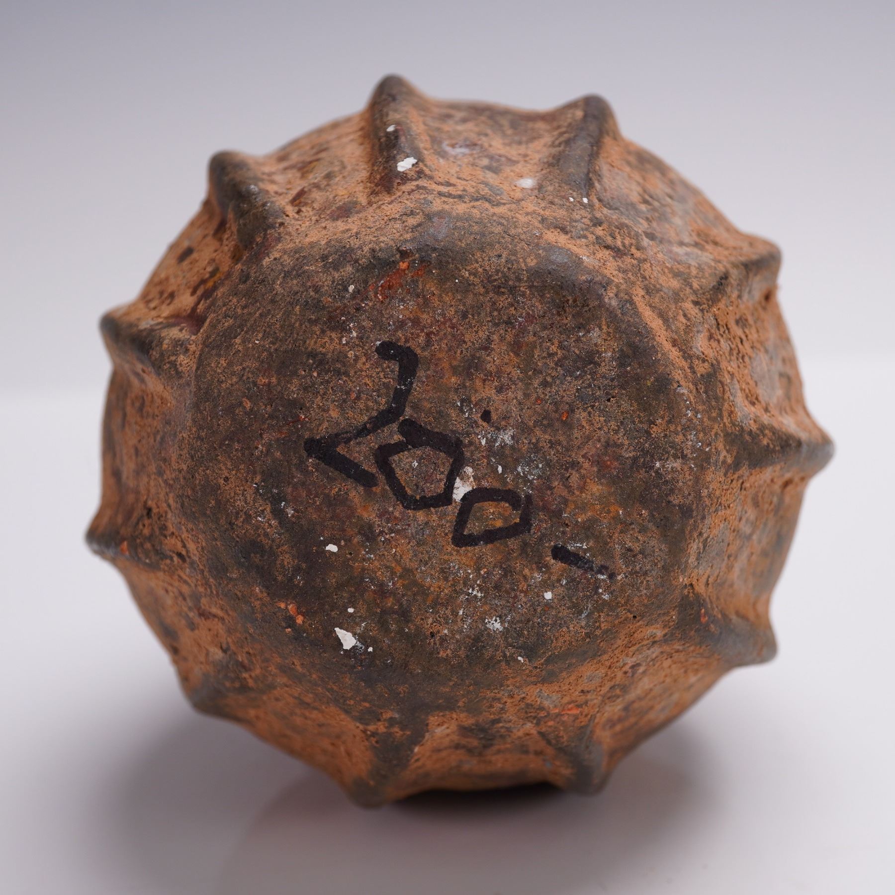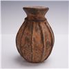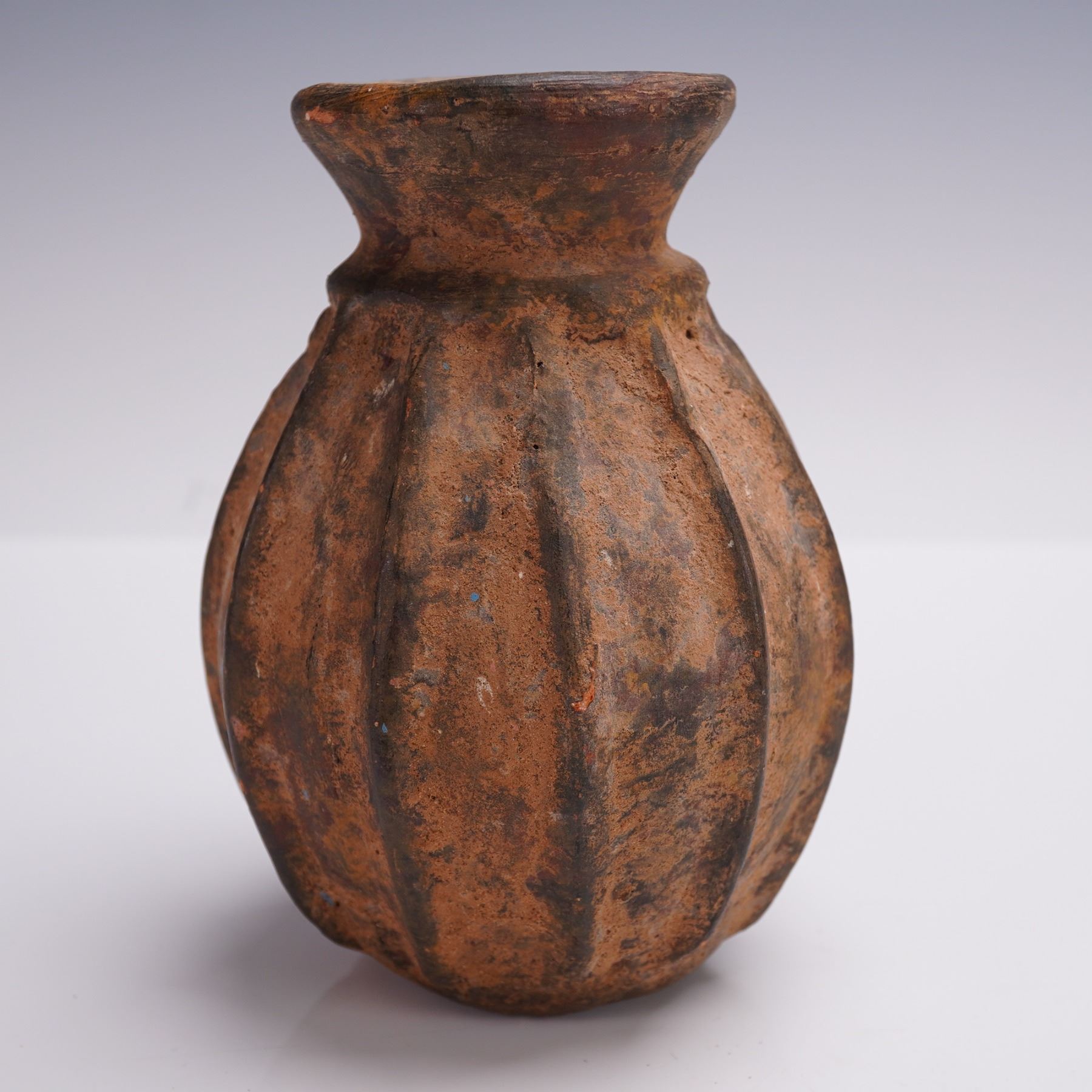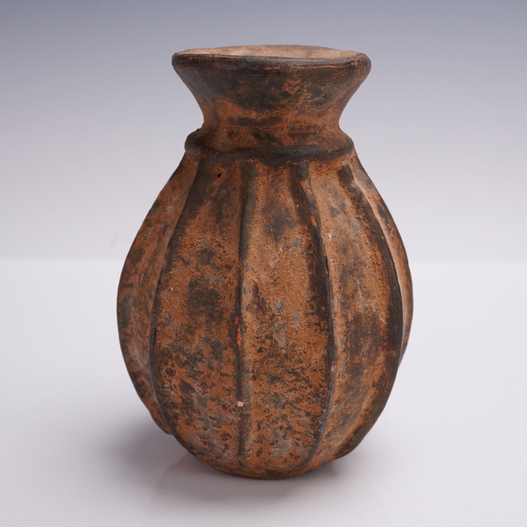 A striking Pre-Columbian carved terracotta jar featuring a deeply ridged melon-form body and short flared neck, its surface covered in a rich earthen patina of orange and black mineral deposits. This vessel is unadorned by painted decoration but exhibits confident hand-forming and a timeworn texture suggestive of ritual or utilitarian function. Its compact, closed shape with narrow mouth may indicate it was used to store precious or hazardous substances, and it is quite possibly a poison jar, an intriguing and rare form with compelling anthropological interest.