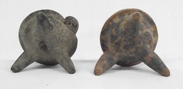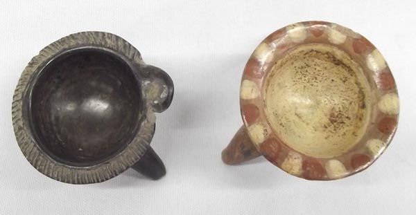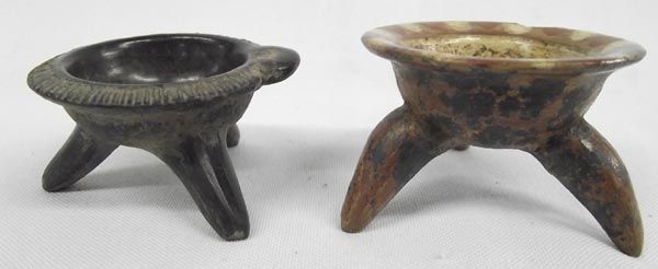 Pre-Columbian Style Pottery Miniatures, 2 Pieces.  One black pottery tripod paint bowl with incised decorations around the edge.  The second piece is a painted piece, tripod paint bowl in tan and cream.  Largest measures 1 1/2'' x 2 1/2'' wide.
