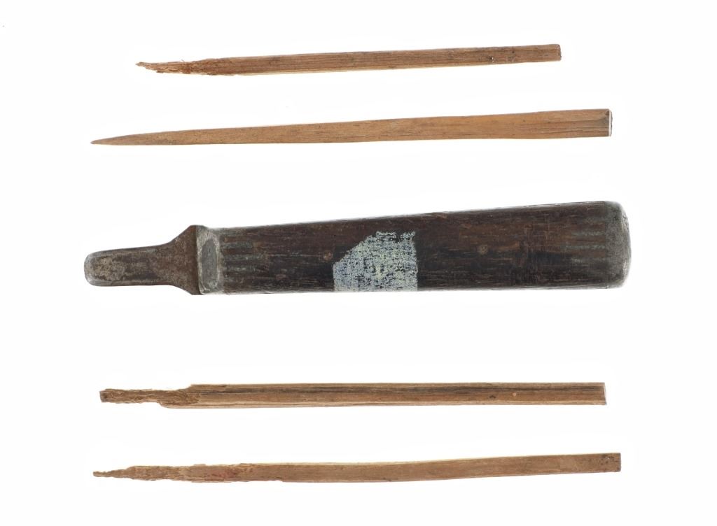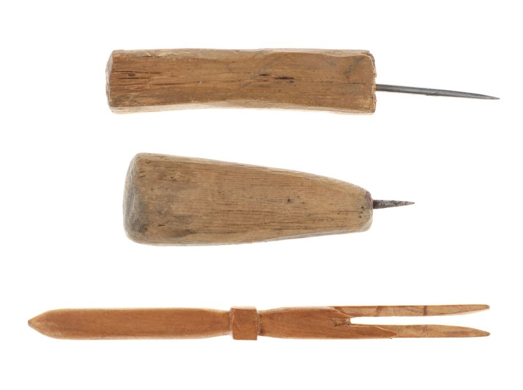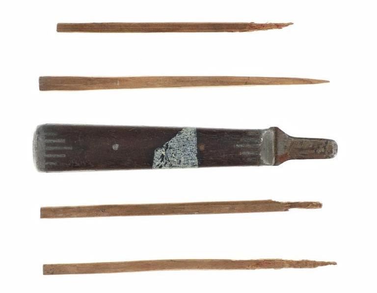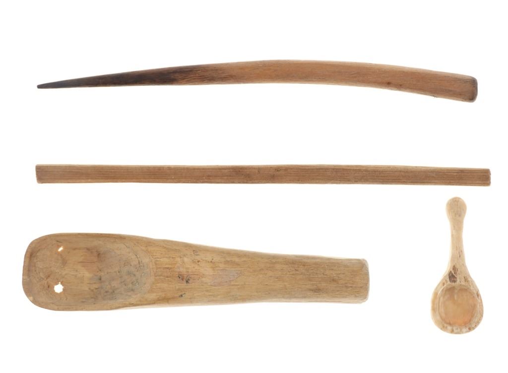 Featured in this lot is this Pre Columbian utensils, awls, and scraper collection. There are a total of 13 utensils in this collection including 9 wooden and sharpened spike awls with two spoons one bone and one wooden and shows a really nice traded tool scraper with a metal blade and the last item is a bone scapula made into a scraper. The condition of this collection is well preserved with some wear to the wood of the tools and some oxidation to the metal of the awls but otherwise is well preserved. The measurements of these tools range from 2" x 7/8" to 7 3/8" x 3 7/8". The collective weight of this collection of these utensils is 6oz.