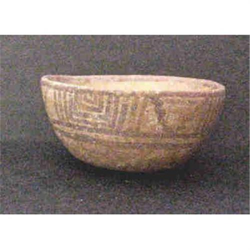 This small bowl has delicate geometric designs around the outside and rim. From a collection . You can feel the hand molding of the one who made it centuries ago. A nice example for any collection.