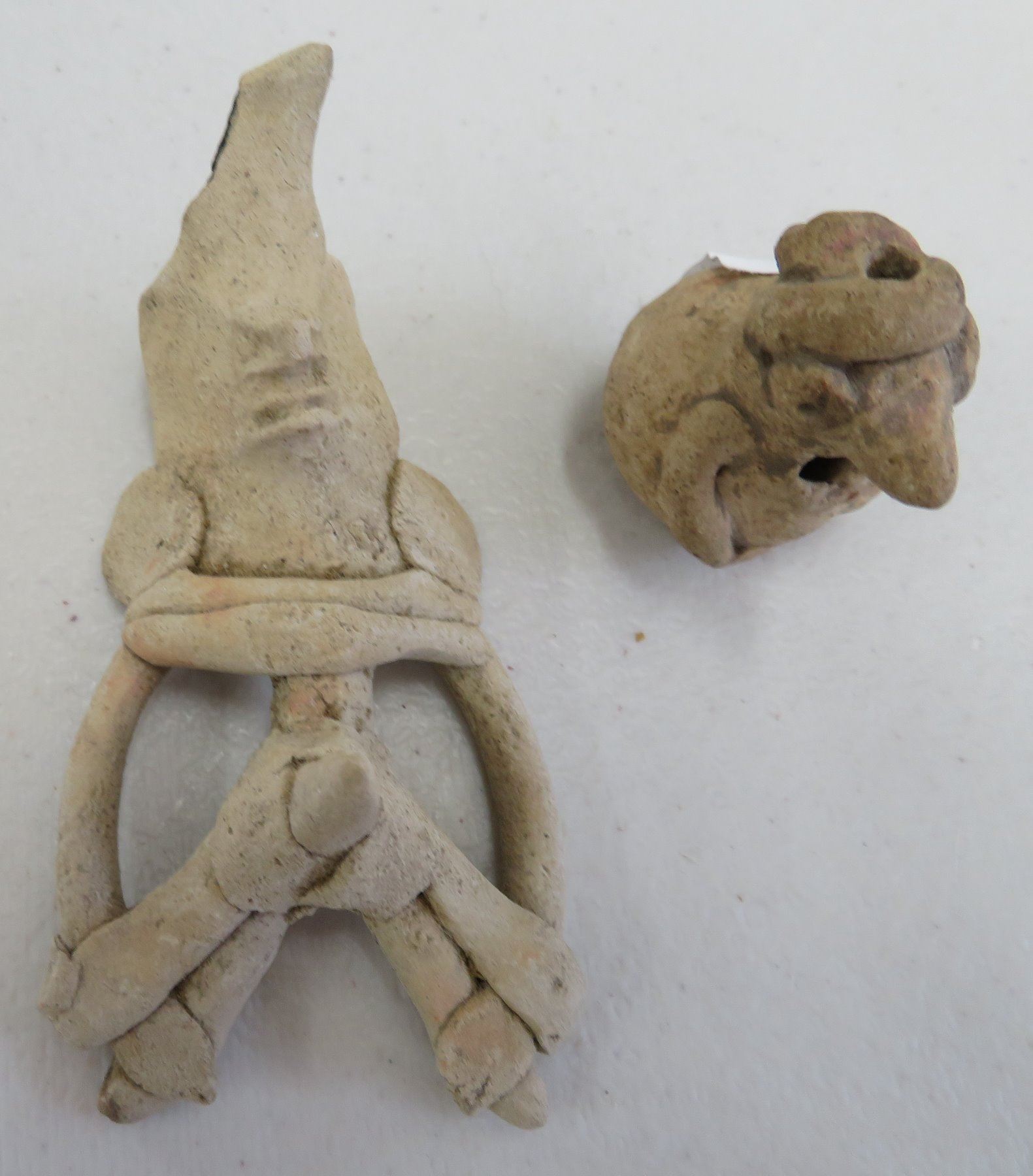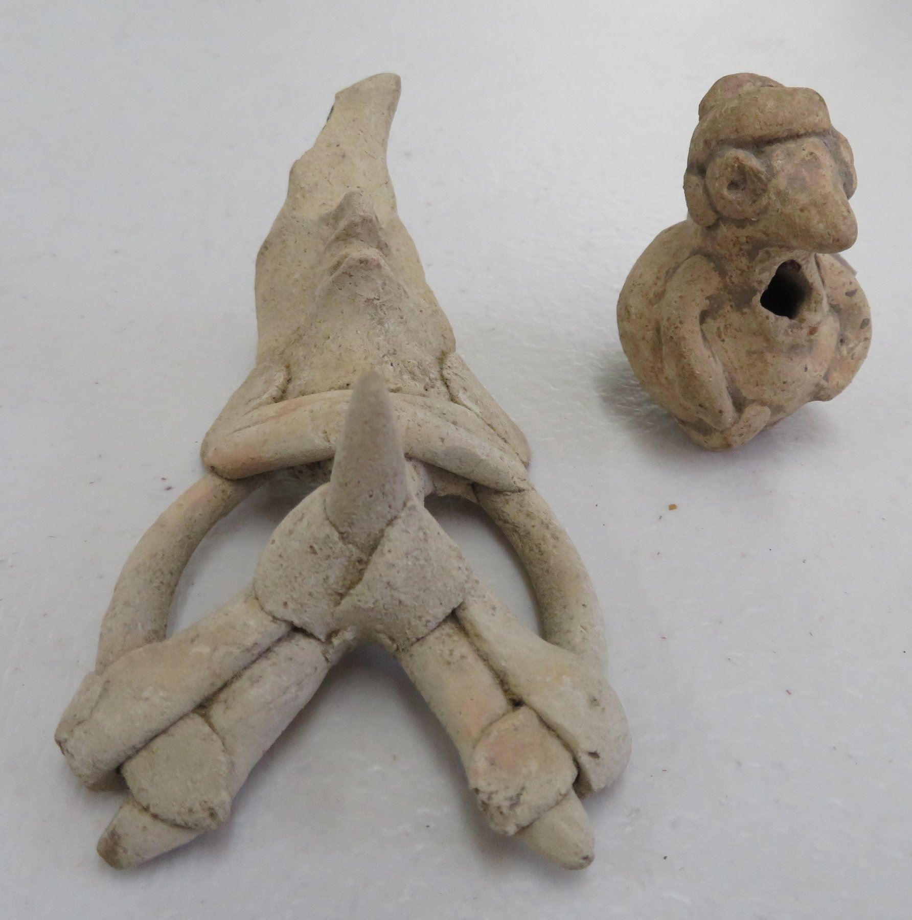 Pre-Columbian Whistle & Erotic Figure, pre-Columbian items. Made of clay, the erotic figure measures 4". Nayarit, Mexico. Bird whistle has a nice sound. Condition: Both minor damage, see images. Shipping: $17.50 w/insurance and signature.