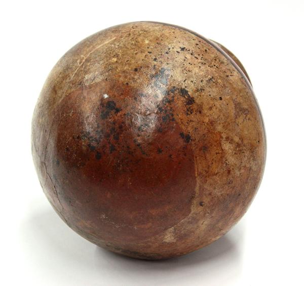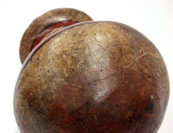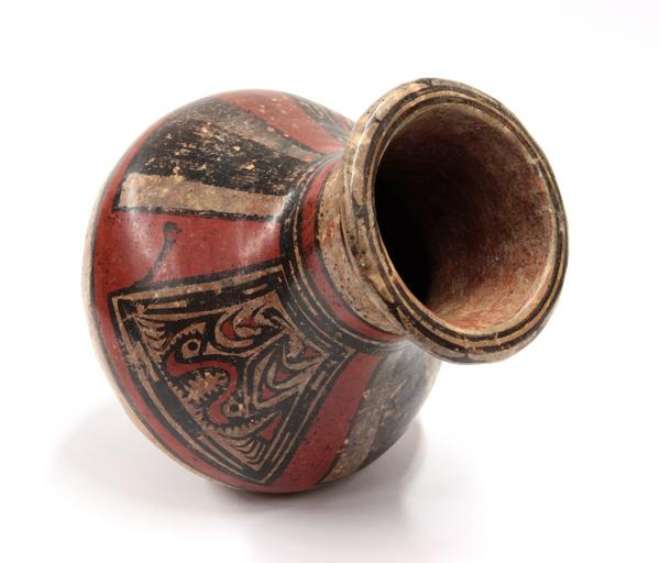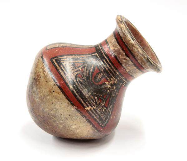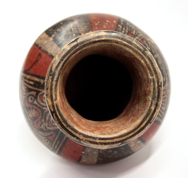 Pre Columbian olla, the polychrome decorated vessel having a tapering form with a geometric frieze from the neck to the bulbous waist, the rim decorated with banding, 10''h x 7.5''w