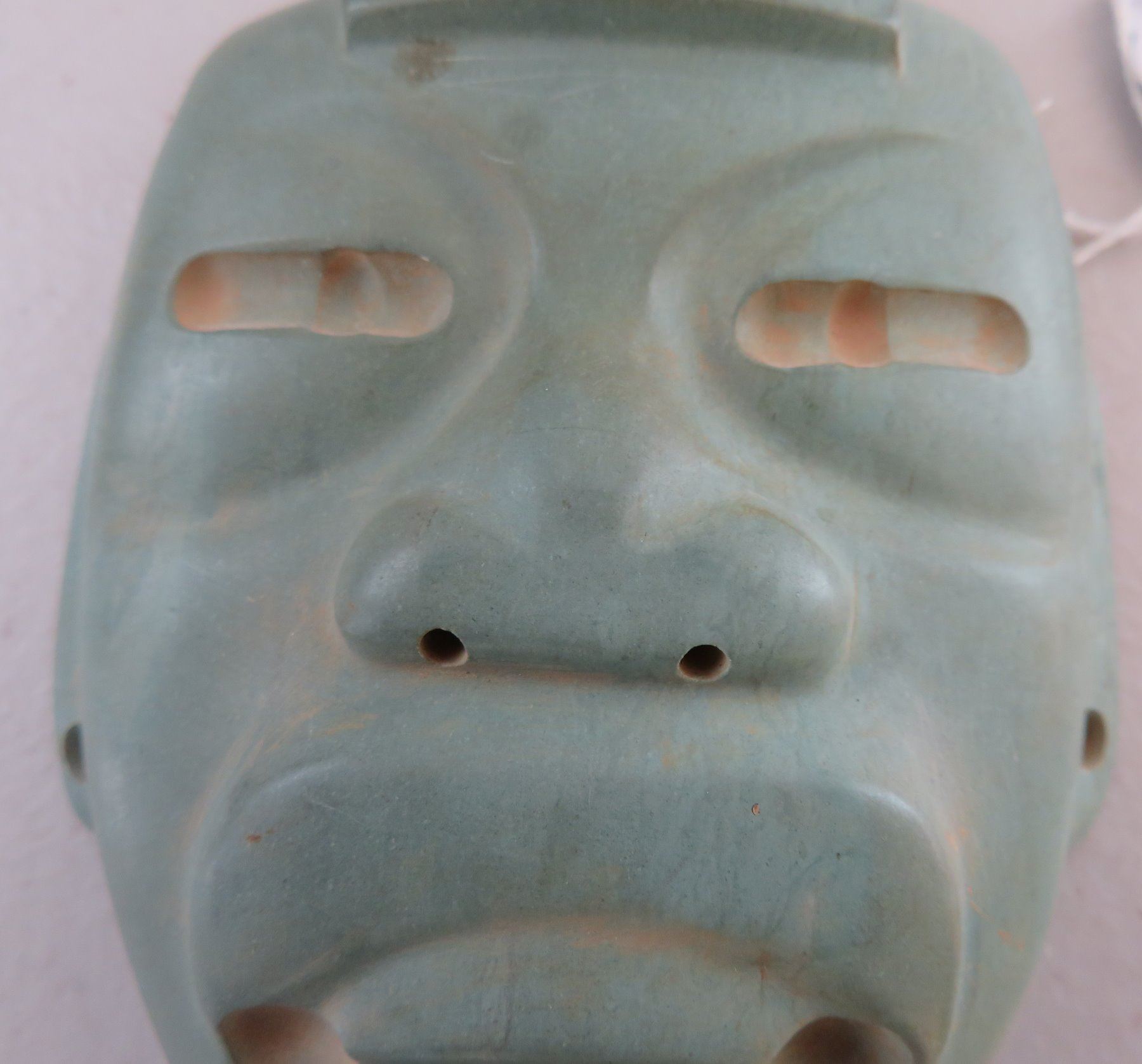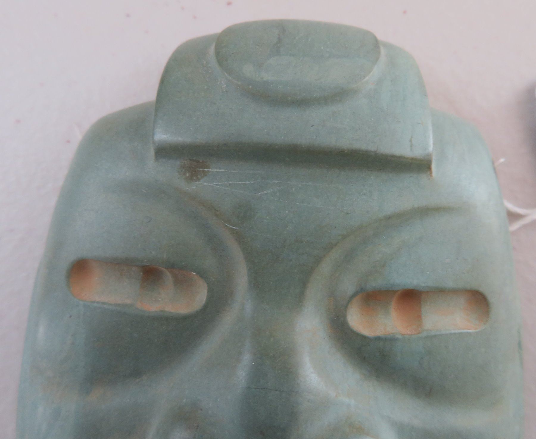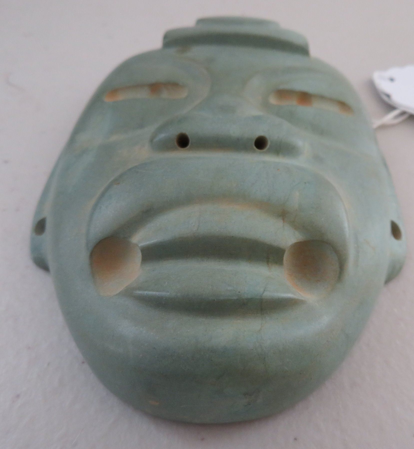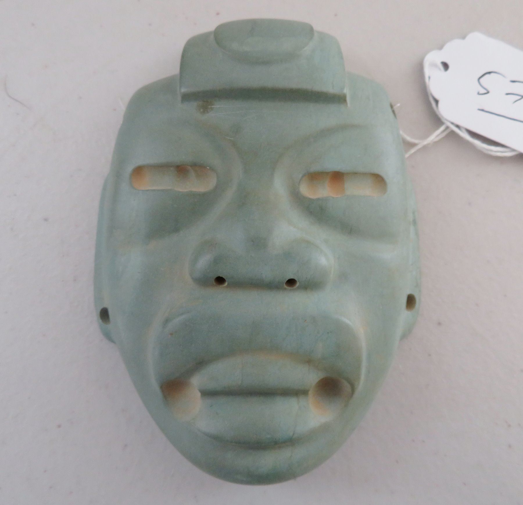 Pre-Columbian-style Mask, age unknown. Made of jadeite, the item measures 3 1/4" x 4 3/8". Condition: Good, see images. Shipping: $16.50 w/insurance and signature.