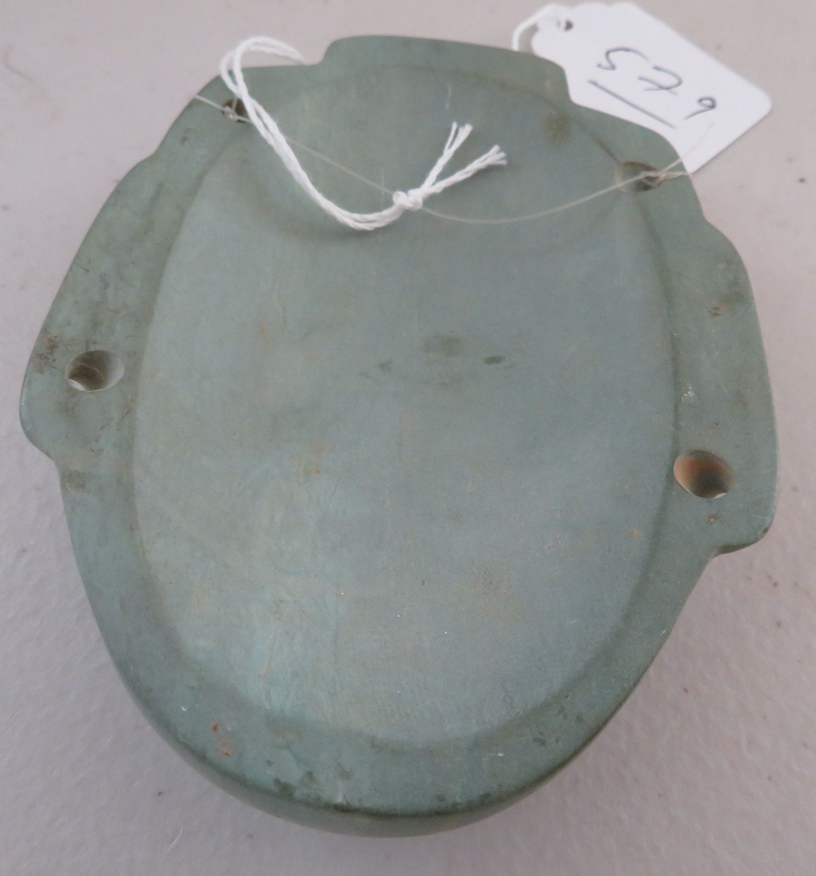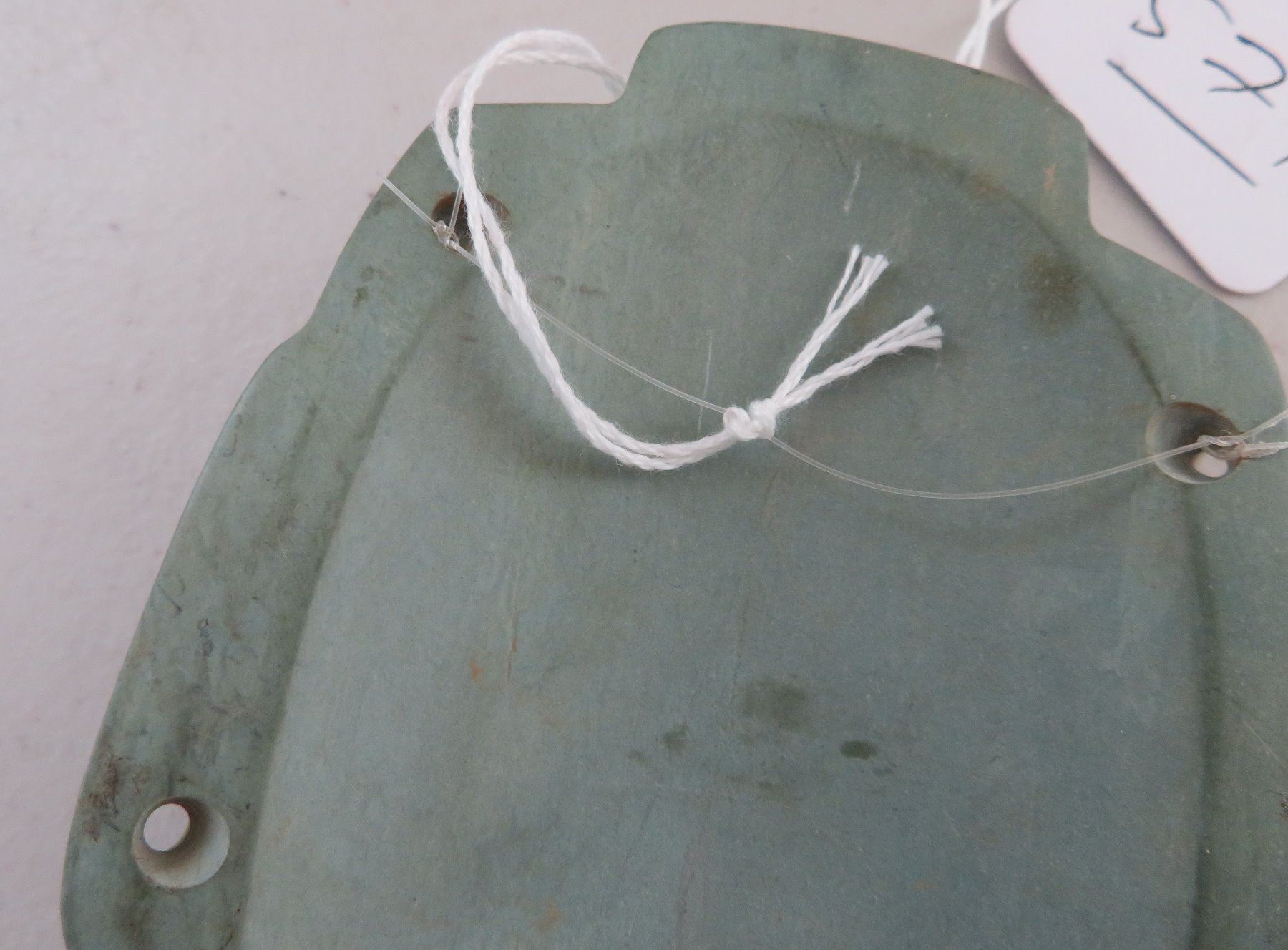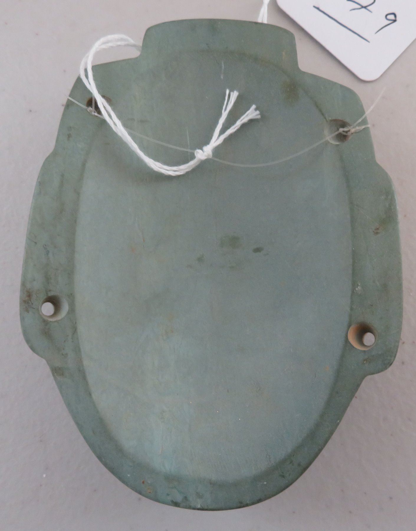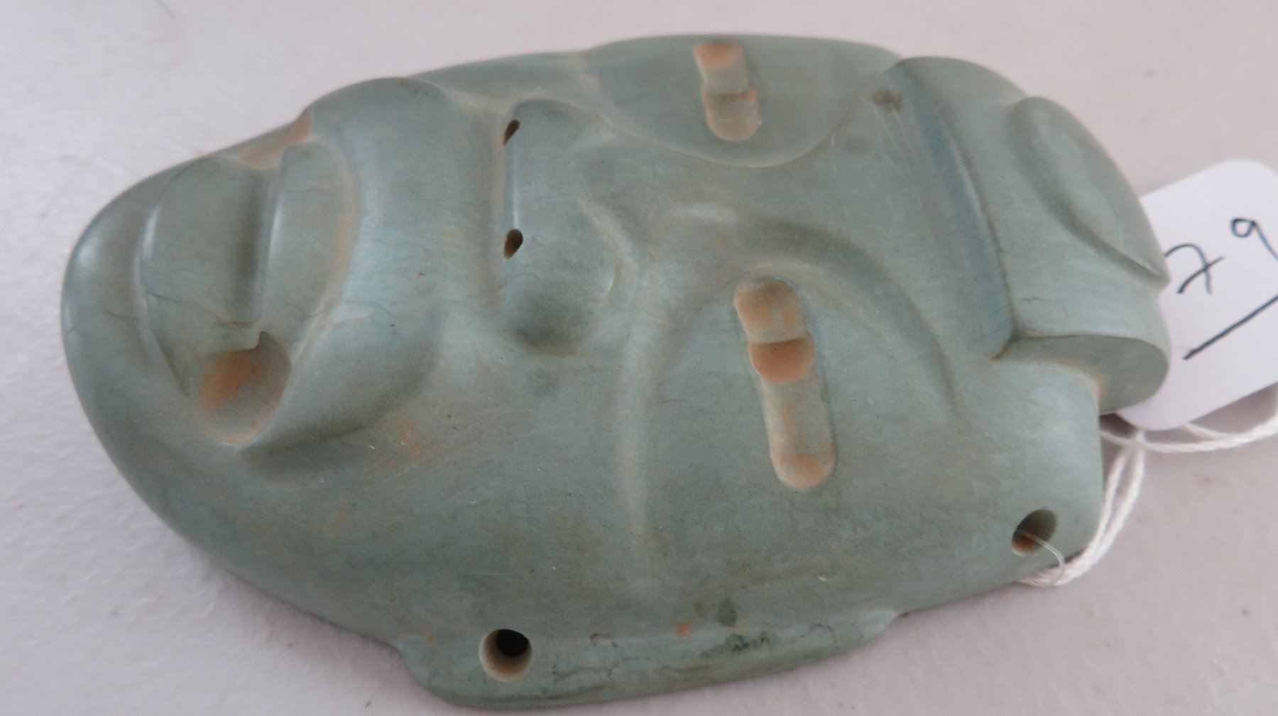 Pre-Columbian-style Mask, age unknown. Made of jadeite, the item measures 3 1/4" x 4 3/8". Condition: Good, see images. Shipping: $16.50 w/insurance and signature.