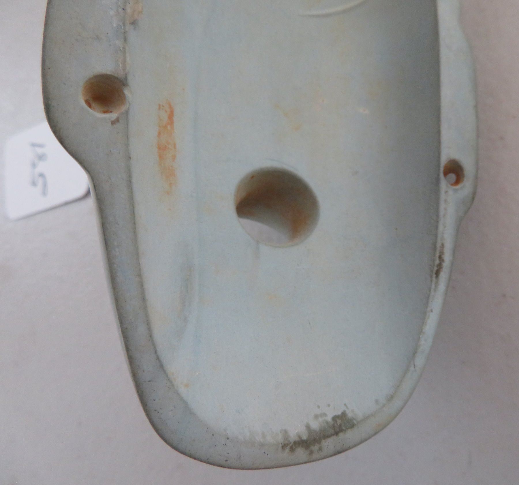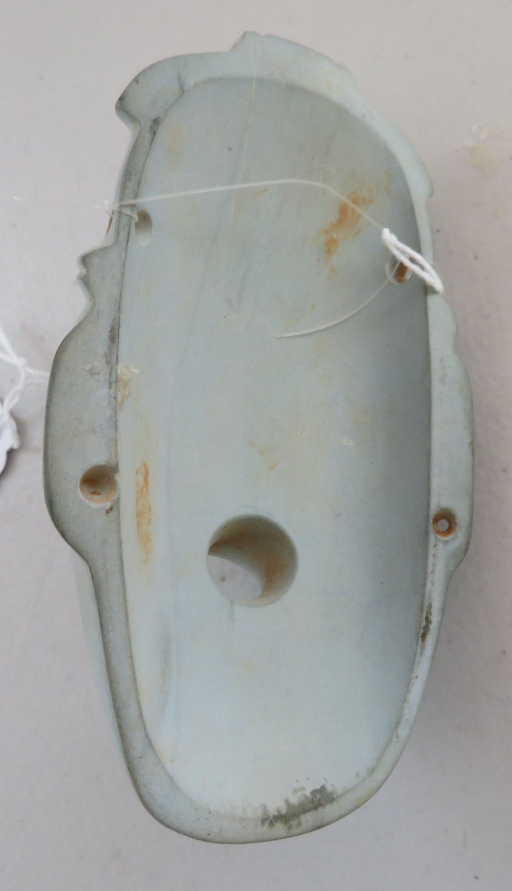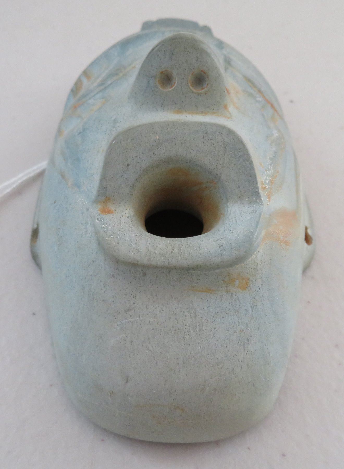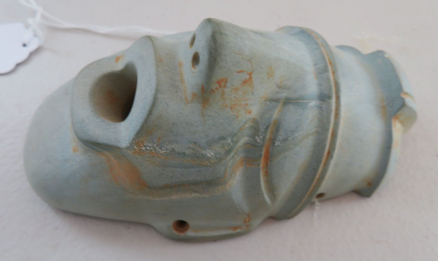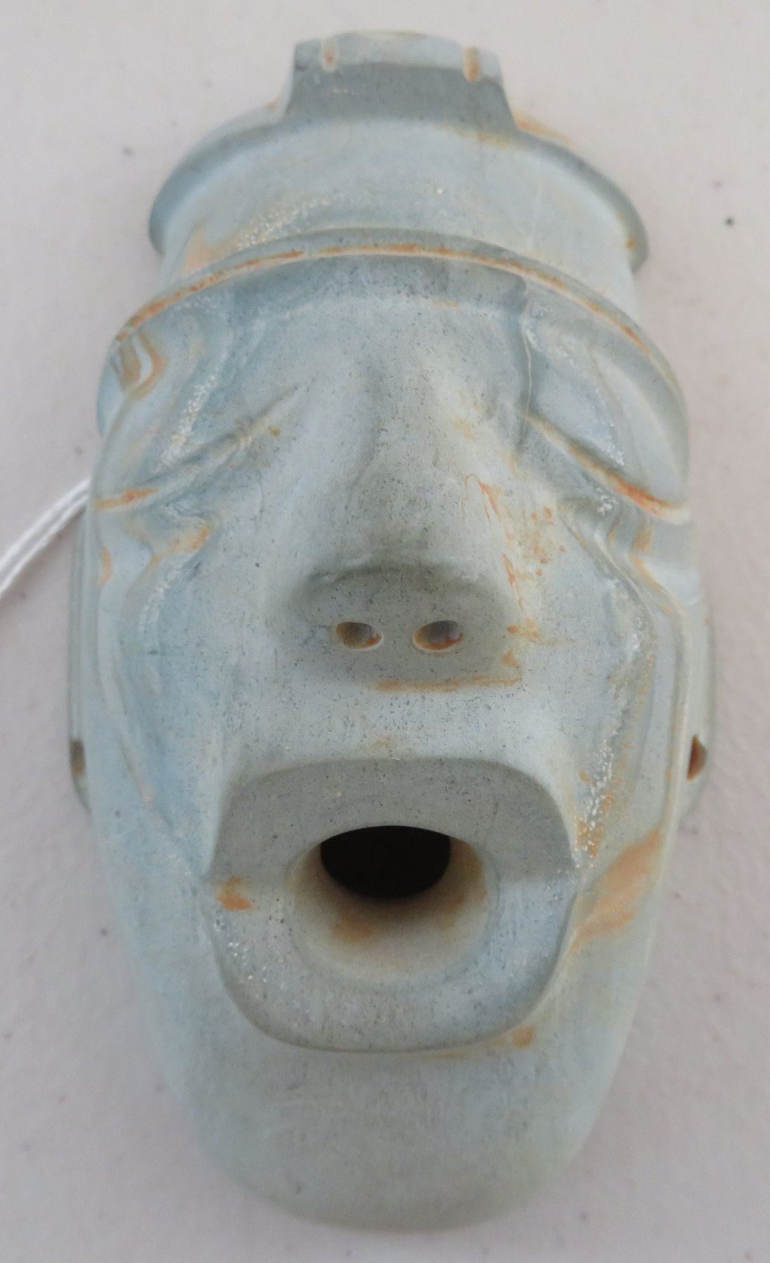 Pre-Columbian-style Mask, age unknown. Made of jadeite, the item measures 2 3/4" x 5". Condition: Good, see images. Shipping: $16.50 w/insurance and signature.