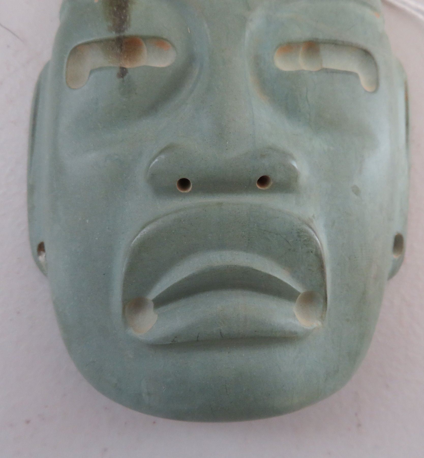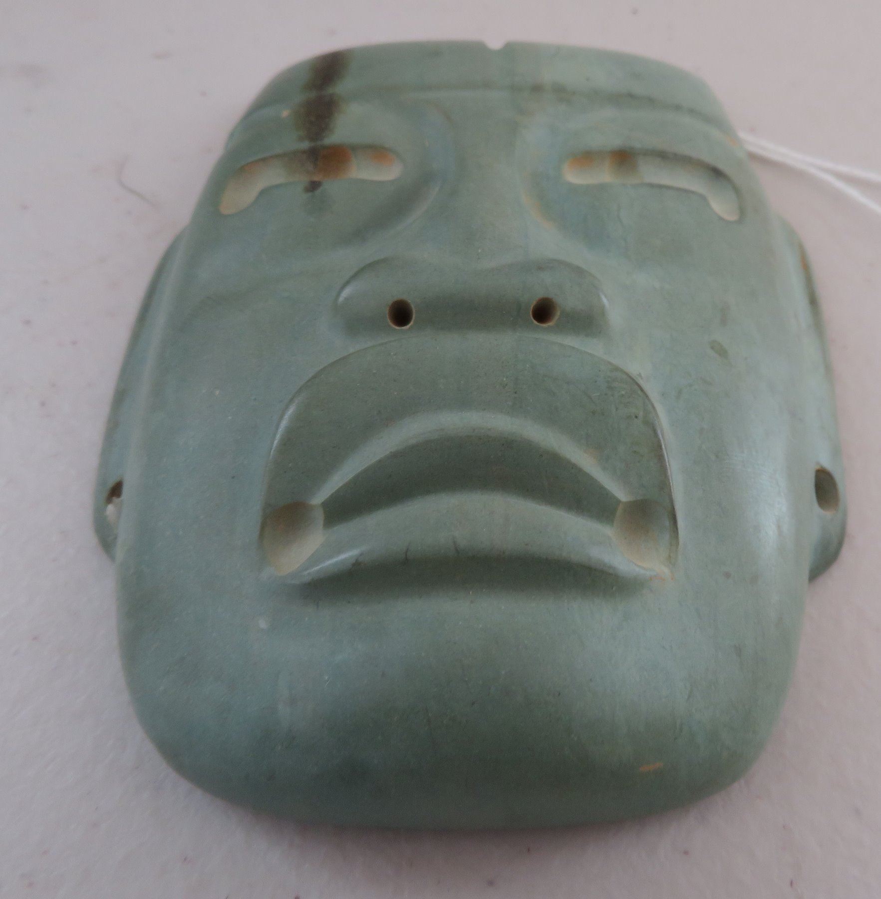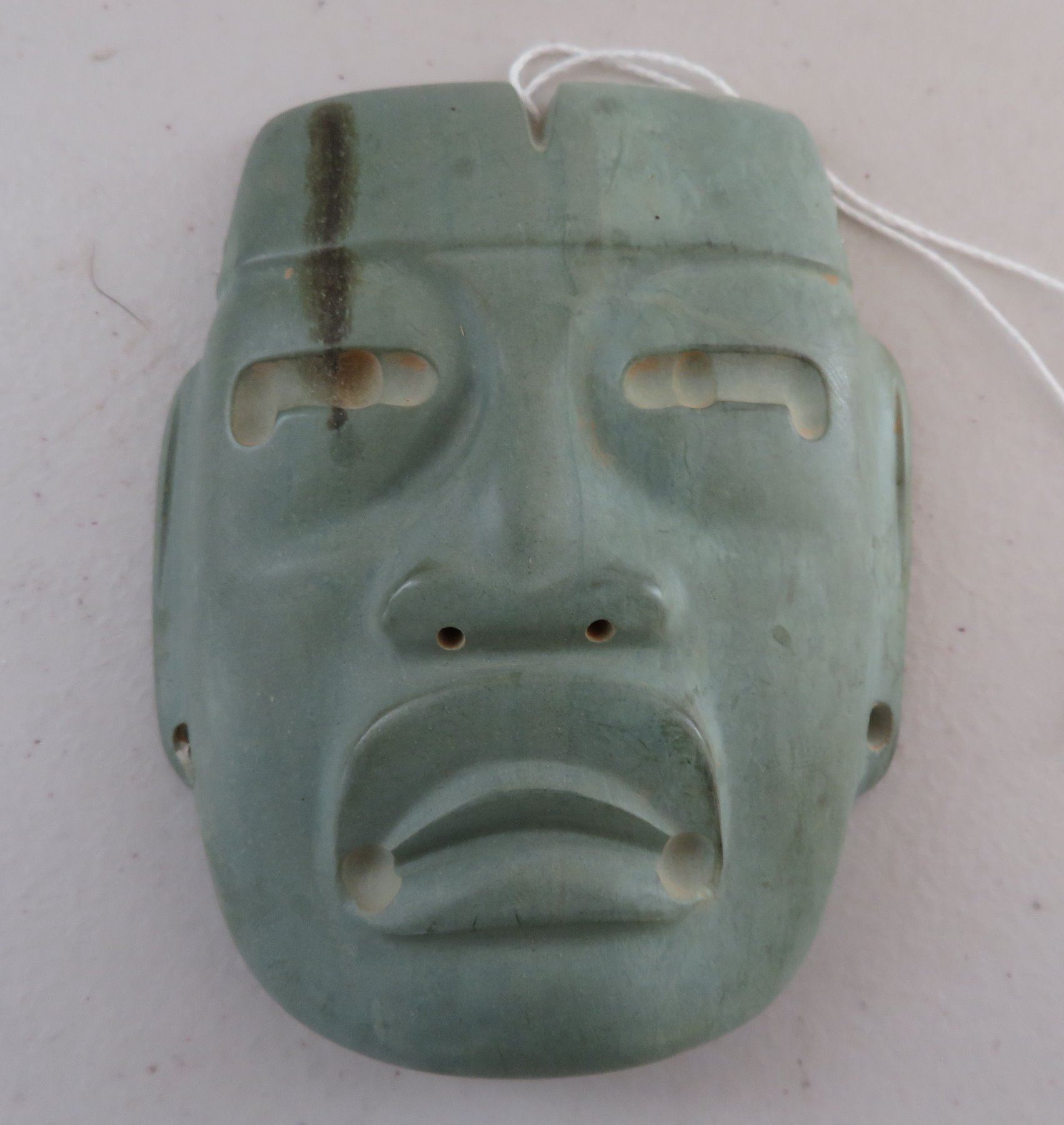 Pre-Columbian-style Mask, age unknown. Made of jadeite, the item measures 3 3/8" x 4 1/4". Condition: Good, see images. Shipping: $16.50 w/insurance and signature.