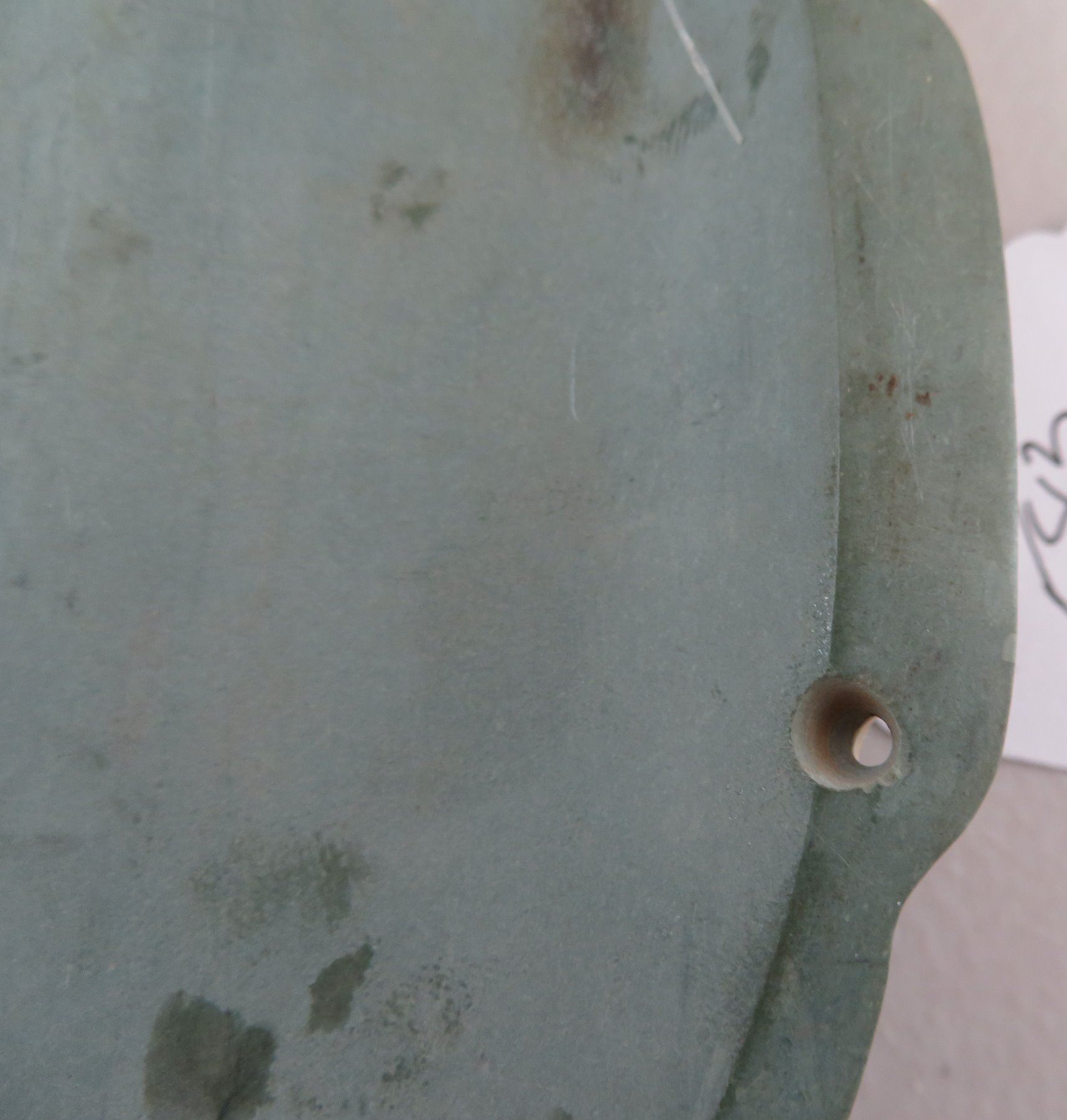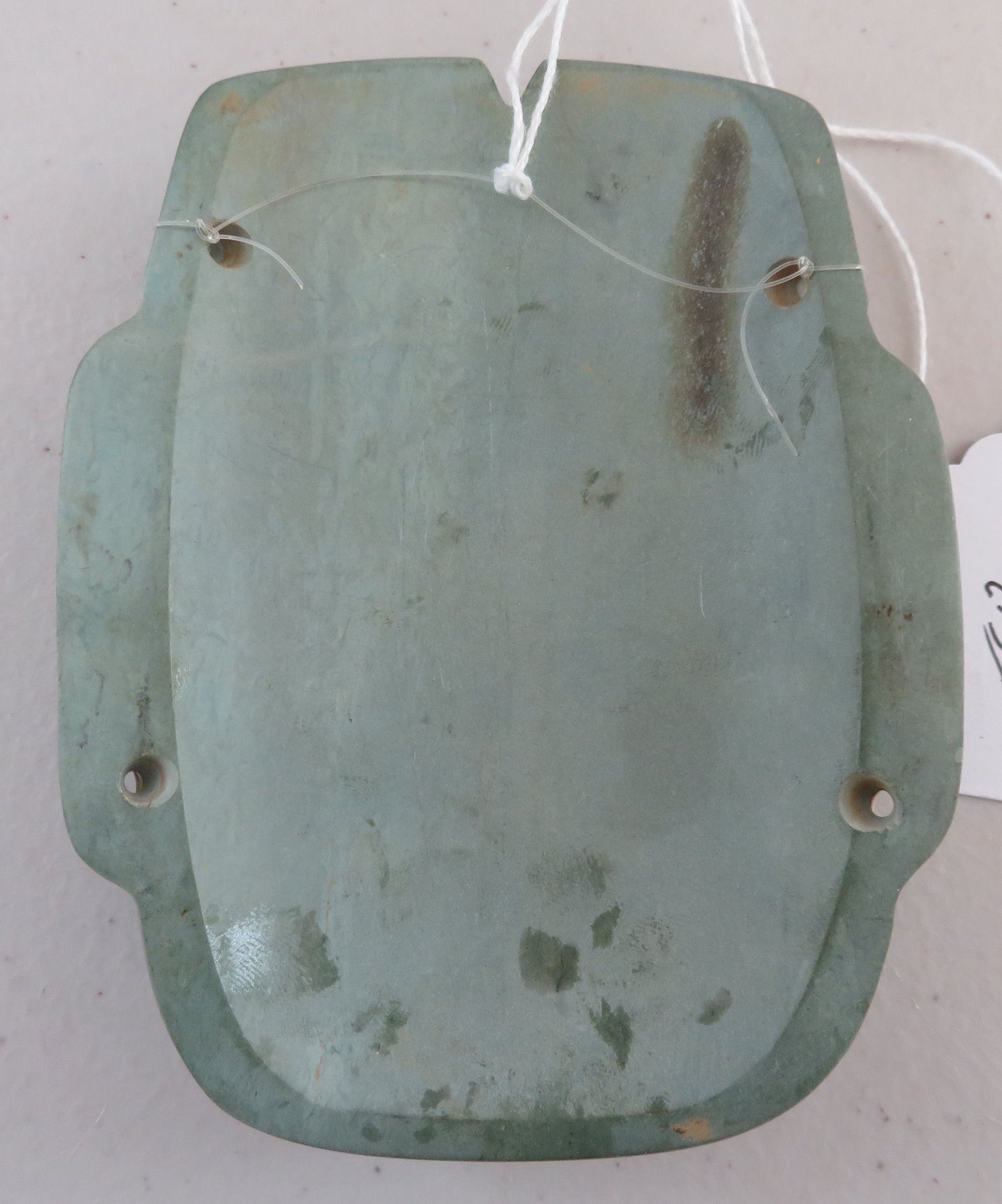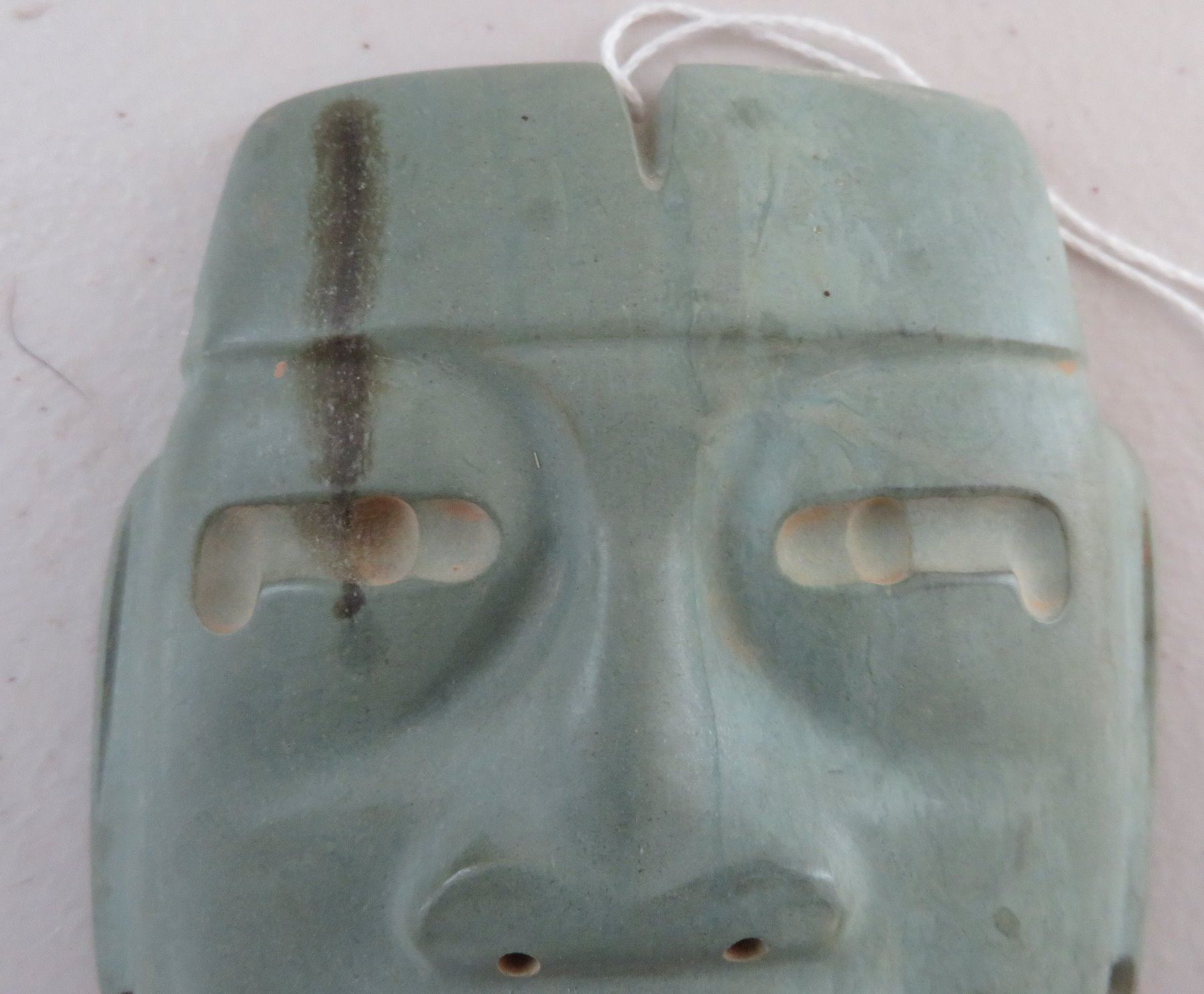 Pre-Columbian-style Mask, age unknown. Made of jadeite, the item measures 3 3/8" x 4 1/4". Condition: Good, see images. Shipping: $16.50 w/insurance and signature.