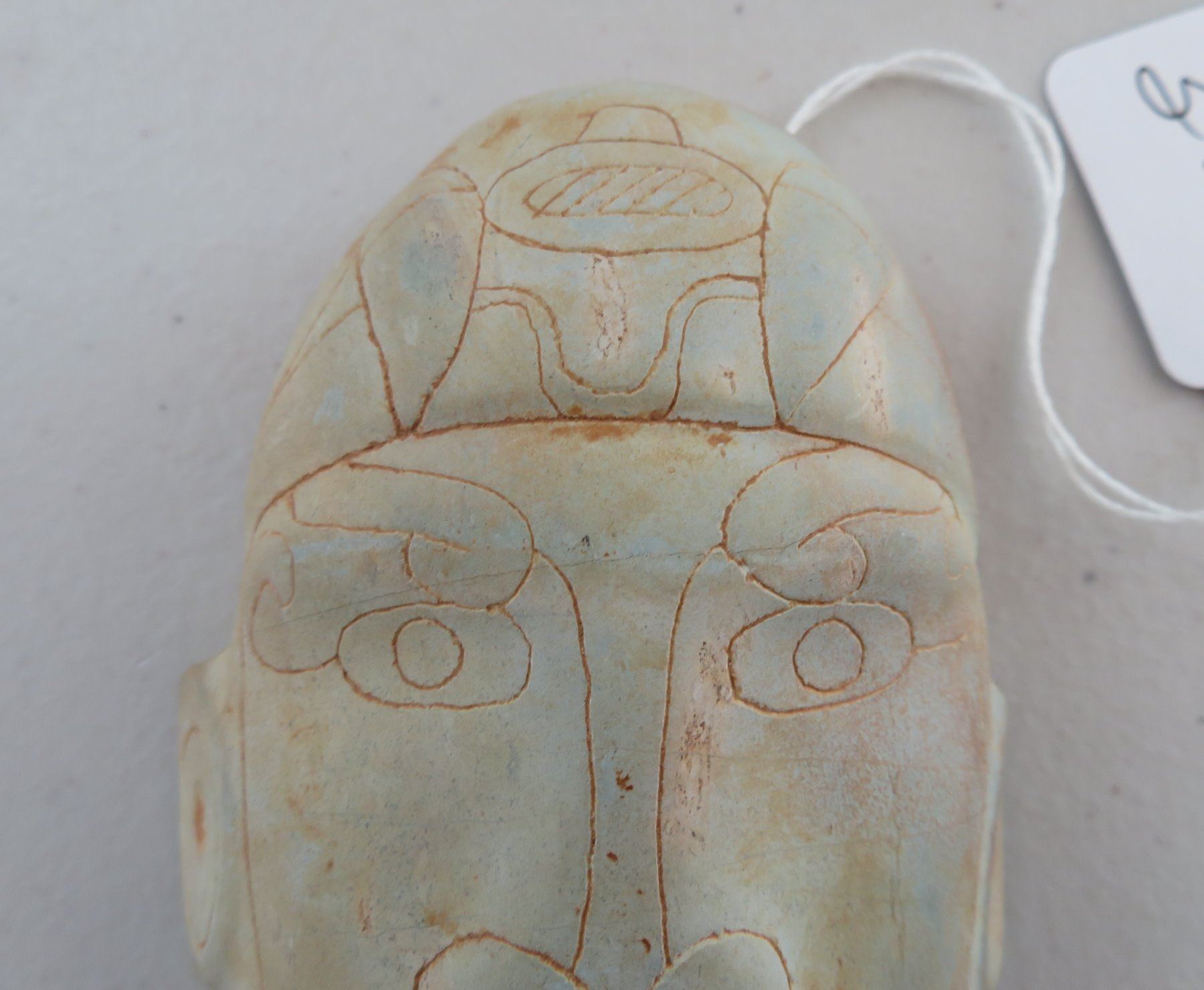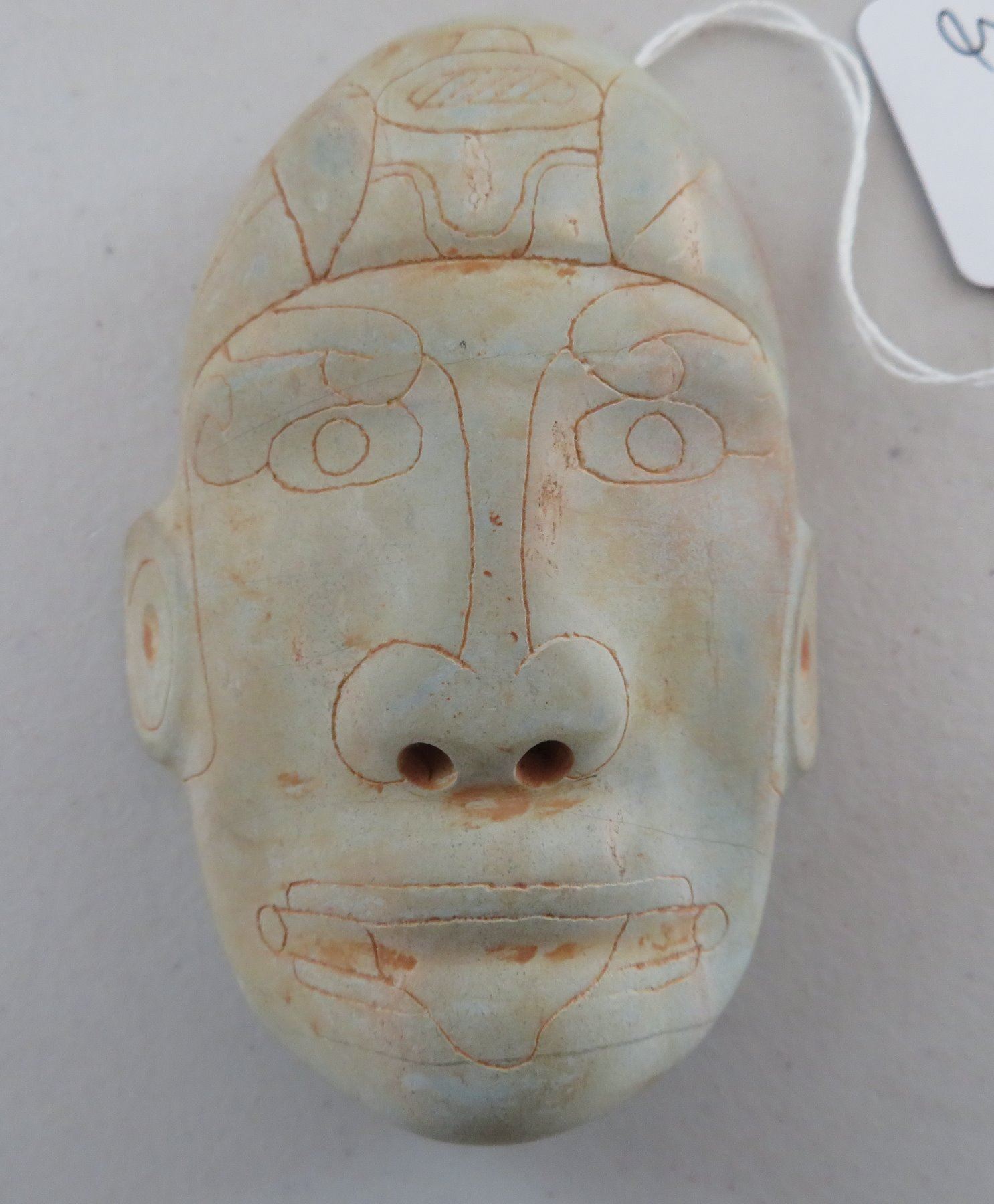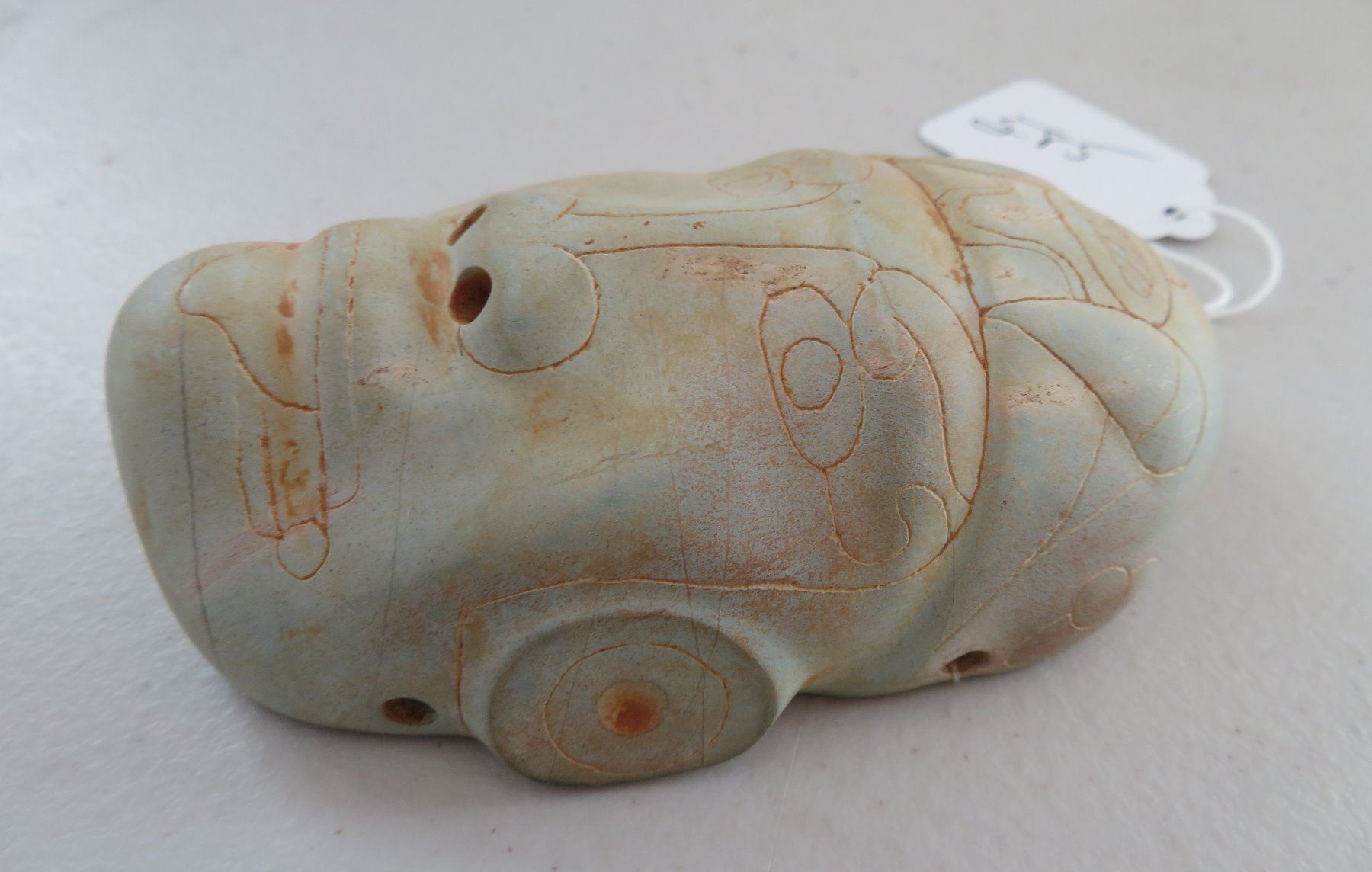 Pre-Columbian-style Mask, age unknown. Made of jadeite, the item measures 3" x 4 1/4". Condition: Good, see images. Shipping: $16.50 w/insurance and signature.