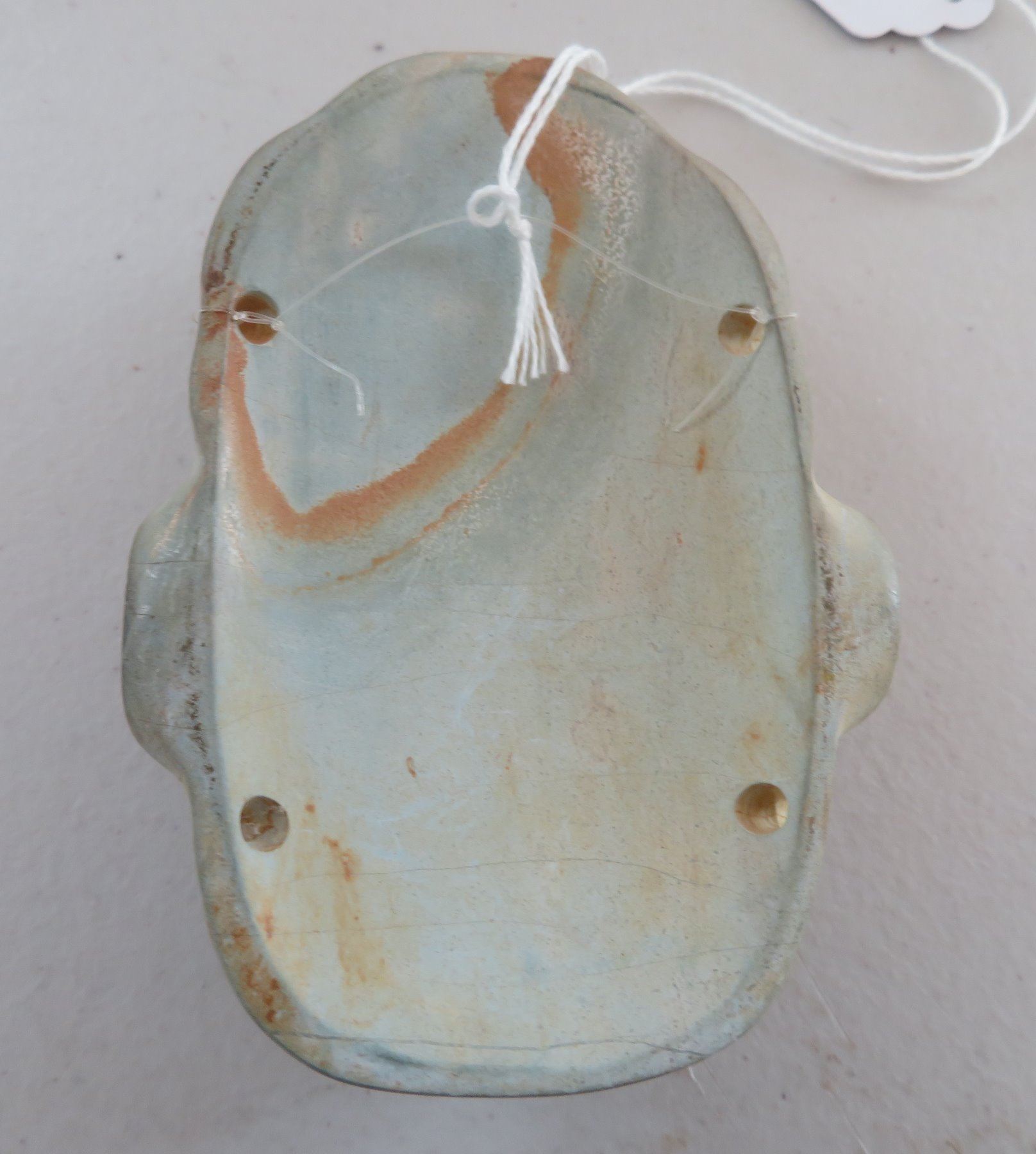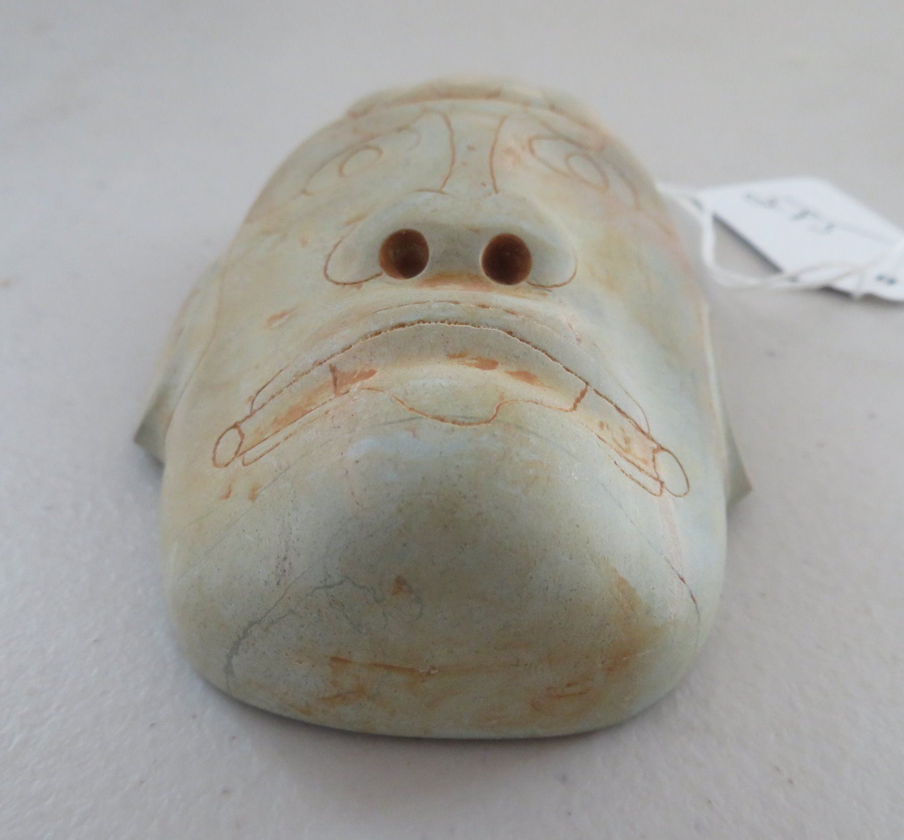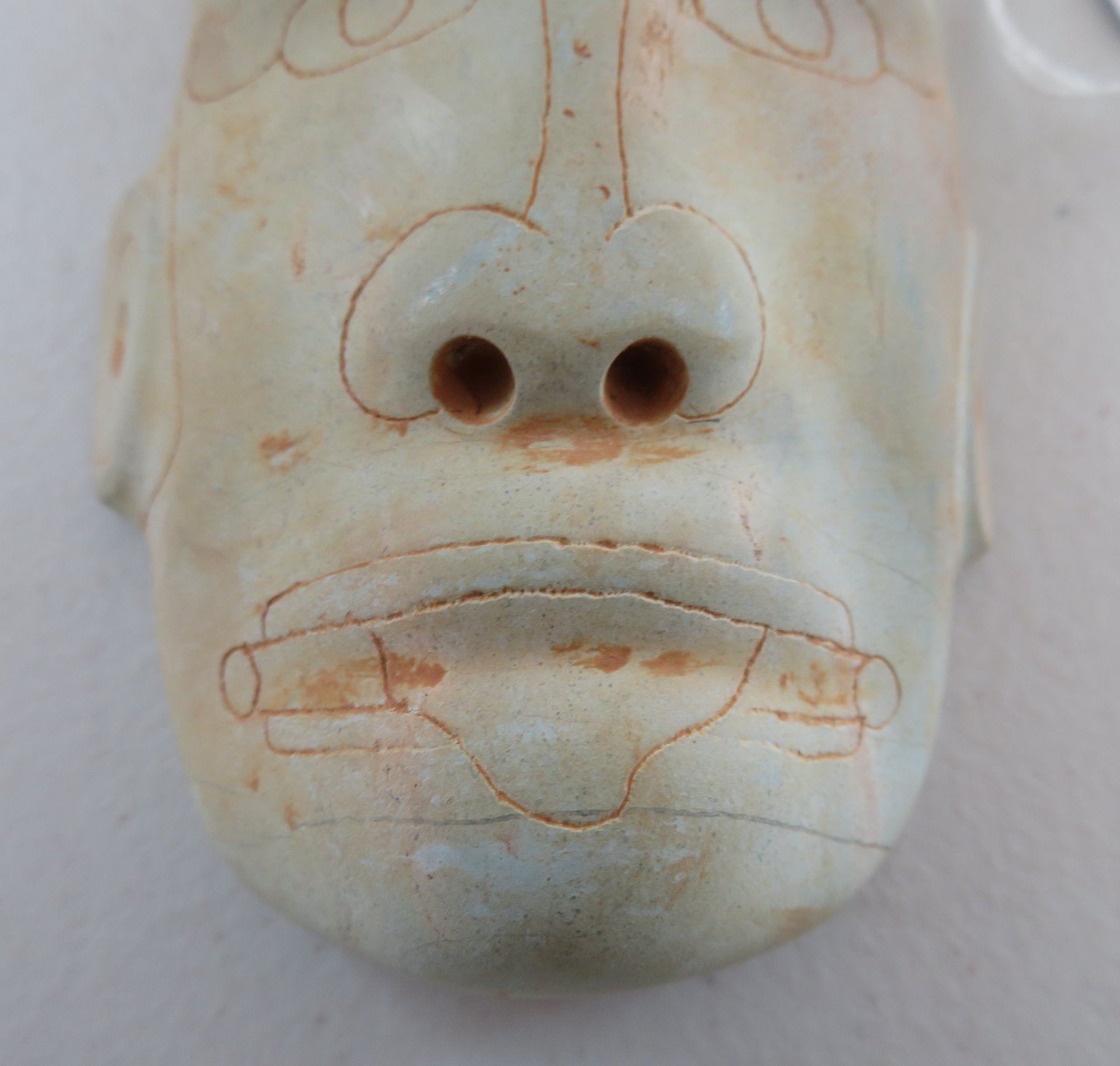 Pre-Columbian-style Mask, age unknown. Made of jadeite, the item measures 3" x 4 1/4". Condition: Good, see images. Shipping: $16.50 w/insurance and signature.