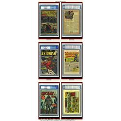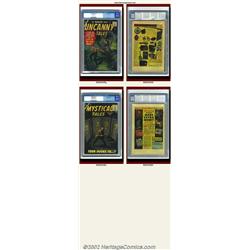 Pre-Hero Horror Lot (Atlas/Marvel). An attractive lot of mid- to high-grade Atlas and pre-hero Marvels, including a few pedigrees. A great peek into the world that existed before superheroes took over the Marvel Universe! Amazing Adult Fantasy #13 CGC FN/VF 7.0 Cream to off-white pages, heavy tanning edges interior front and back cover; Mystical Tales #3 White Mountain pedigree CGC FN/VF 7.0 Off-white to white pages, date stamp on first page and back cover; Tales to Astonish #14 CGC VF- 7.5 Off-white pages, "6" written on cover in marker. "9" and "375" written on back cover in pencil; Uncanny Tales #38 White Mountain pedigree FN+ 6.5 Off-white to white pages, date stamp on first page and back cover; #55 Circle 8 pedigree VF+ 8.5 Cream to off-white pages. Overstreet 2001 FN 6.0 value for group = $369; NM 9.4 value for group = $1,210. 5 Important notice: We expect to be auctioning lots at the rate of 200-250 per hour. Sometimes eBay Premier live bid software cannot keep up with that pace, so we strongly recommend that you place a realistic proxy bid now as insurance to avoid disappointment. Also please note that all Heritage/CAA lots purchased through eBay Premier carry a 20% Buyer's Premium.