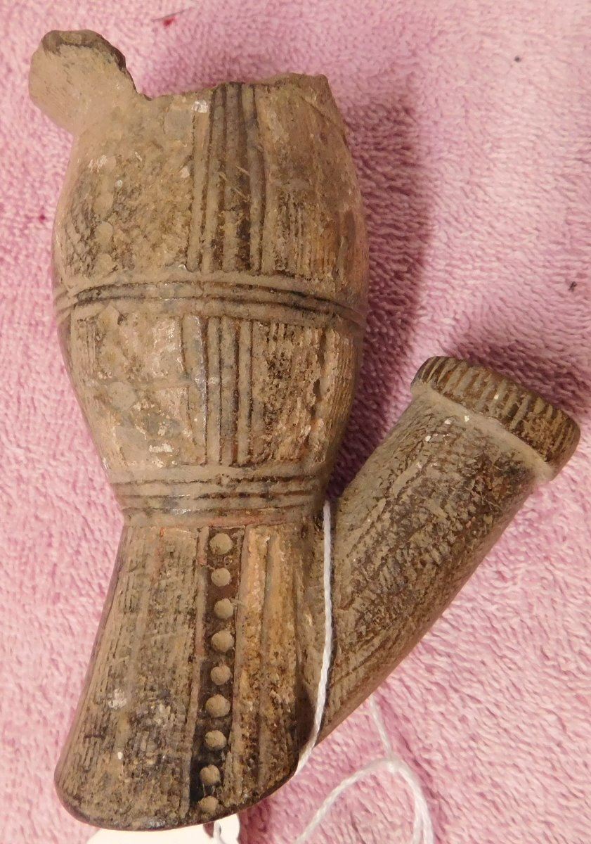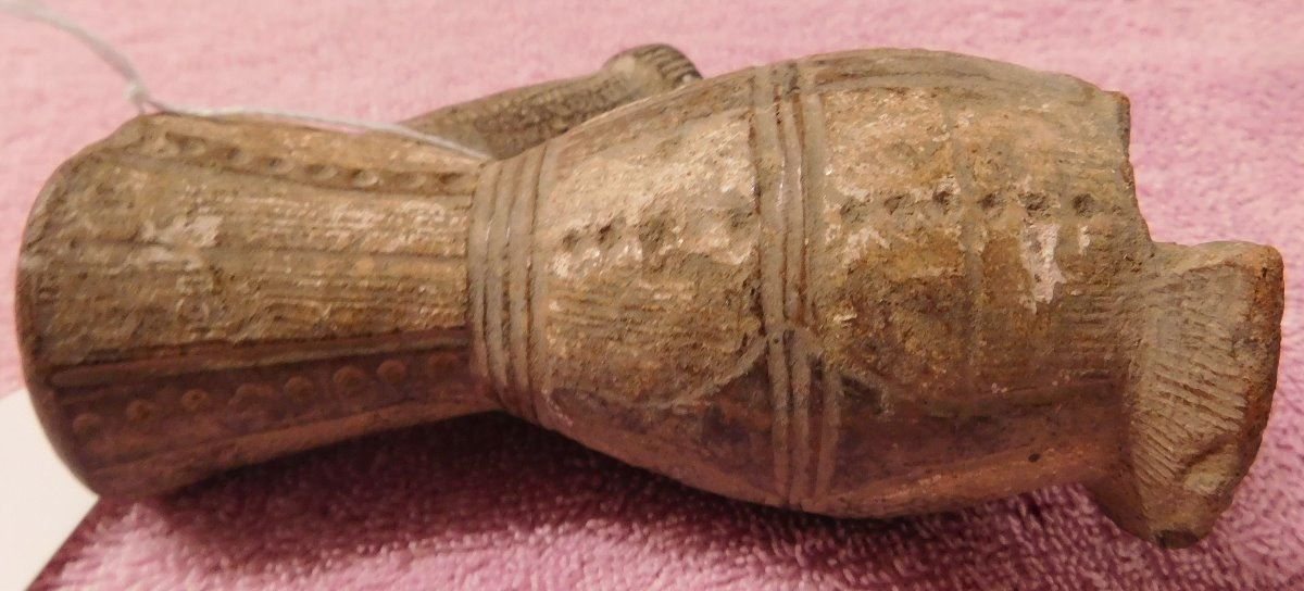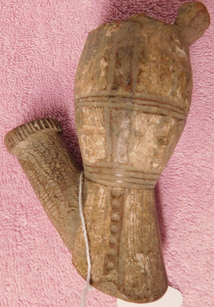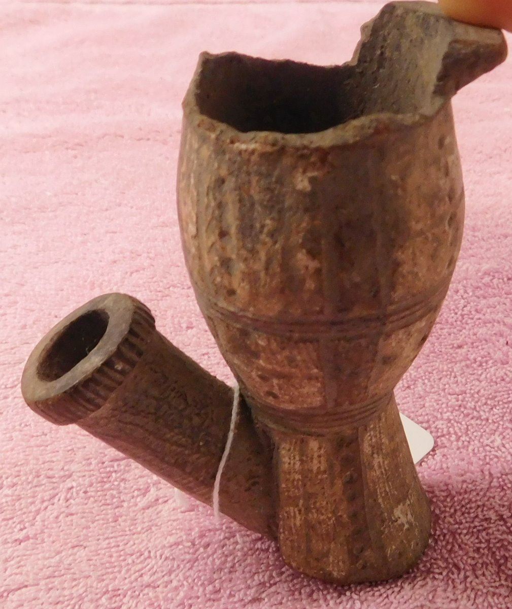 Pre-Historic African Pipe, circa 2000 years old made of clay and measuring 3" x 2.5" x 4.25". From Mali. Nice old pipe. Condition: Some lip damage with nice engraving, see images. Shipping: $22.00 w/insurance and signature.