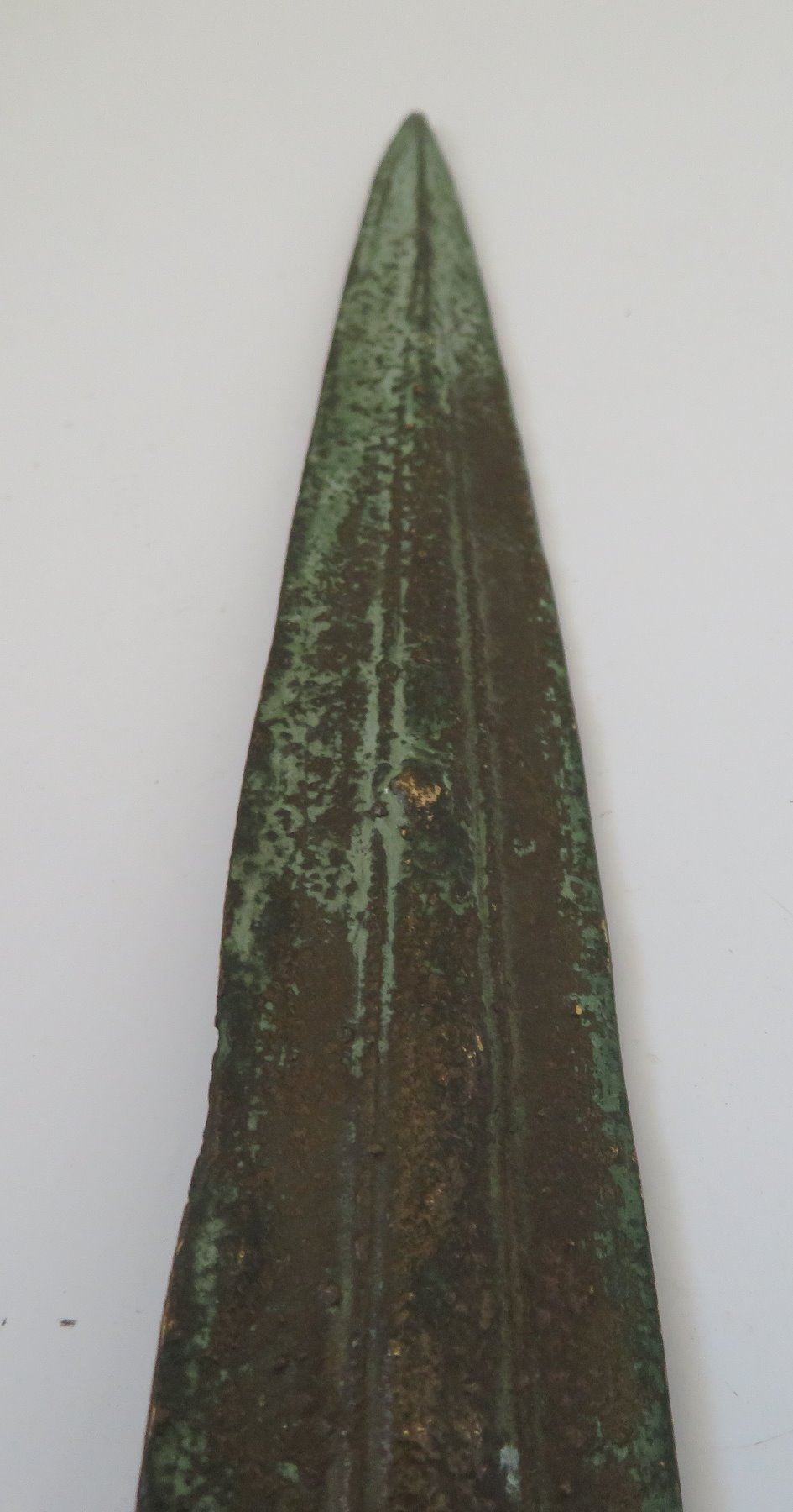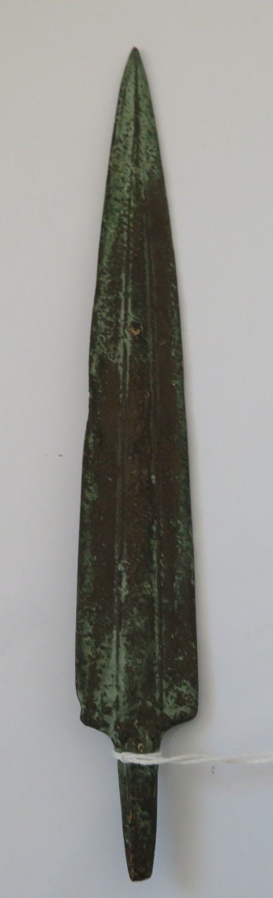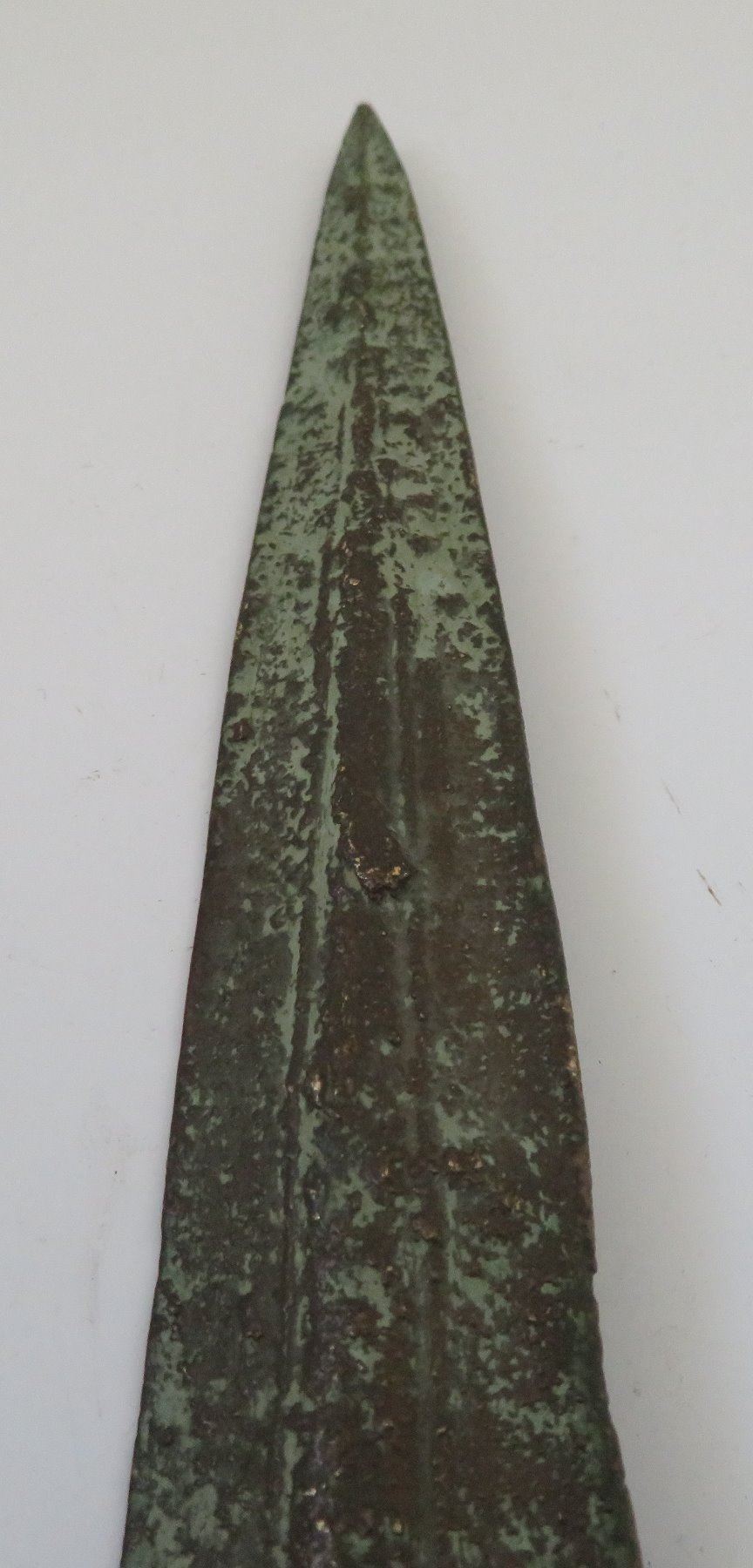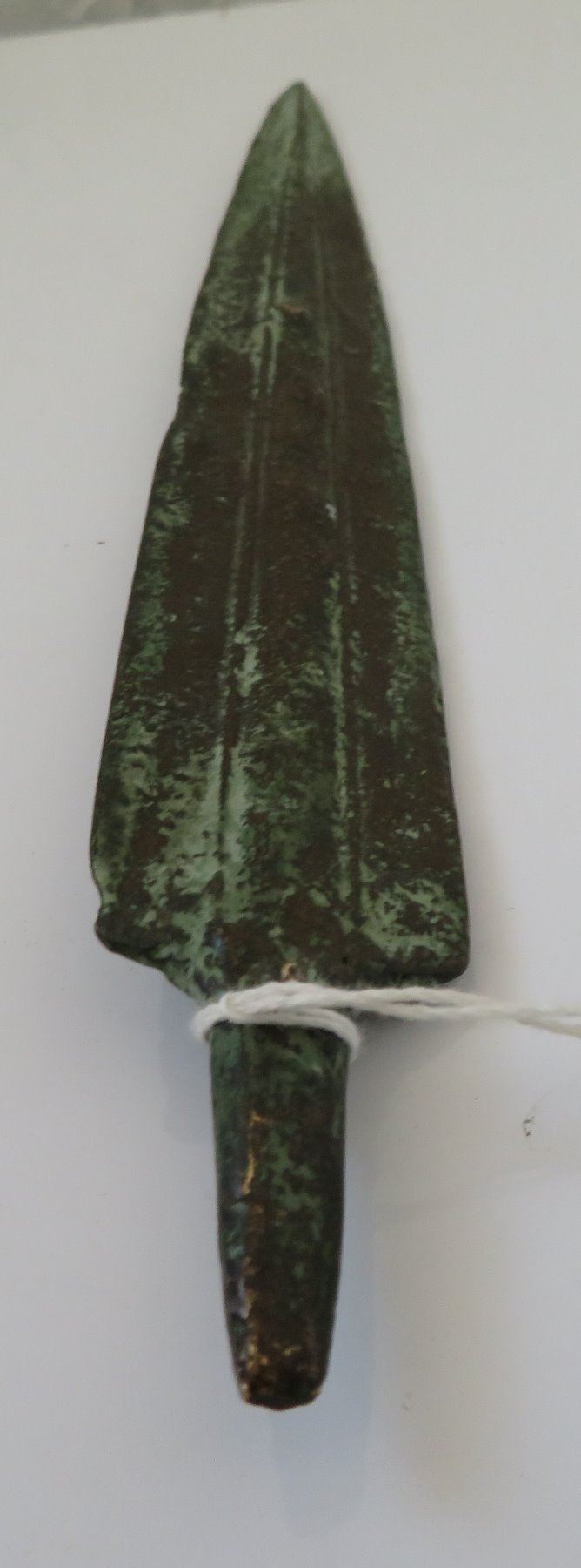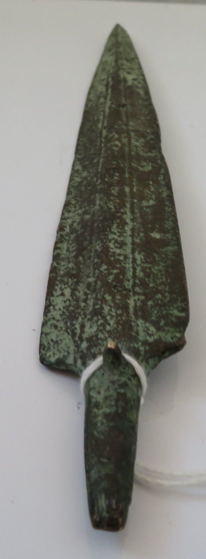 Pre-Historic Bronze Spearpoint, c. 1700s. Made of bronze, the item measures 10" x 1 1/4". Luristan, Iraq-Iran region. Middle Eastern bronze spearhead. Condition: Excellent, good signs of patination and wear, see images. Shipping: $25.00 w/insurance and signature, due to value.