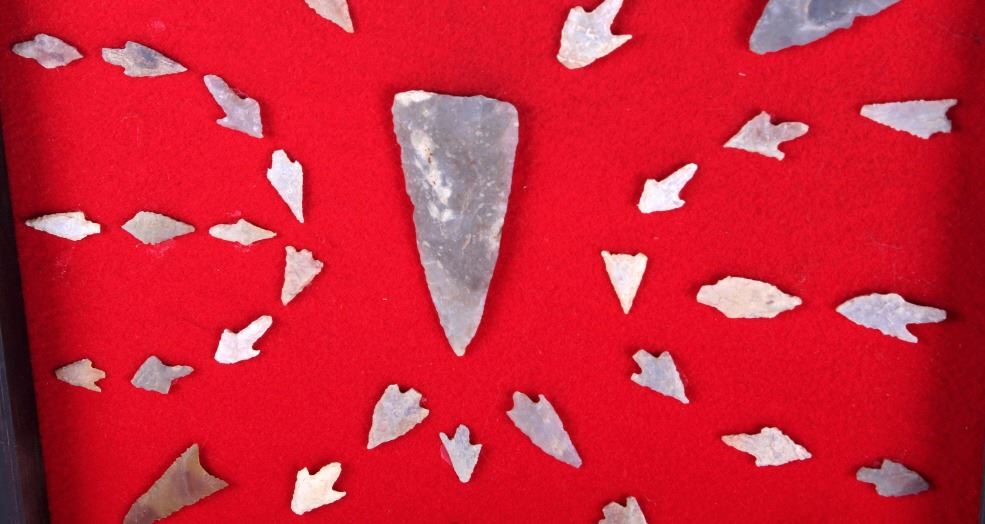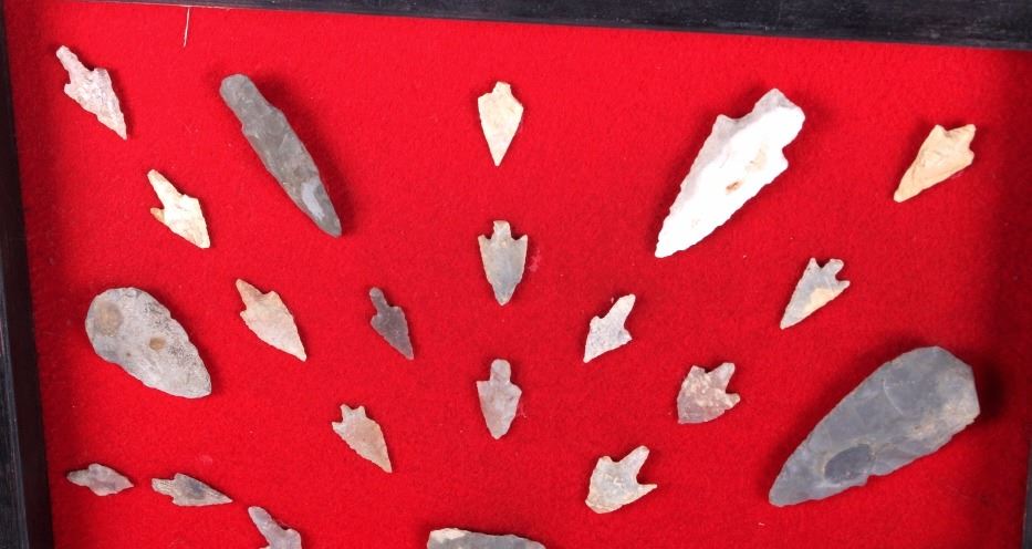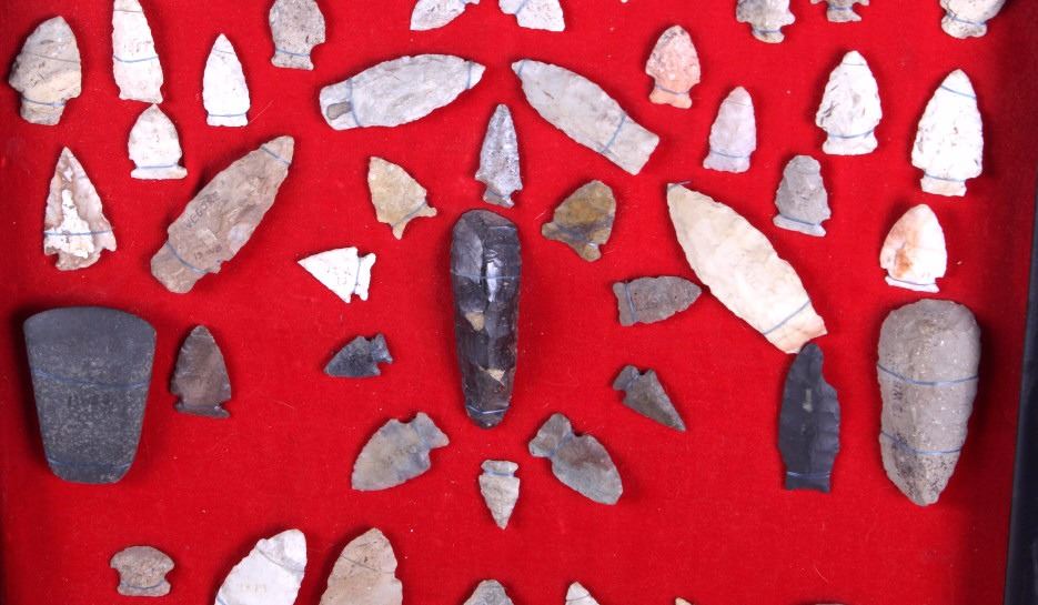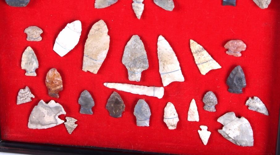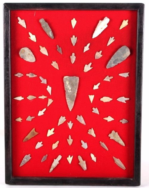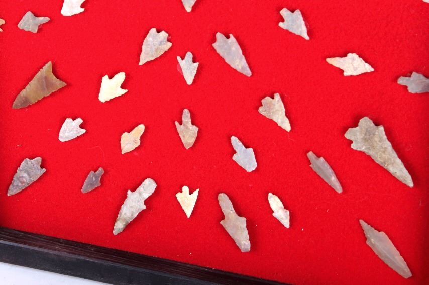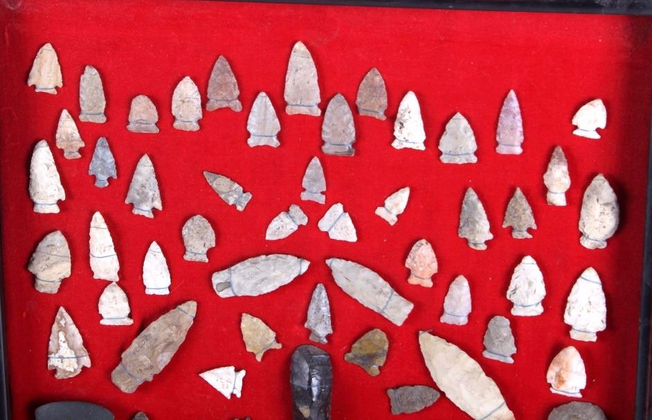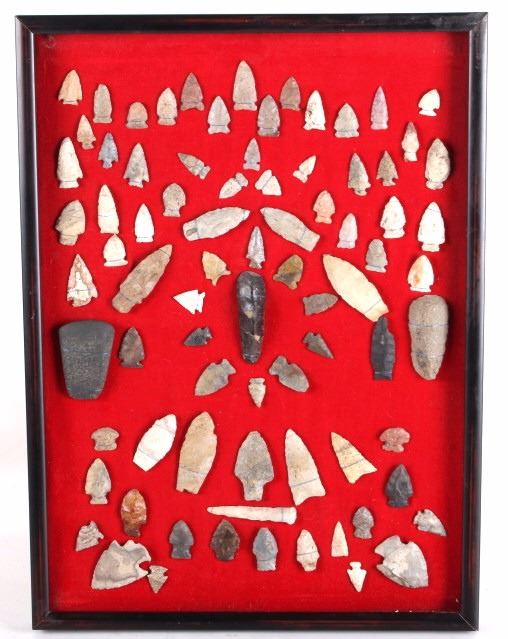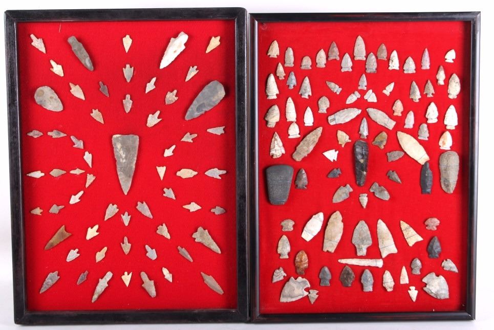 This is a collection of early Neolithic Pre-Historic like hafted obsidian and other stone artifacts. The pieces are from a large Monarch, Montana (Yearout) arrowhead and artifact collection. These are all believed to be Native American Original of the greater Western states (review pictures for origin). The collection includes arrowheads, spear points, hide scrappers, fishing points, and more. These have been secured in the delightful shadow box design. The lot features a total of 147 artifacts. Each display is 15" W x 19 3/4" H. Points from the Montana, Wyoming, Idaho, Washington, Oregon, North Dakota, South Dakota, Colorado.