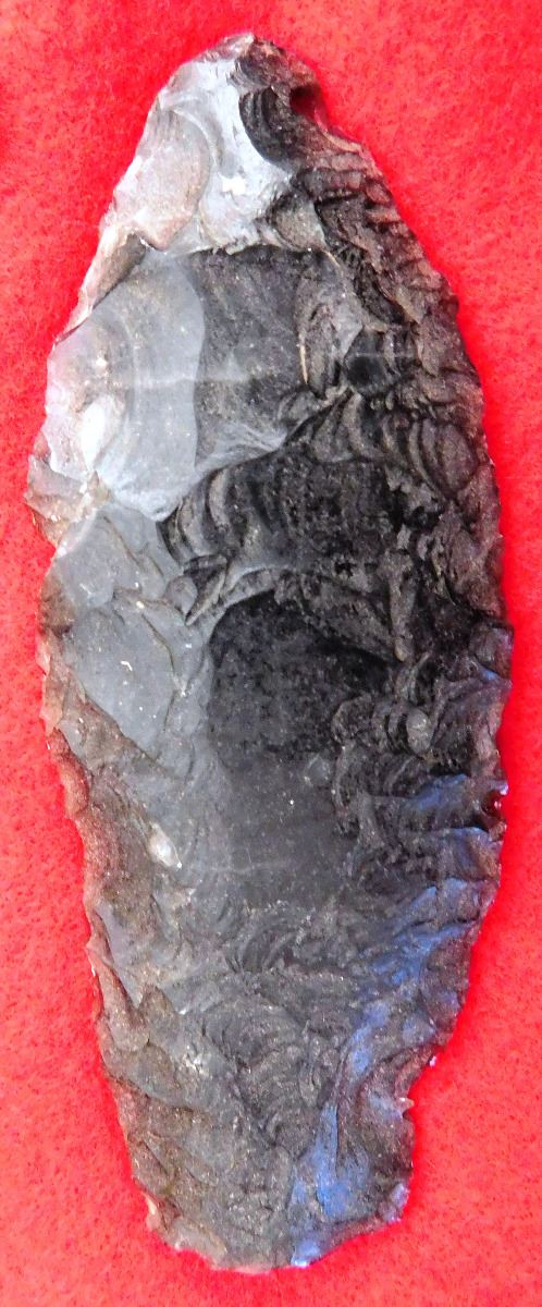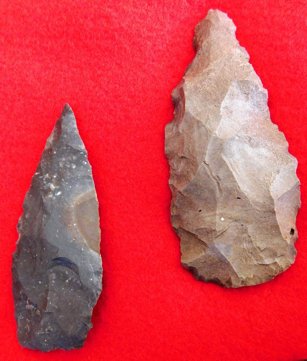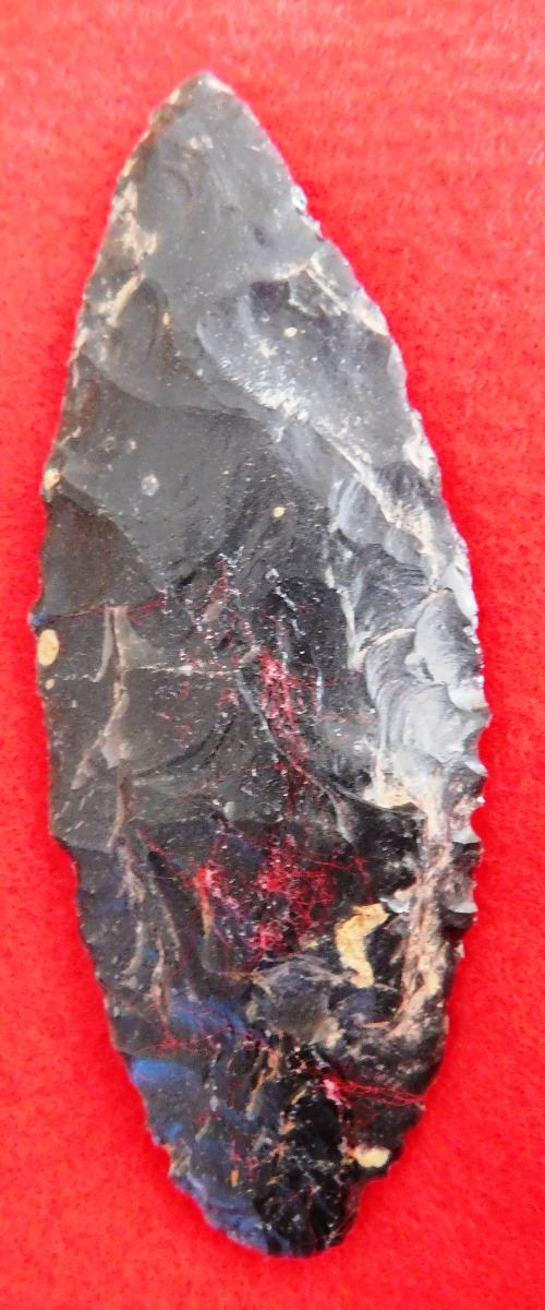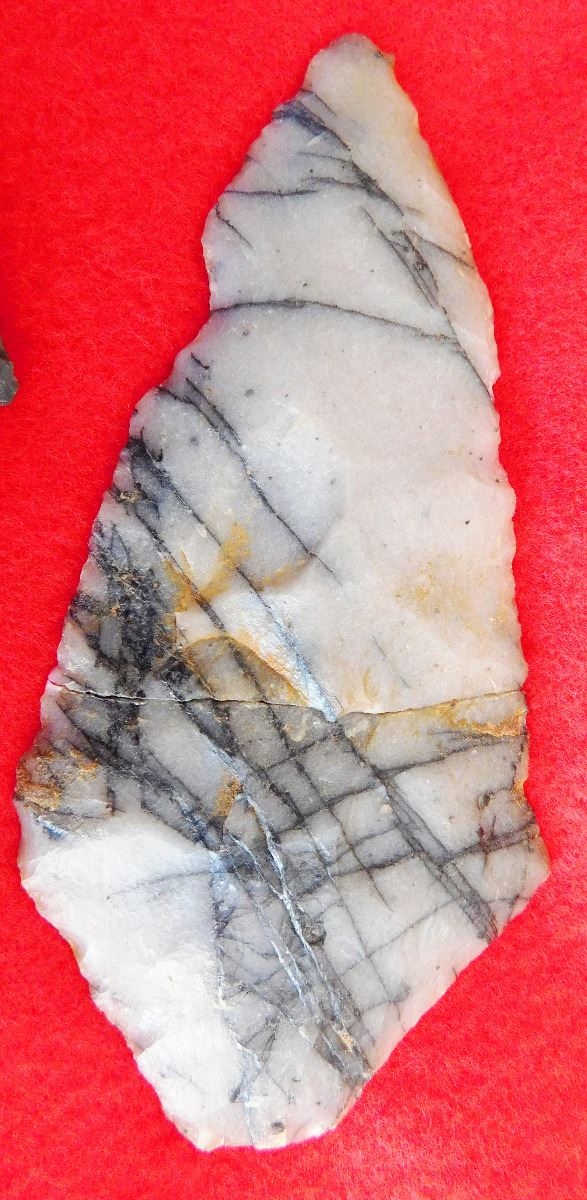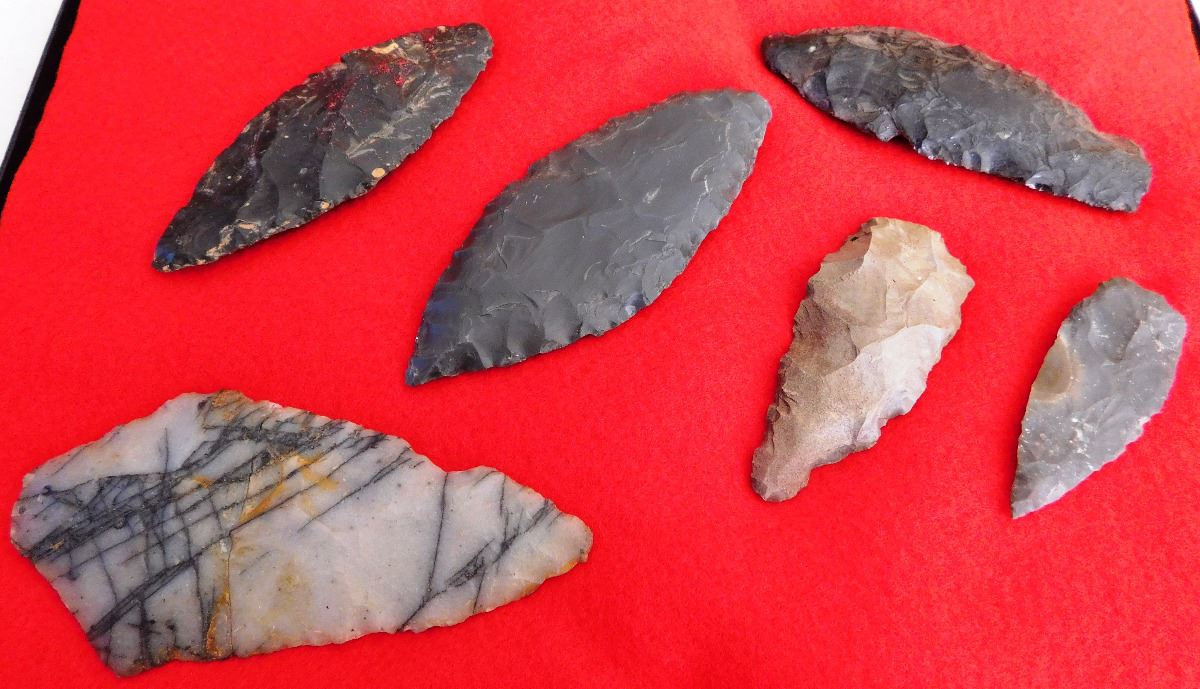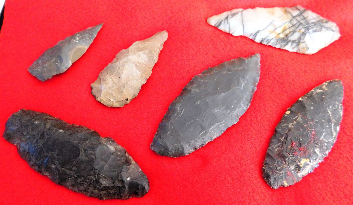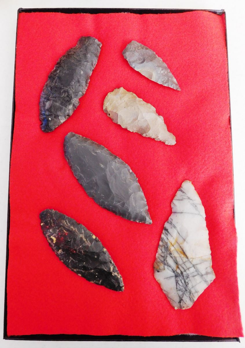 Pre-Historic Oregon Artifacts, circa 3000-8000 years old. This lot has quartz, chert and obsidian. These artifacts measure from 2.5" to 4.5" each. From Klamath Falls, Oregon. Condition: Quartz point is broken in two and glued, other points have nicks and wear, see images. Frame not included. Shipping: $14.50.