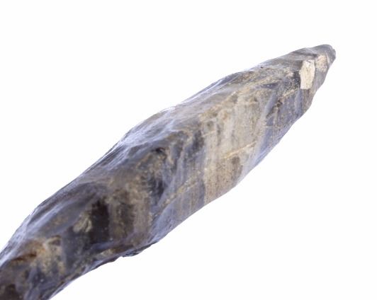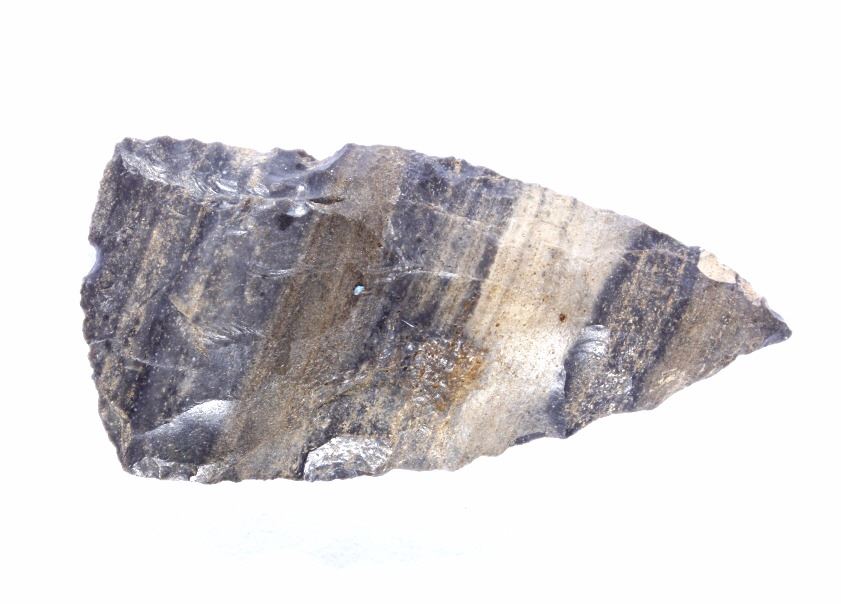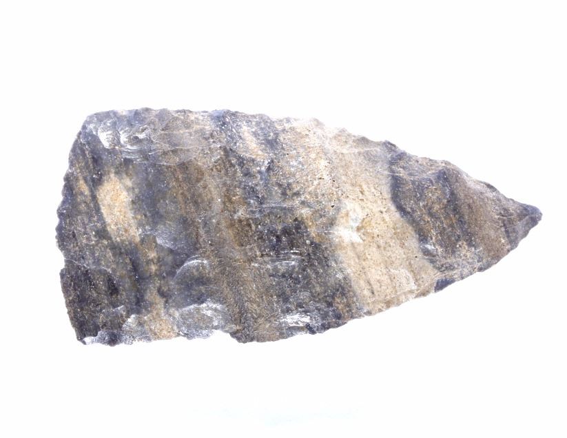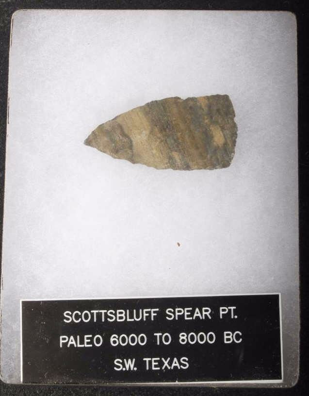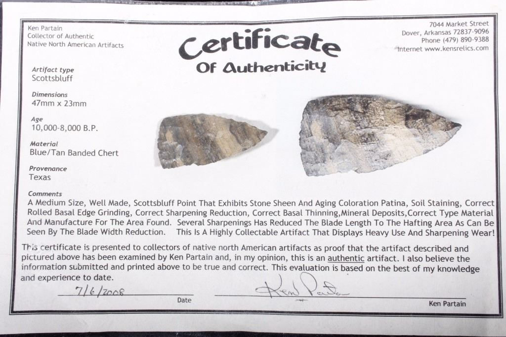 This is an exceptional authentic Pre-Historic Neolithic Scottsbluff Spear Piont Paleo artifact from Southwest Texas circa 10000-8000 B.C. (B.P.). The piece comes with a Certificate of Authenticity (COA) from Ken Partain of Ken's Relics. The spear point shows a Blue/Tan Banded Chert material and measures 47mm x 23mm (approx. 2"L). The piece shows well preserved condition and is displayed in a glass top display case that is 4.5"x5.5". Exceptionally rare historic authentic artifact.