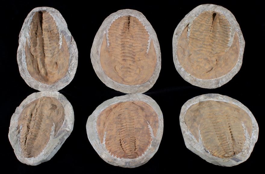 Featured in this lot we have a set of three pre-historic stone encased Trilobite fossils. The Trilobites where the predecessors to the horseshoe crab and died off at the end of the Paleozoic era. The set consists of three sections of rock that are split in half to reveal the Trilobite fossilized on the interior. The Trilobites are split into a top and bottom sections with the bottom section holding most of the fossil. The stone shows a light grey color contrasting with the rust brown of the fossils. These impressive fossils show good condition overall with one showing some minor cracks on the rock. The largest of the fossils measures 9 1/2" long by 7 3/4" wide with the Trilobite itself measuring 7 1/4" long by 6 1/2" wide.