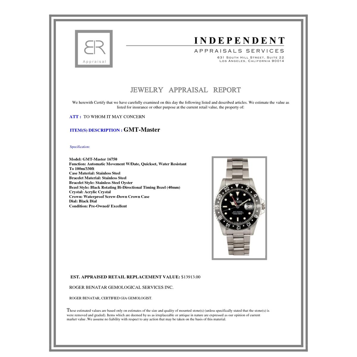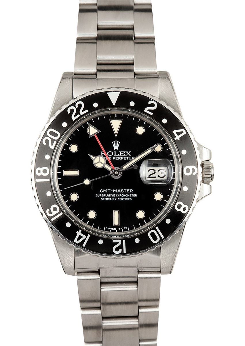 Model/Style-GMT-Master 16750 Serial/Year-Random Features-Automatic quickset movement w/date, acrylic crystal, waterproof screw down crown, water resistant to 100m/330ft Case-Stainless steel with black rotating bi-directional timing bezel (40mm) Bracelet-Stainless steel Oyster #9113
