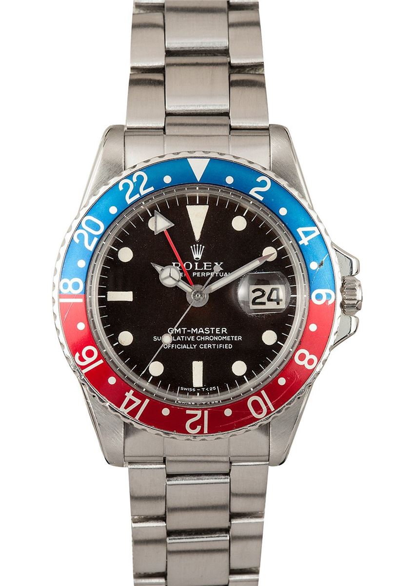 Model/Style-GMT-Master 1675 Serial/Year-Random Features-Automatic movement w/date and GMT hand, acrylic crystal, waterproof screw-down crown, rotating bi-directional timing bezel Case-Stainless steel (40mm) w/ naturally faded red and blue "Pepsi" fat font bezel insert, pierced lugs. Case is in excellent condition w/ slightly rounded edges Bracelet- #9093