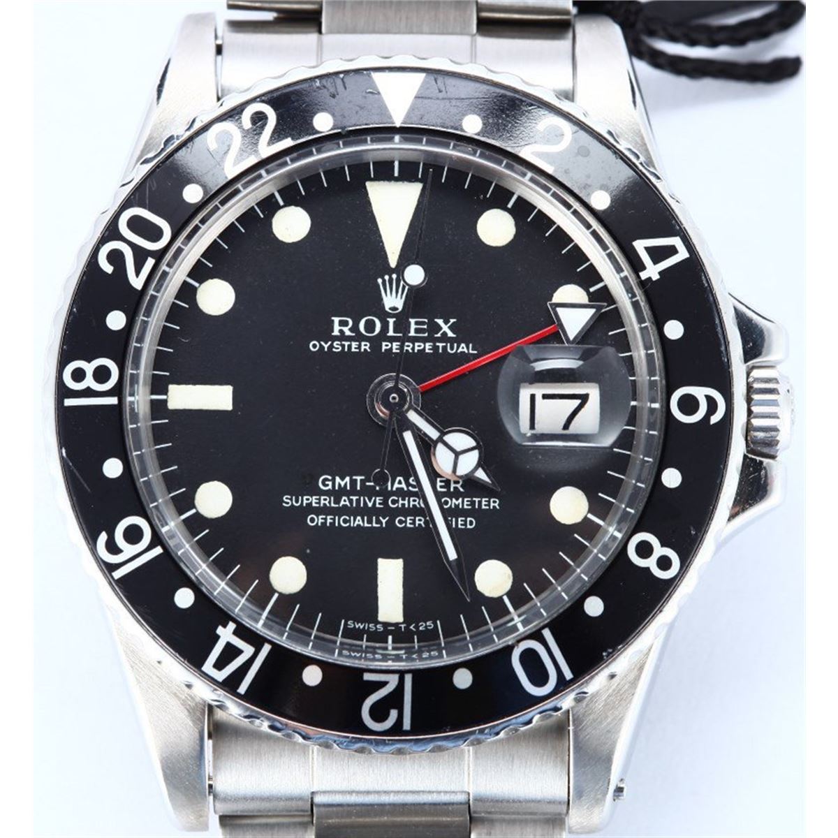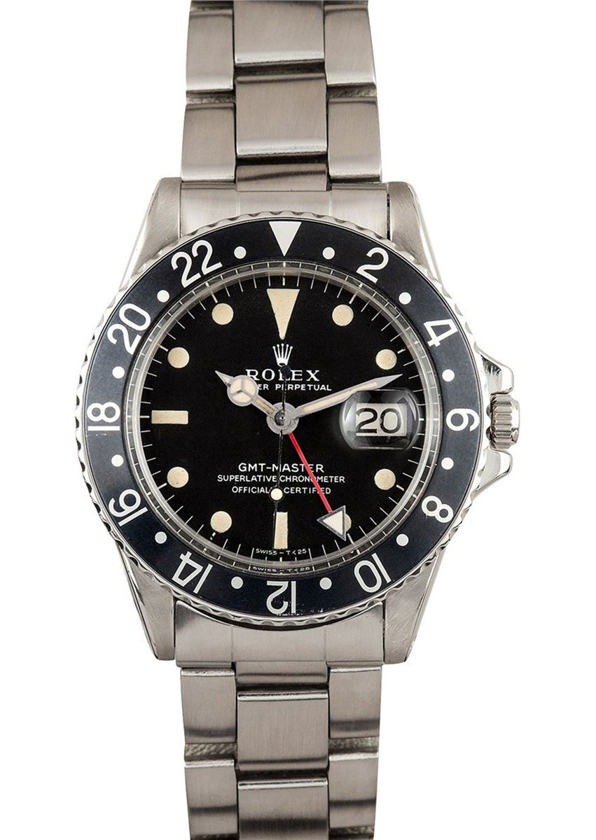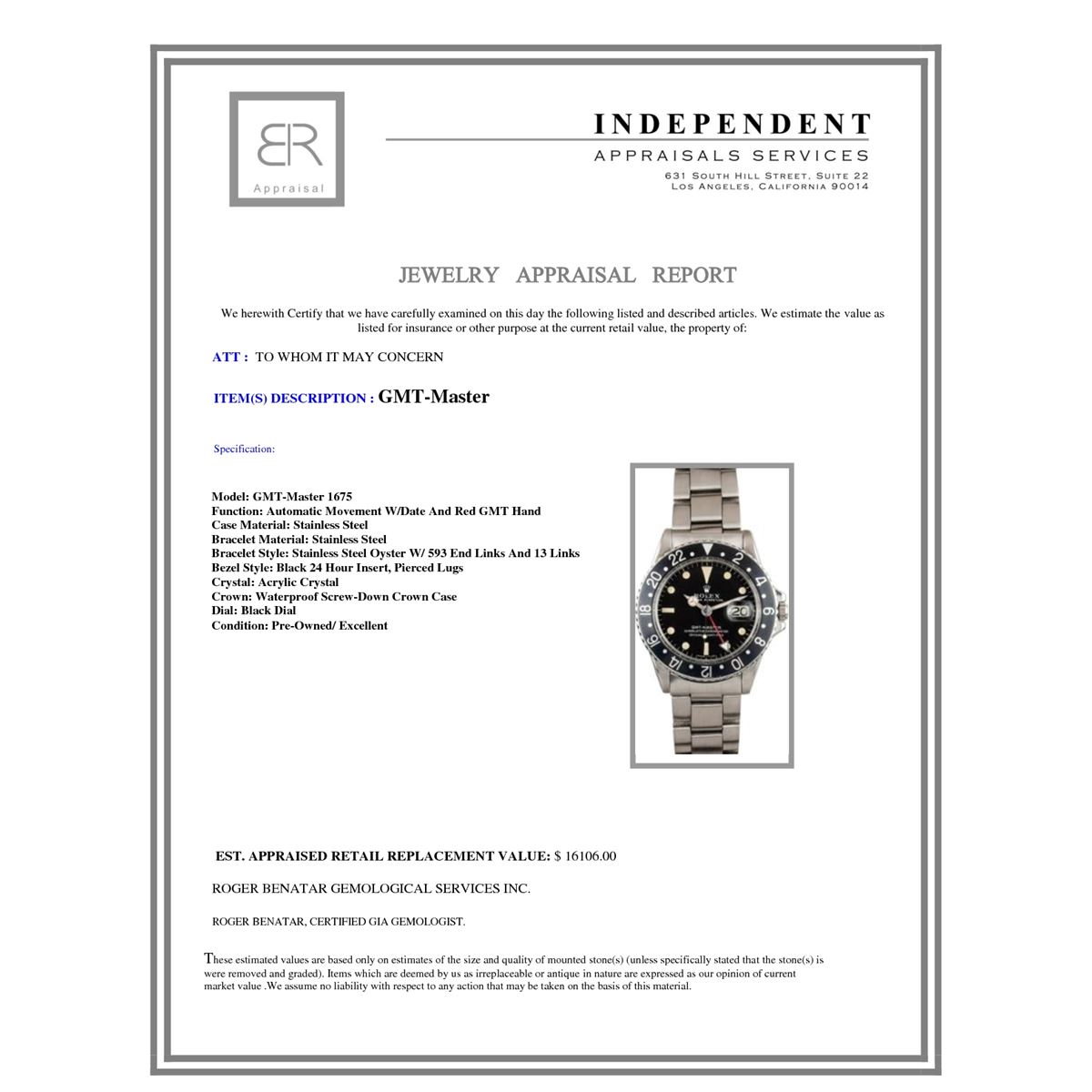 Model/Style-GMT-Master 1675 Serial/Year-Random Features-Automatic movement w/ date and red GMT hand, acrylic crystal, waterproof screw-down crown, replacement, but aged insert Case-Stainless steel w/ black 24 hour insert, pierced lugs Bracelet-Stainless steel Oyster 93150 w/ 593 end links and 13 links #9118