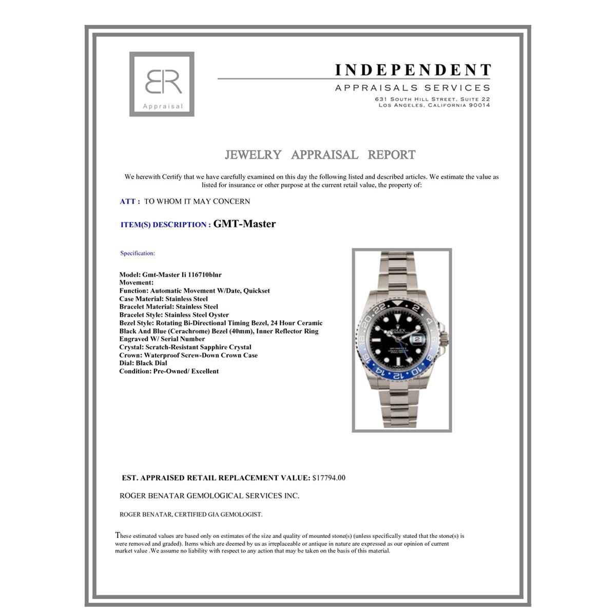 Model/Style-GMT-Master II 116710BLNR Serial/Year-Random Features-Automatic movement w/ date, Quickset, scratch-resistant sapphire crystal, waterproof screw-down crown, rotating bi-directional timing bezel Case-Stainless steel w/ 24 hour ceramic black and blue (Cerachrome) bezel (40mm), inner reflector ring engraved w/ serial number Bracelet-Stainless steel Oyster #9076