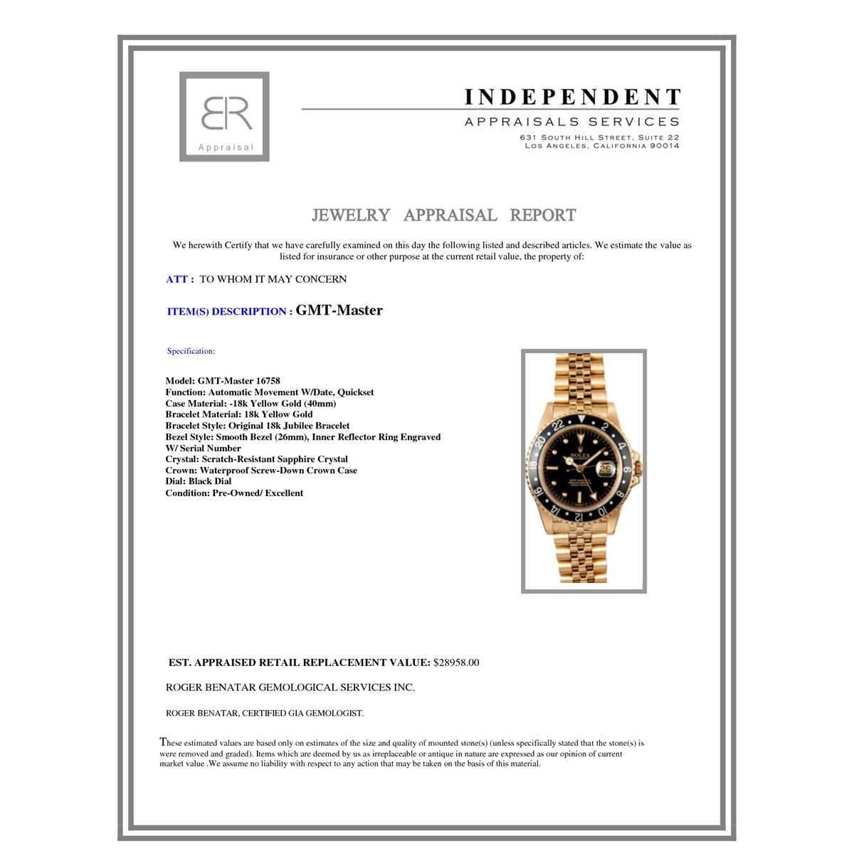 Model/Style-GMT-Master 16758 Serial/Year-Random Features-Automatic movement w/ date, quickset, scratch resistant sapphire crystal, waterproof screw-down crown Case-18k yellow gold (40mm). Case is in excellent condition with sharp beveled edges. Bracelet-Original 18k jubilee bracelet is in excellent condition. #9116
