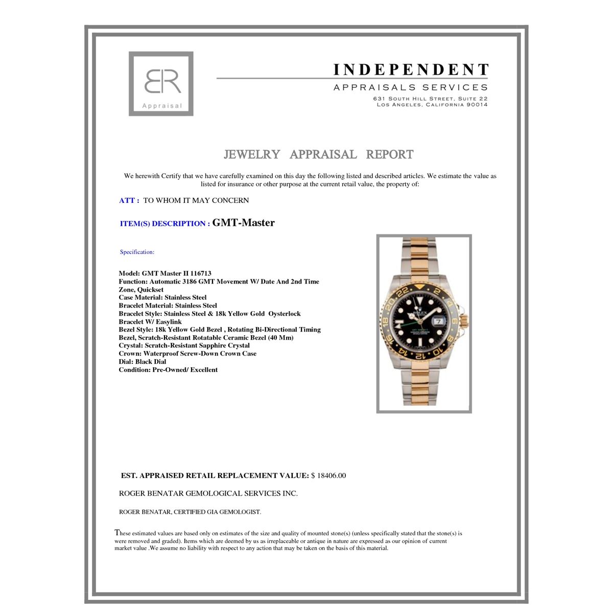 Model/Style-GMT Master II 116713 Serial/Year-Random Features-Automatic 3186 GMT movement w/ date and 2nd time zone, Quickset, scratch-resistant sapphire crystal, waterproof screw-down crown, rotating bi-directional timing bezel Case-Stainless steel w/ 18k yellow gold bezel with scratch-resistant rotatable ceramic bezel (40 mm) Bracelet-Stainless steel & 18k yellow gold Oysterlock bracelet w/ Easylink #9104
