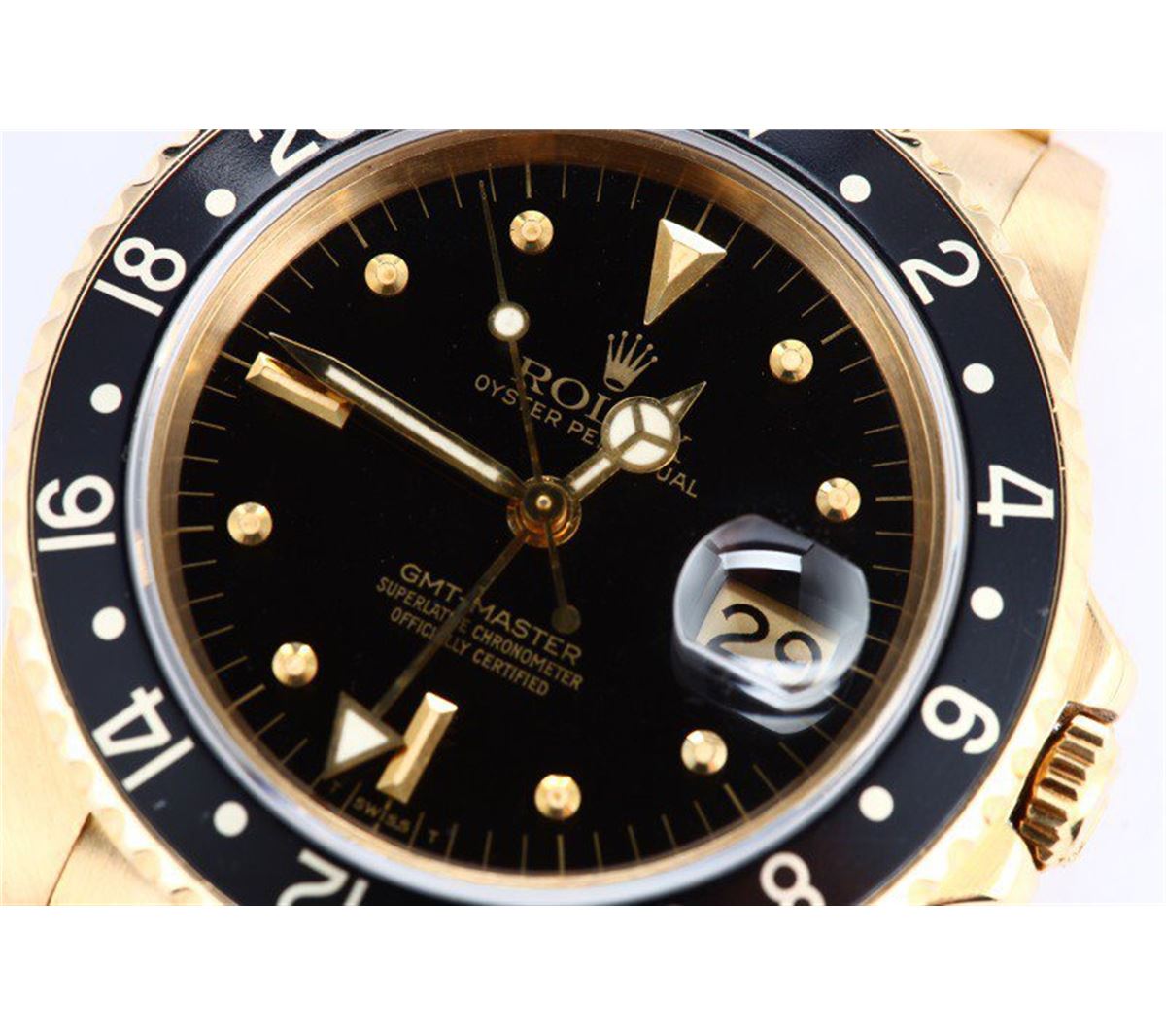 Model/Style-GMT-Master 16758 Serial/Year-Random Features-Automatic movement w/ date, quickset, scratch resistant sapphire crystal, waterproof screw-down crown Case-18k yellow gold (40mm). Case is in excellent condition with sharp beveled edges. Bracelet-Original 18k jubilee bracelet is in excellent condition #9080