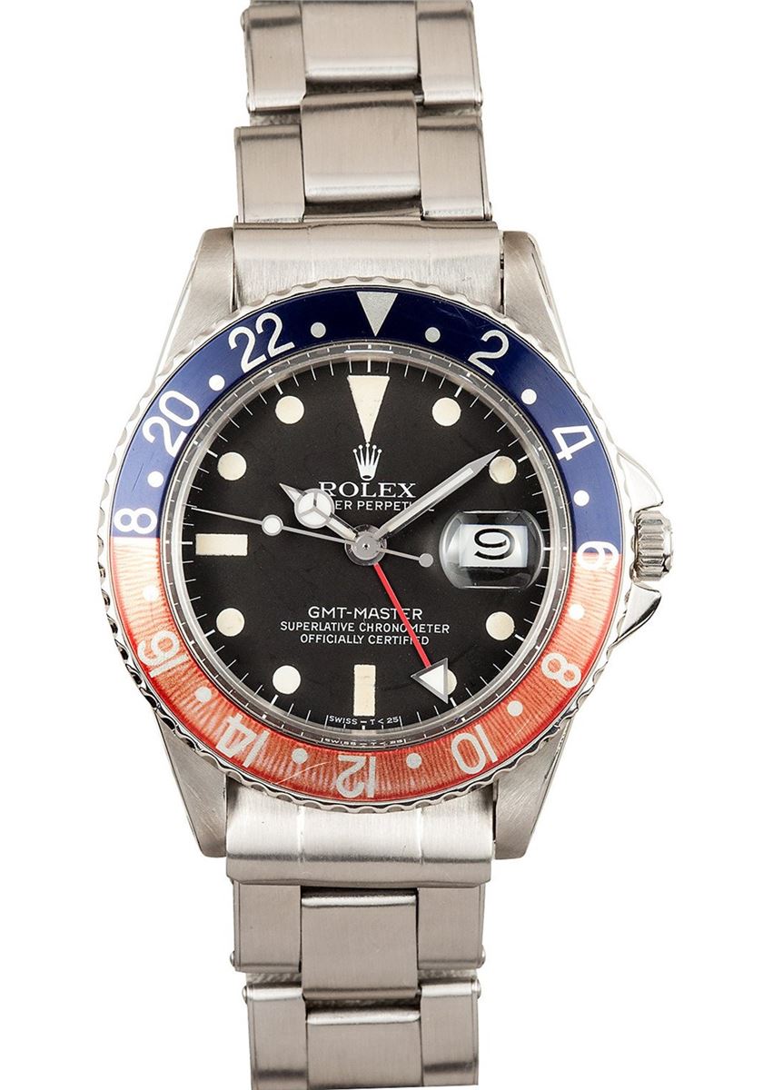 Model/Style-GMT-Master 1675 Serial/Year-Random Features-Automatic movement w/ date, acrylic crystal, screw down waterproof crown, GMT function Case-Stainless steel w/ red and blue (Pepsi) faded bezel insert (40mm), pierced lugs, pointed crown guards Bracelet-Excellent older 7206 Swiss Rivet band with 58 end pieces and 13 links #9119