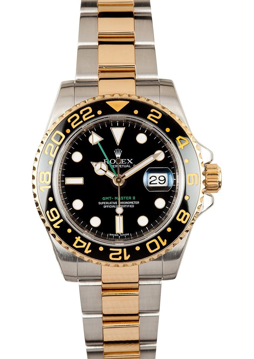 Model/Style-GMT Master II 116713 Serial/Year-Random Features-Automatic GMT movement w/ date and 2nd time zone, Quickset, scratch-resistant sapphire crystal, waterproof, screw-down crown, rotating bi-directional timing bezel Case-Stainless steel w/ 18k yellow gold bezel with scratch-resistant rotatable ceramic bezel (40 mm diameter), inner reflector ring engraved w/ serial number Bracelet-Stainless steel & 18k yellow gold Oysterlock bracelet #9103