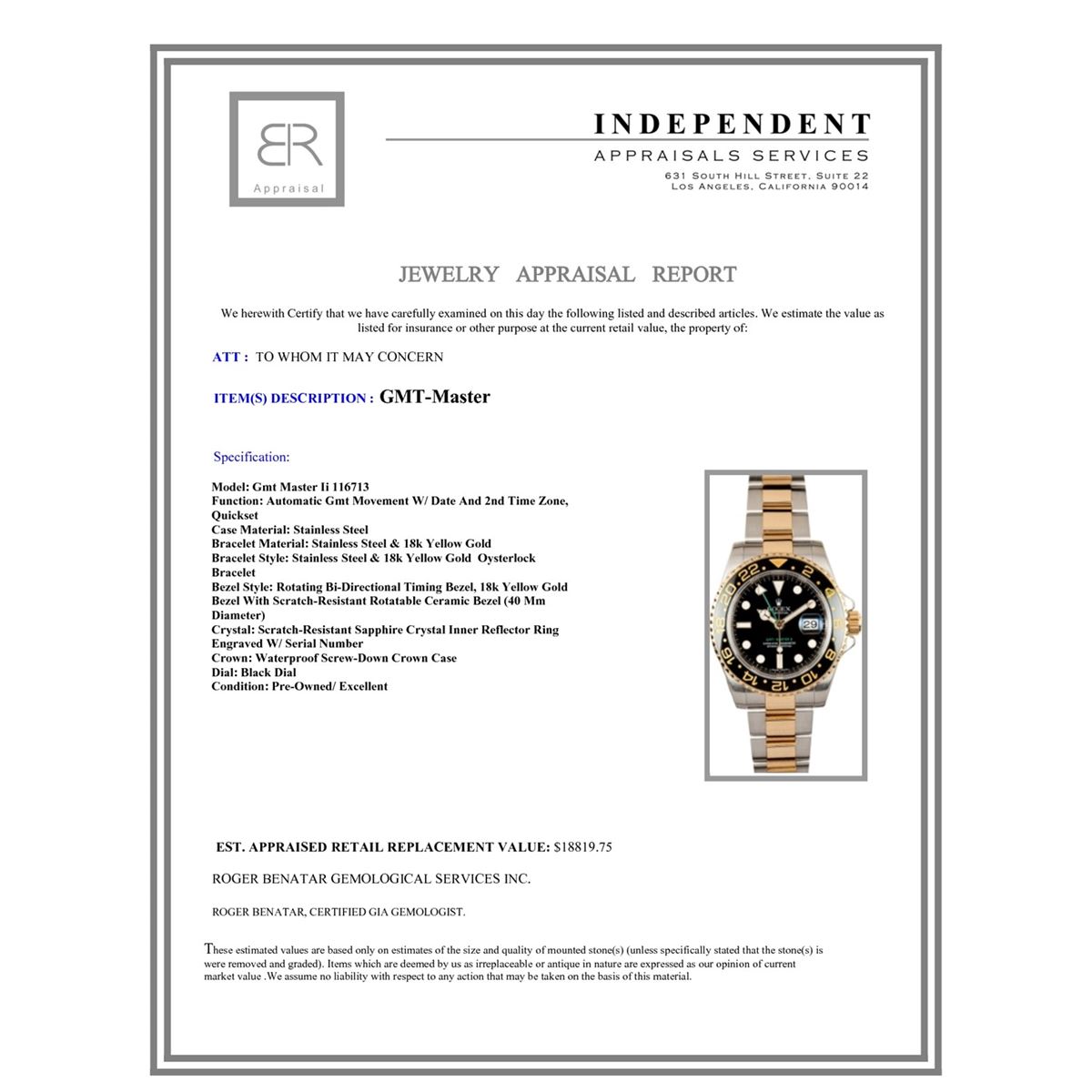 Model/Style-GMT Master II 116713 Serial/Year-Random Features-Automatic GMT movement w/ date and 2nd time zone, Quickset, scratch-resistant sapphire crystal, waterproof, screw-down crown, rotating bi-directional timing bezel Case-Stainless steel w/ 18k yellow gold bezel with scratch-resistant rotatable ceramic bezel (40 mm diameter), inner reflector ring engraved w/ serial number Bracelet-Stainless steel & 18k yellow gold Oysterlock bracelet #9082