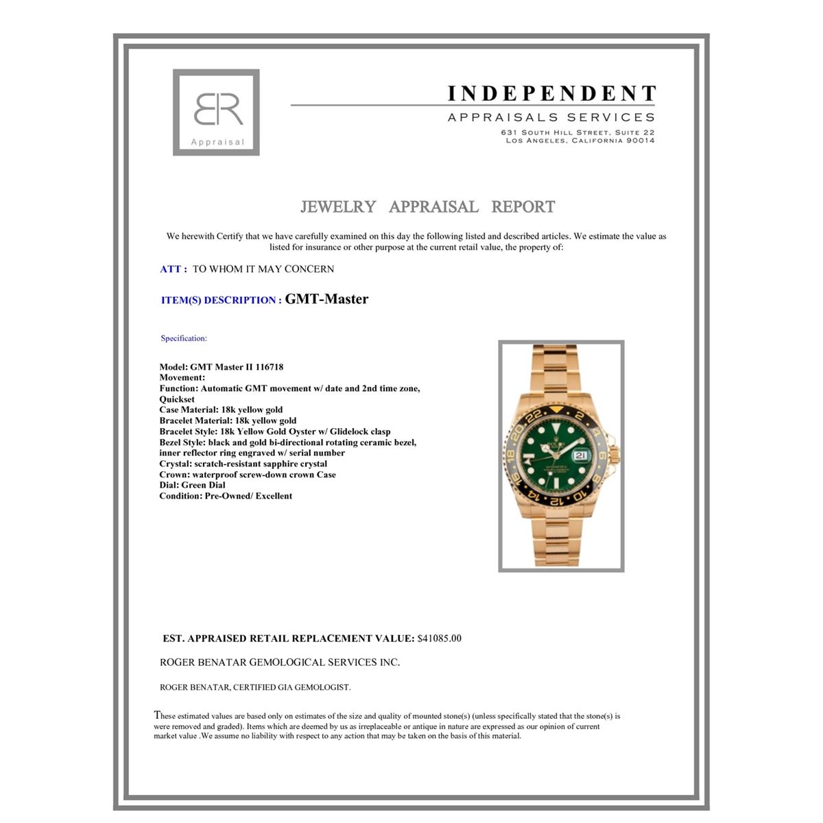 Model/Style-GMT Master II 116718 Serial/Year-Random Features-Automatic GMT movement w/ date and 2nd time zone, Quickset, scratch-resistant sapphire crystal, waterproof screw-down crown Case-18k yellow gold w/ black and gold bi-directional rotating ceramic bezel, inner reflector ring engraved w/ serial number Bracelet-18k Yellow Gold Oyster w/ Glidelock clasp #9098