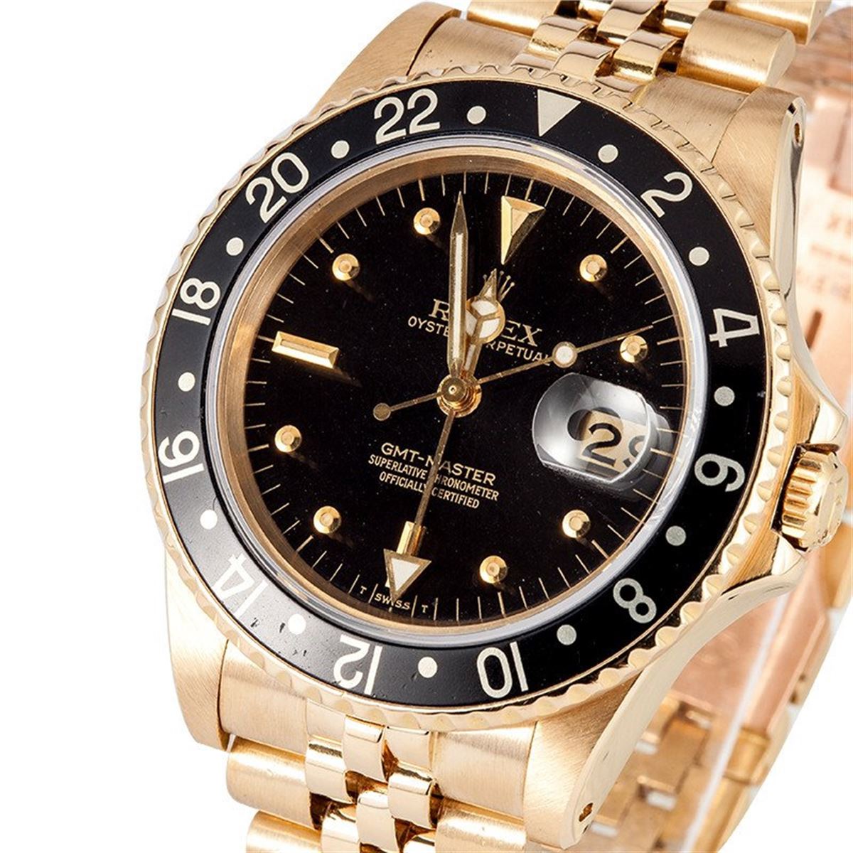 Model/Style-GMT-Master 16758 Serial/Year-Random Features-Automatic movement w/ date, quickset, scratch resistant sapphire crystal, waterproof screw-down crown Case-18k yellow gold (40mm). Case is in excellent condition with sharp beveled edges. Bracelet-Original 18k jubilee bracelet is in excellent condition. #9116