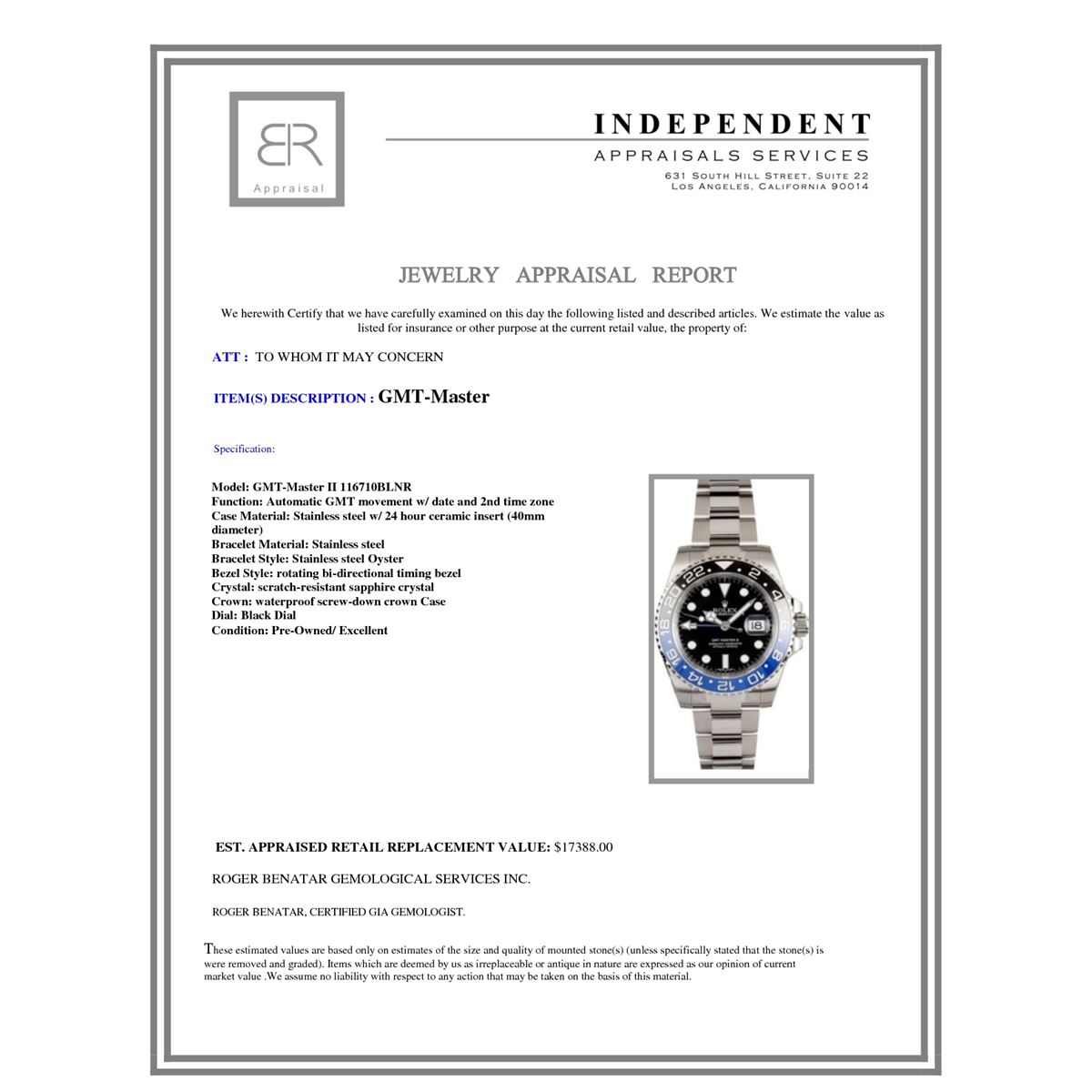 Model/Style-GMT-Master II 116710BLNR Serial/Year-Random Features-Automatic GMT movement w/ date and 2nd time zone, waterproof, screw-down crown, scratch-resistant sapphire crystal, rotating bi-directional timing bezel Case-Stainless steel black & blue bezel w/ 24 hour ceramic insert (40mm diameter) Bracelet-Stainless steel Oyster #9105