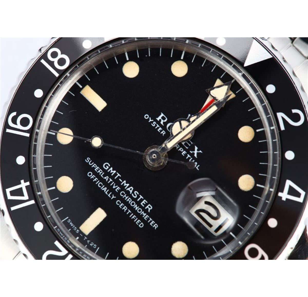 Model/Style-GMT-Master 1675 Serial/Year-Random Features-Automatic 1560 movement w/date, acrylic crystal, waterproof screw down crown, water resistant to 100m/330ft Case-Stainless steel with replacement bezel insert (40mm) Bracelet-Stainless steel Jubilee 62510 w/ 20 links, 555 end links #9123