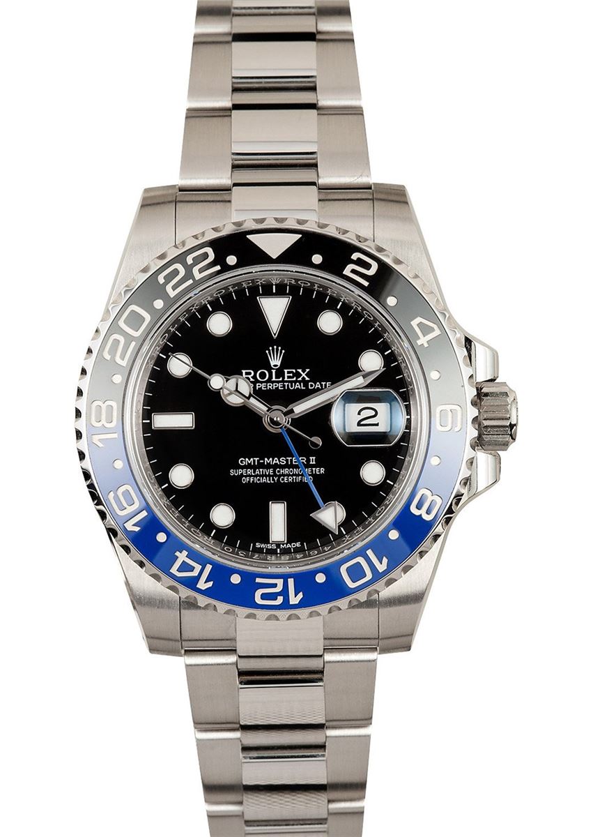 Model/Style-GMT-Master II 116710BLNR Serial/Year-Random Features-Automatic movement w/ date, Quickset, scratch-resistant sapphire crystal, waterproof screw-down crown, rotating bi-directional timing bezel Case-Stainless steel w/ 24 hour ceramic black and blue (Cerachrome) bezel (40mm), inner reflector ring engraved w/ serial number Bracelet-Stainless steel Oyster #9097