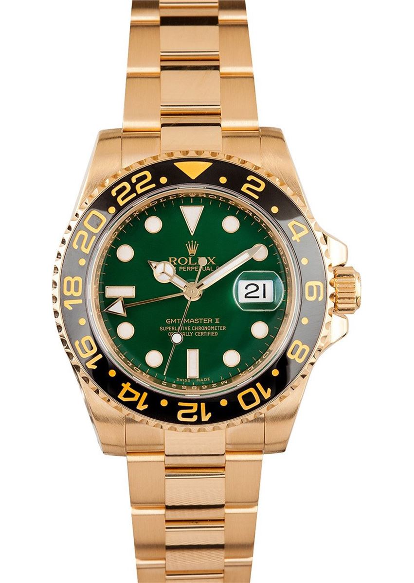 Model/Style-GMT Master II 116718 Serial/Year-Random Features-Automatic GMT movement w/ date and 2nd time zone, Quickset, scratch-resistant sapphire crystal, waterproof screw-down crown Case-18k yellow gold w/ black and gold bi-directional rotating ceramic bezel, inner reflector ring engraved w/ serial number Bracelet-18k Yellow Gold Oyster w/ Glidelock clasp #9077