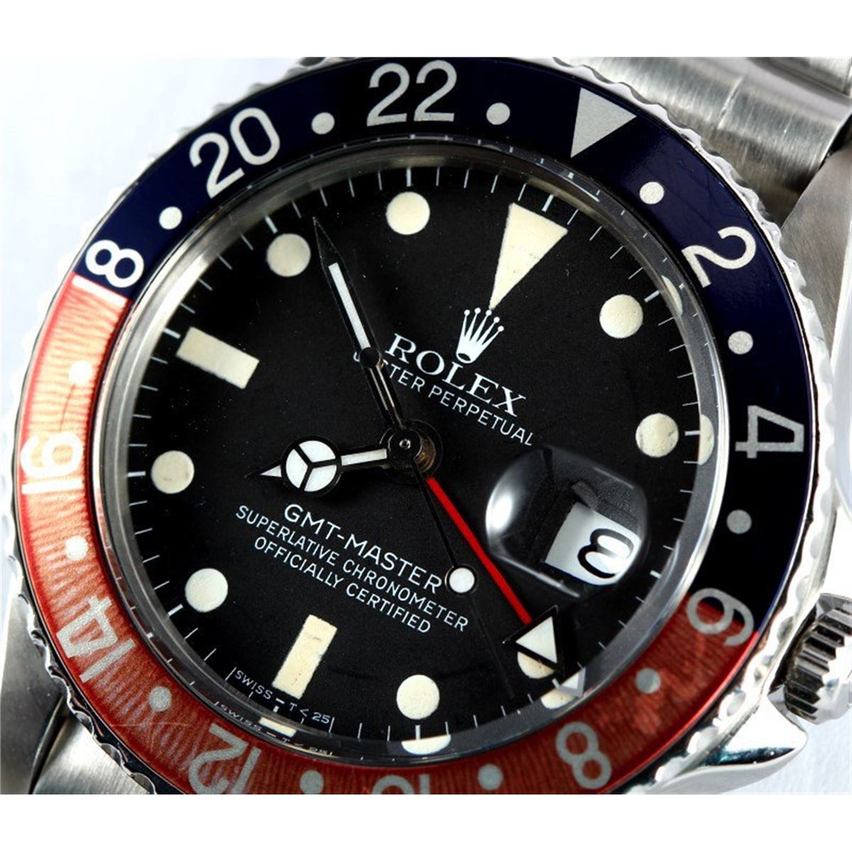 Model/Style-GMT-Master 1675 Serial/Year-Random Features-Automatic movement w/ date, acrylic crystal, screw down waterproof crown, GMT function Case-Stainless steel w/ red and blue (Pepsi) faded bezel insert (40mm), pierced lugs, pointed crown guards Bracelet-Excellent older 7206 Swiss Rivet band with 58 end pieces and 13 links #9119