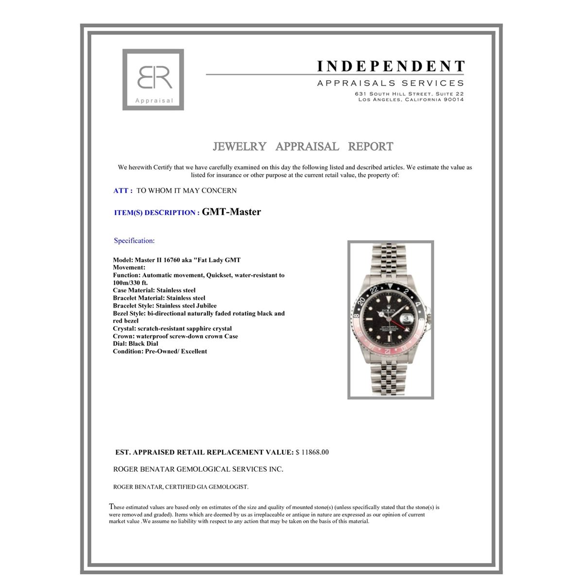 Model/Style-GMT-Master II 16760 aka "Fat Lady GMT Serial/Year-Random Features-Automatic movement, Quickset, scratch-resistant sapphire crystal, waterproof screw-down crown. water-resistant to 100m/330 ft Case-Stainless steel w/ bi-directional naturally faded rotating black and red bezel also known as "coke bezel" (40mm) Bracelet-Stainless steel Jubilee #9094
