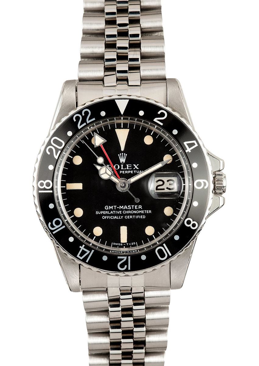 Model/Style-GMT-Master 1675 Serial/Year-Random Features-Automatic 1560 movement w/date, acrylic crystal, waterproof screw down crown, water resistant to 100m/330ft Case-Stainless steel with replacement bezel insert (40mm) Bracelet-Stainless steel Jubilee 62510 w/ 20 links, 555 end links #9123