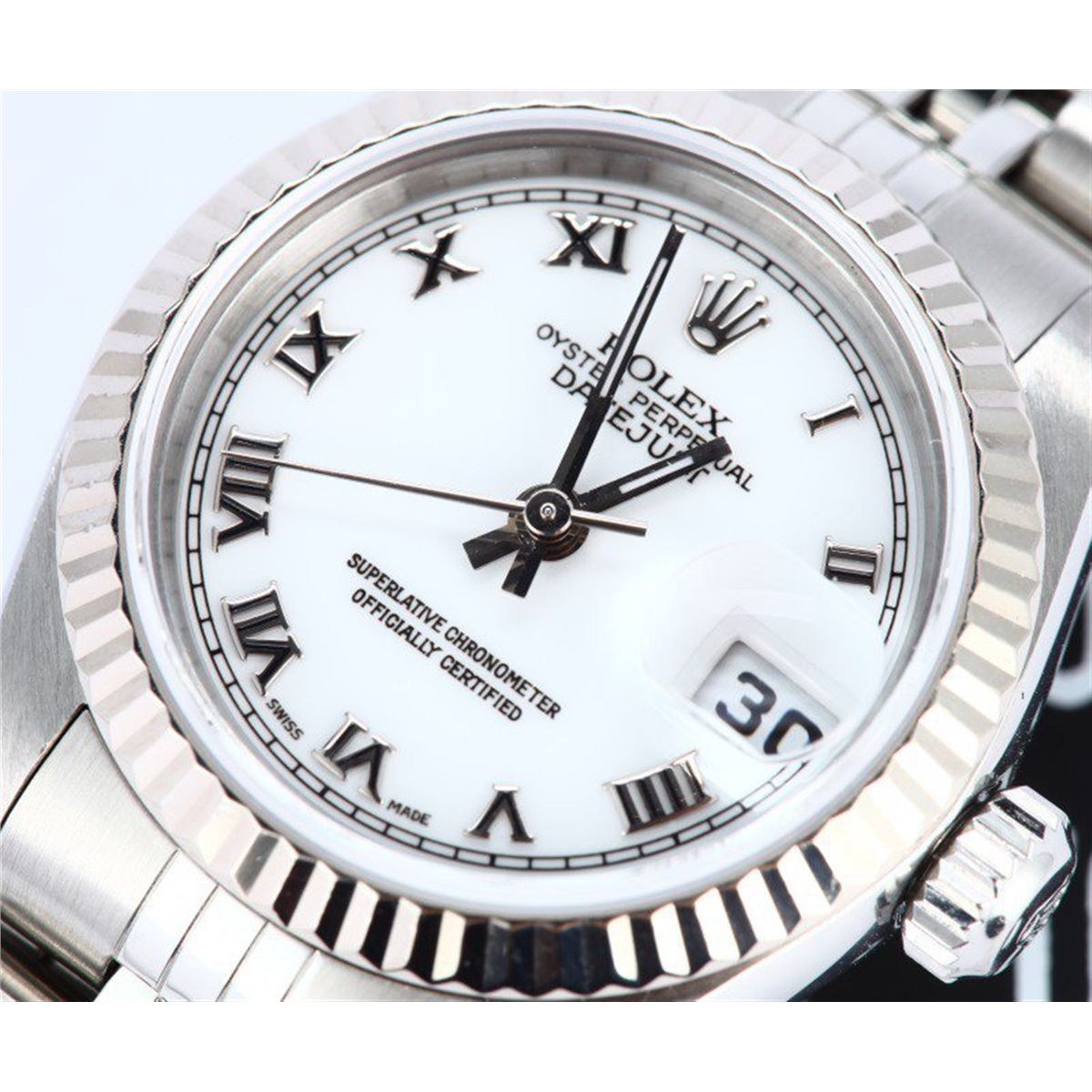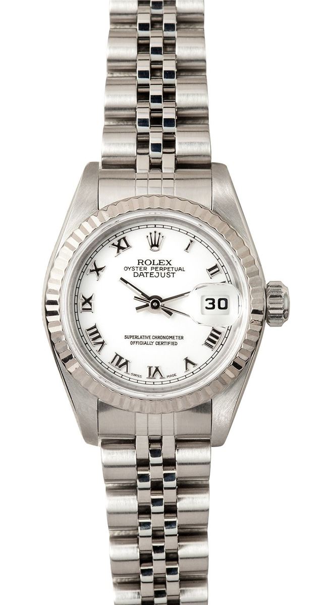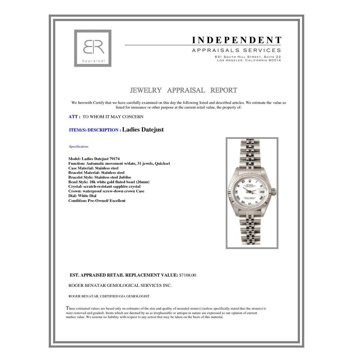 Model/Style-Ladies Datejust 79174 Serial/Year-Random Features-Automatic movement w/ date, 31 jewels, Quickset, scratch-resistant sapphire crystal, waterproof screw-down crown Case-Stainless steel w/ 18k white gold fluted bezel (26mm) Bracelet-Stainless steel Jubilee #9146