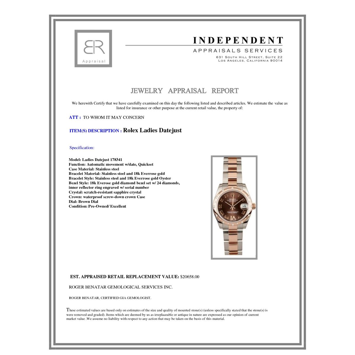 Model/Style-Ladies Datejust 178341 Serial/Year-Random Features-Automatic movement w/ date, Quickset, scratch-resistant sapphire crystal, waterproof screw-down crown Case-Stainless steel w/ 18k Everose gold diamond bezel set w/ 24 diamonds, inner reflector ring engraved w/ serial number Bracelet-Stainless steel and 18k Everrose gold Oyster #9132