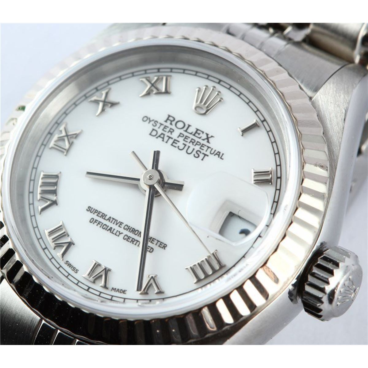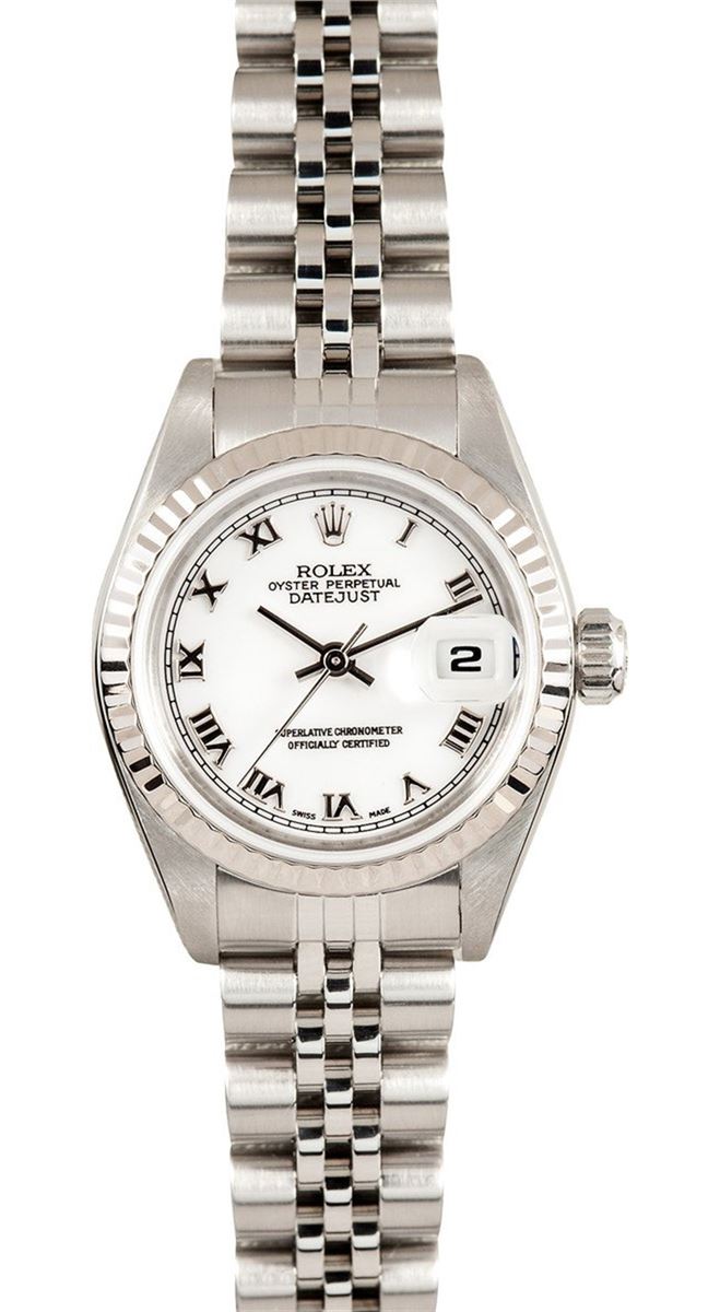 Model/Style-Ladies Datejust 79174 Serial/Year-Random Features-Automatic movement w/ date, scratch-resistant sapphire crystal, waterproof screw-down crown Case-Stainless steel w/ 18k white gold fluted bezel (26mm) Bracelet-Stainless steel Jubilee #9148