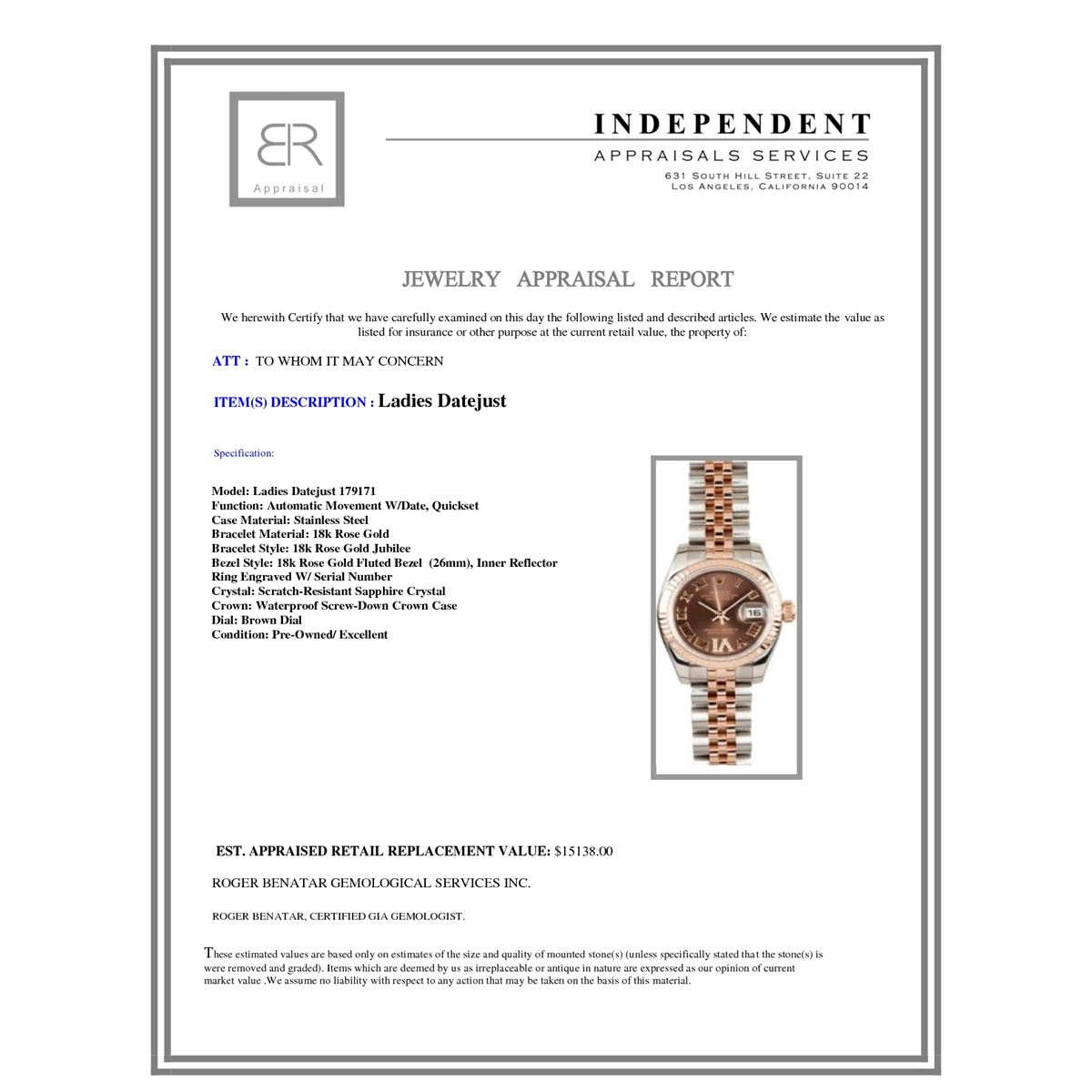 Model/Style-Ladies Datejust 179171 Serial/Year-Random Features-Automatic movement w/ date, Quickset, scratch-resistant sapphire crystal, waterproof screw-down crown Case-Stainless steel w/ 18k rose gold fluted bezel (26mm), inner reflector ring engraved w/ serial number Bracelet-Stainless steel and 18k rose gold Jubilee #9133